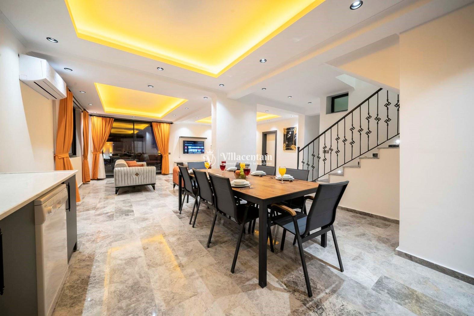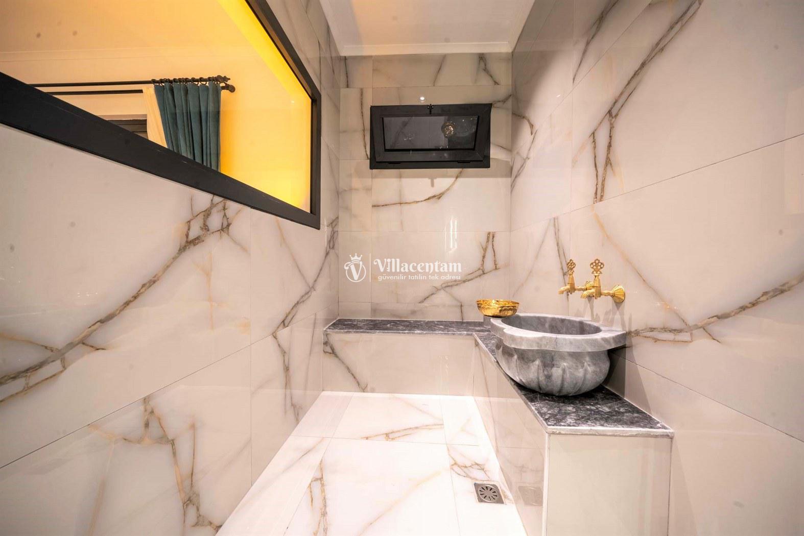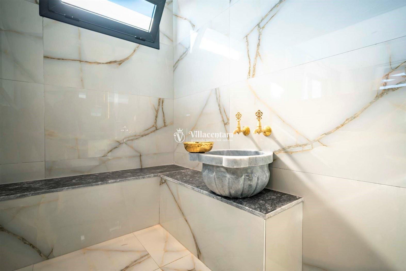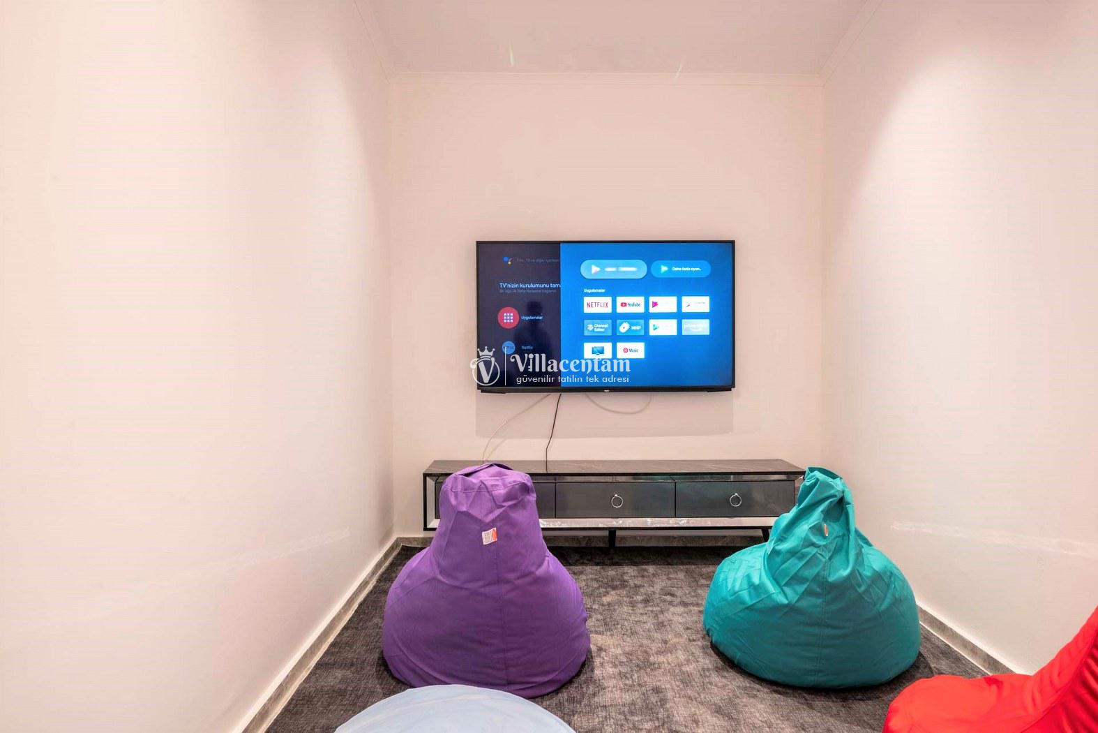 Modern ve ferah iç mekânlara sahip villada; tam donanımlı mutfak, geniş salon ve konforlu yaşam alanları bulunmaktadır. Sinema odası, spor alanı, sauna, hamam ve jakuzi gibi özel olanaklar sayesinde tatil boyunca konforunuz üst seviyede tutulur.