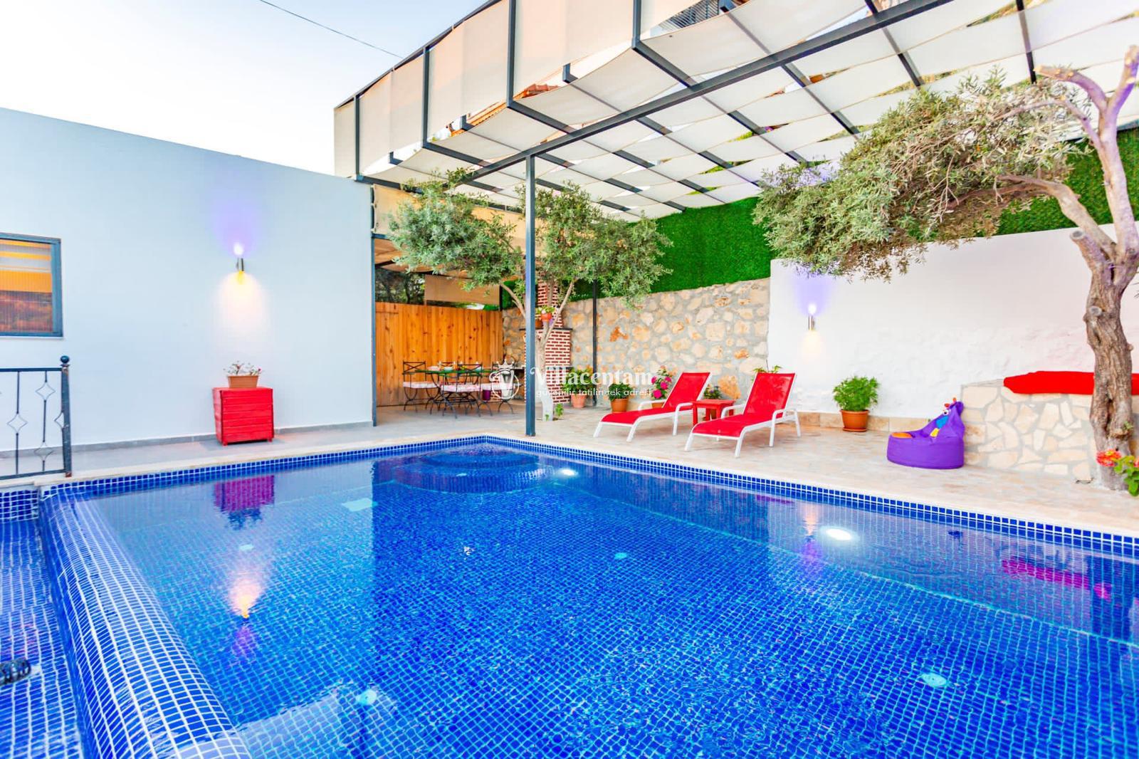 Şezlong alanı, oturma grubu ve barbekü imkanı bulunan geniş havuz terası ile Villa Odakhan, sevdiklerinizle birlikte unutulmaz bir villa tatili yaşamanız için sizleri bekliyor.