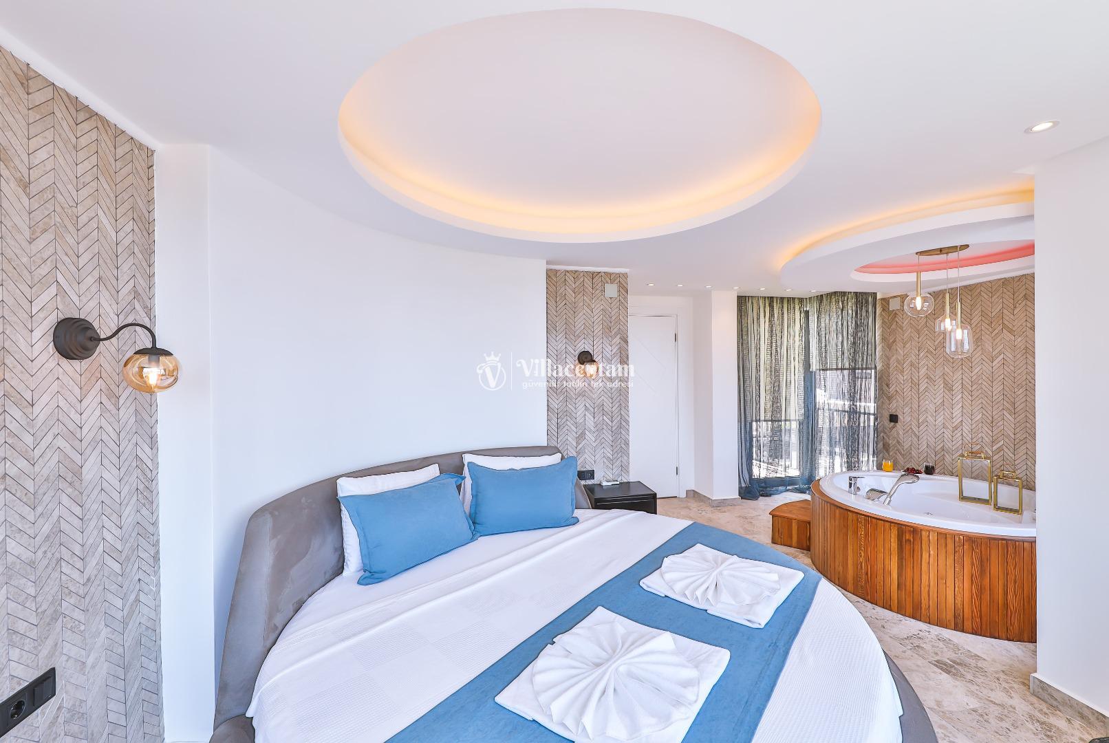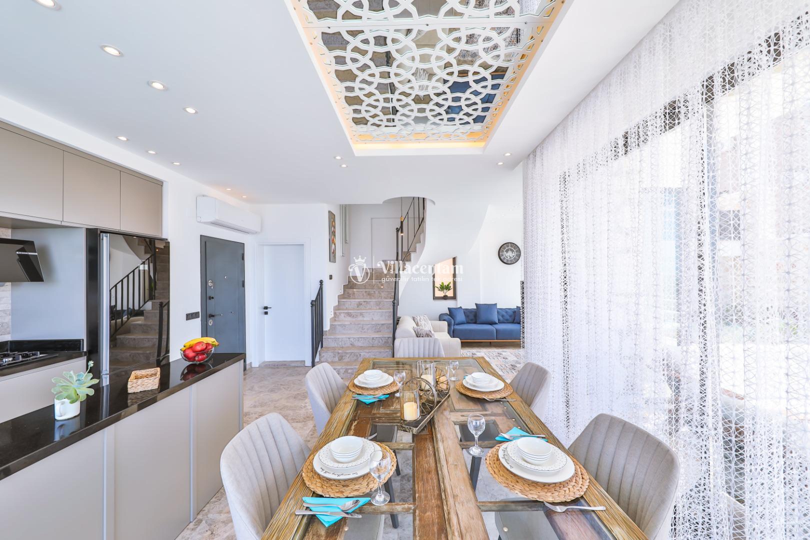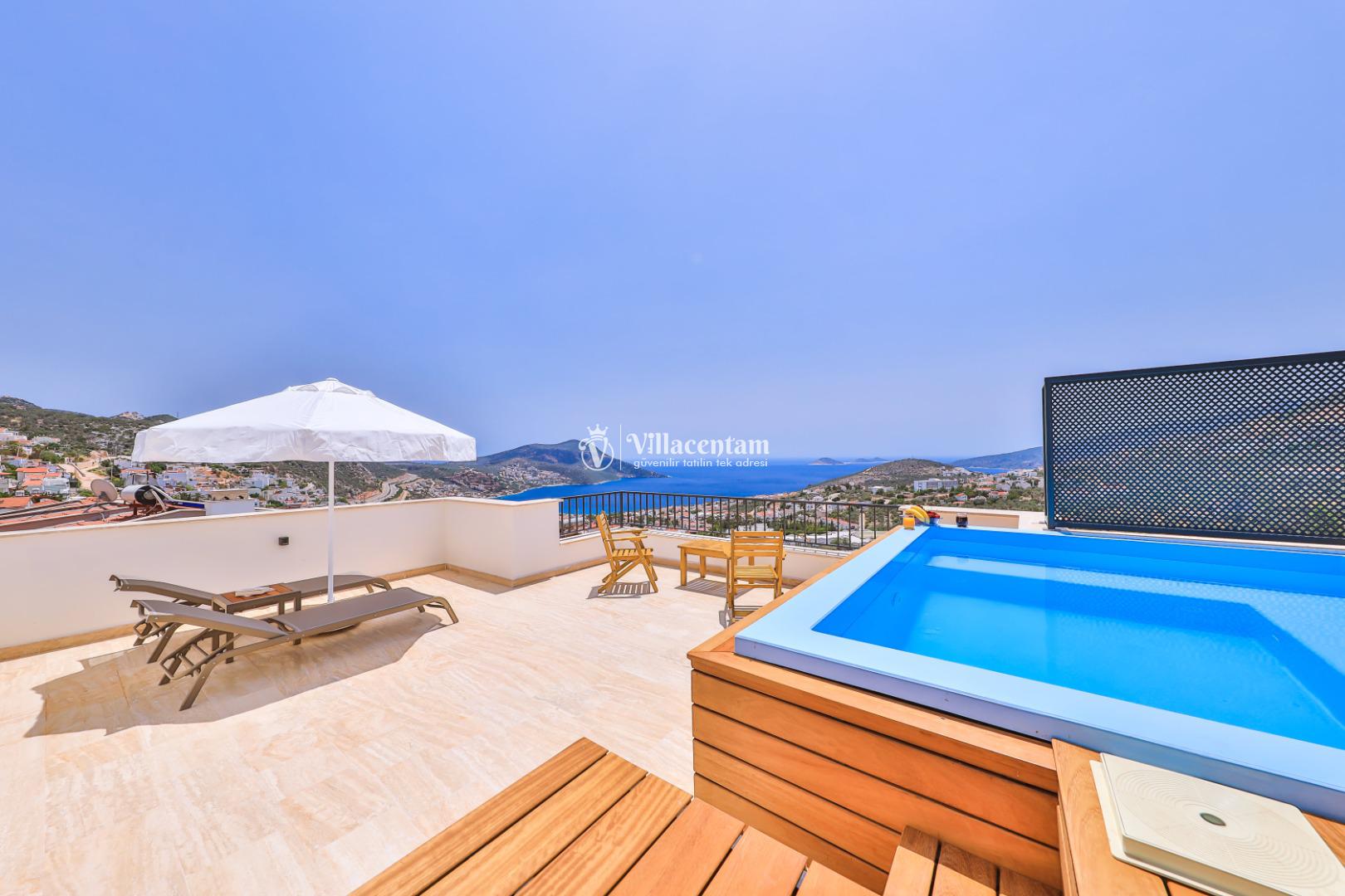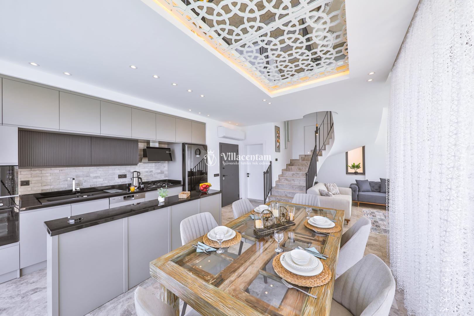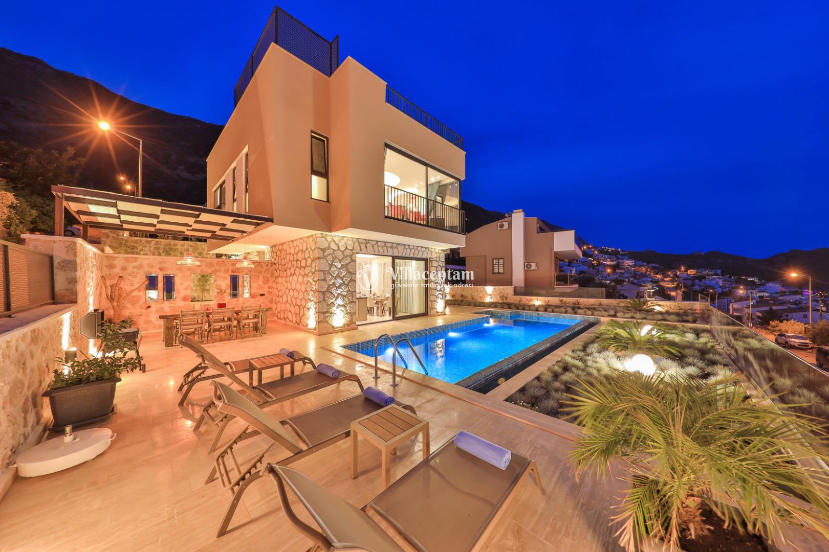 Villa Öykünün Evi, Kalkan Kızıltaş mevkiinde konumlanmakta olan 4 kişi konaklama kapasitesine sahip eşsiz deniz manzarası, merkezi konumu ve lüks detaylarıyla öne çıkan bu özel villa; konforlu, keyifli ve ayrıcalıklı bir tatil deneyimi arayan misafirler için özenle tasarlanmıştır. Dört kişilik konaklama kapasitesine sahip olan villa, hem aileler hem de arkadaş grupları için ideal bir seçenek sunarken, merkeze yakın konumu sayesinde tatil boyunca ulaşım kolaylığı ve zaman tasarrufu sağlamaktadır. Villanın en dikkat çekici özelliklerinden biri, çift jakuzili yapısıdır. Villada bulunan iki ayrı jakuzi, misafirlerine farklı alanlarda eşsiz bir rahatlama deneyimi sunar. Teras katında yer alan jakuzi, panoramik deniz manzarasına karşı konumlandırılmış olup gün batımında benzersiz bir atmosfer oluşturur. Deniz manzarası eşliğinde, açık havada jakuzinin keyfini çıkarabilir; sevdiklerinizle unutulmaz anlar yaşayabilirsiniz. Diğer jakuzi ise daha korunaklı bir alanda yer almakta olup günün her saatinde konforlu ve huzurlu bir kullanım imkânı sunmaktadır. Modern mimarisi ve şık dekorasyonu ile dikkat çeken villa, ferah yaşam alanlarıyla rahat bir konaklama imkânı sağlar. Geniş cam yüzeyler sayesinde deniz manzarası villanın her köşesinde hissedilirken, doğal ışıkla aydınlanan iç mekânlar ferah ve aydınlık bir atmosfer sunar. Konforlu oturma alanı, tam donanımlı mutfak ve özenle seçilmiş mobilyalar, tatil süresince evinizdeki rahatlığı yaşamanıza olanak tanır. Villanın yatak odaları, dinlendirici yapısı ve şık tasarımıyla konforlu bir uyku deneyimi sunar. Deniz manzarasına açılan odalarda güne keyifle başlayabilir, tatiliniz boyunca huzur dolu anlar yaşayabilirsiniz. Villanın planlamasında hem ortak alanlar hem de özel alanlar misafirlerin rahatlığı düşünülerek titizlikle tasarlanmıştır.