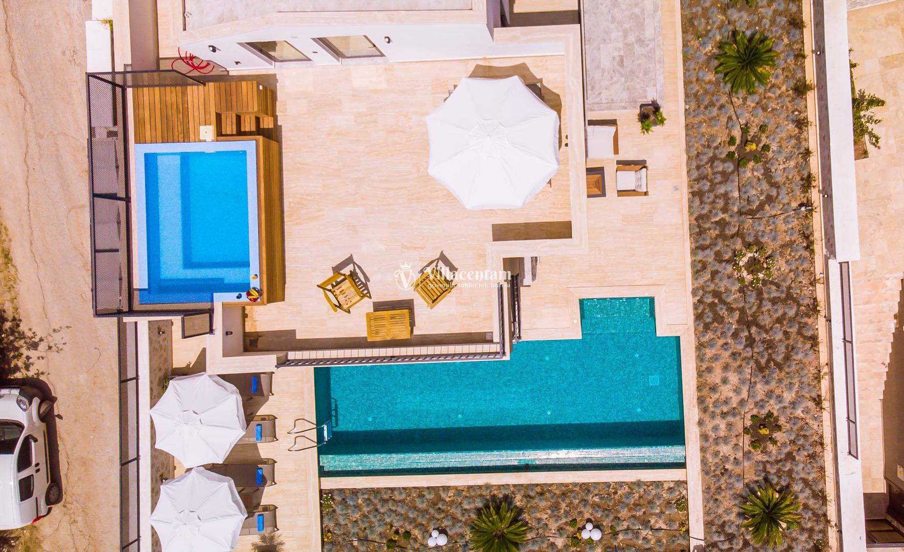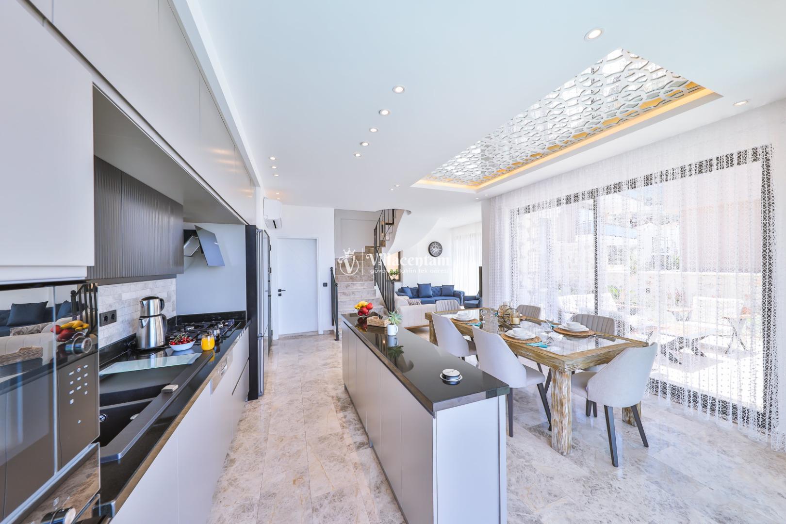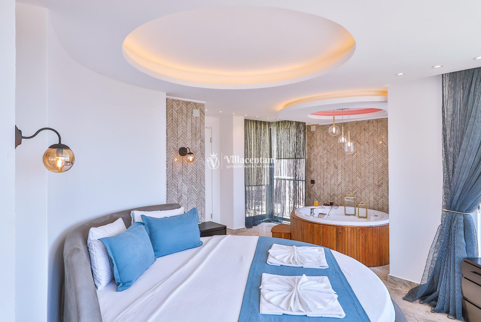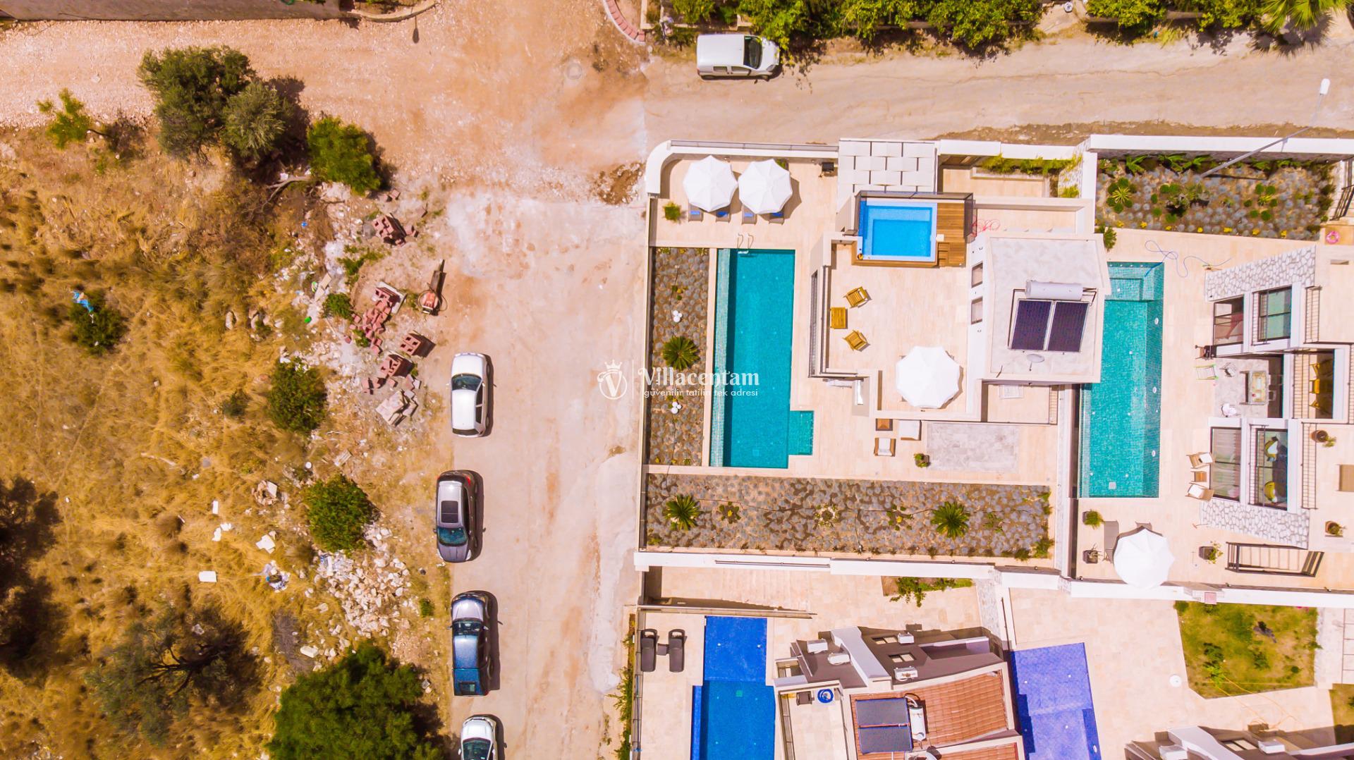 Villa Öykünün Evi, Kalkan Kızıltaş mevkiinde konumlanmakta olan 4 kişi konaklama kapasitesine sahip eşsiz deniz manzarası, merkezi konumu ve lüks detaylarıyla öne çıkan bu özel villa; konforlu, keyifli ve ayrıcalıklı bir tatil deneyimi arayan misafirler için özenle tasarlanmıştır. Dört kişilik konaklama kapasitesine sahip olan villa, hem aileler hem de arkadaş grupları için ideal bir seçenek sunarken, merkeze yakın konumu sayesinde tatil boyunca ulaşım kolaylığı ve zaman tasarrufu sağlamaktadır. Villanın en dikkat çekici özelliklerinden biri, çift jakuzili yapısıdır. Villada bulunan iki ayrı jakuzi, misafirlerine farklı alanlarda eşsiz bir rahatlama deneyimi sunar. Teras katında yer alan jakuzi, panoramik deniz manzarasına karşı konumlandırılmış olup gün batımında benzersiz bir atmosfer oluşturur. Deniz manzarası eşliğinde, açık havada jakuzinin keyfini çıkarabilir; sevdiklerinizle unutulmaz anlar yaşayabilirsiniz. Diğer jakuzi ise daha korunaklı bir alanda yer almakta olup günün her saatinde konforlu ve huzurlu bir kullanım imkânı sunmaktadır. Modern mimarisi ve şık dekorasyonu ile dikkat çeken villa, ferah yaşam alanlarıyla rahat bir konaklama imkânı sağlar. Geniş cam yüzeyler sayesinde deniz manzarası villanın her köşesinde hissedilirken, doğal ışıkla aydınlanan iç mekânlar ferah ve aydınlık bir atmosfer sunar. Konforlu oturma alanı, tam donanımlı mutfak ve özenle seçilmiş mobilyalar, tatil süresince evinizdeki rahatlığı yaşamanıza olanak tanır. Villanın yatak odaları, dinlendirici yapısı ve şık tasarımıyla konforlu bir uyku deneyimi sunar. Deniz manzarasına açılan odalarda güne keyifle başlayabilir, tatiliniz boyunca huzur dolu anlar yaşayabilirsiniz. Villanın planlamasında hem ortak alanlar hem de özel alanlar misafirlerin rahatlığı düşünülerek titizlikle tasarlanmıştır.