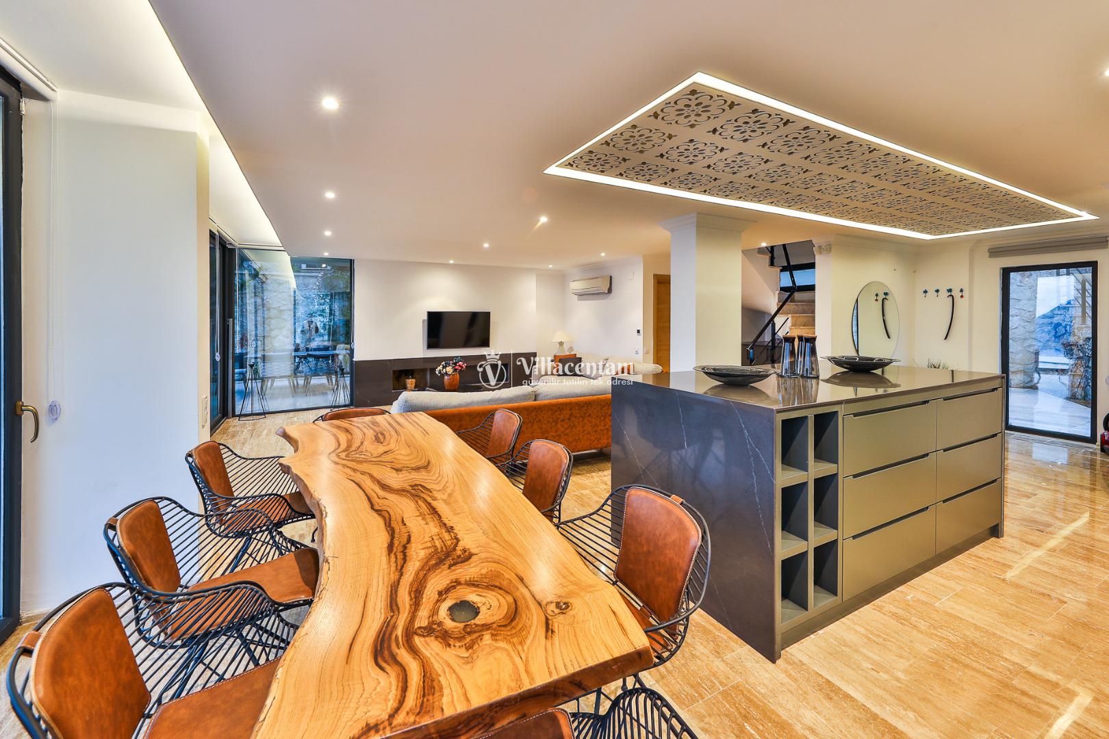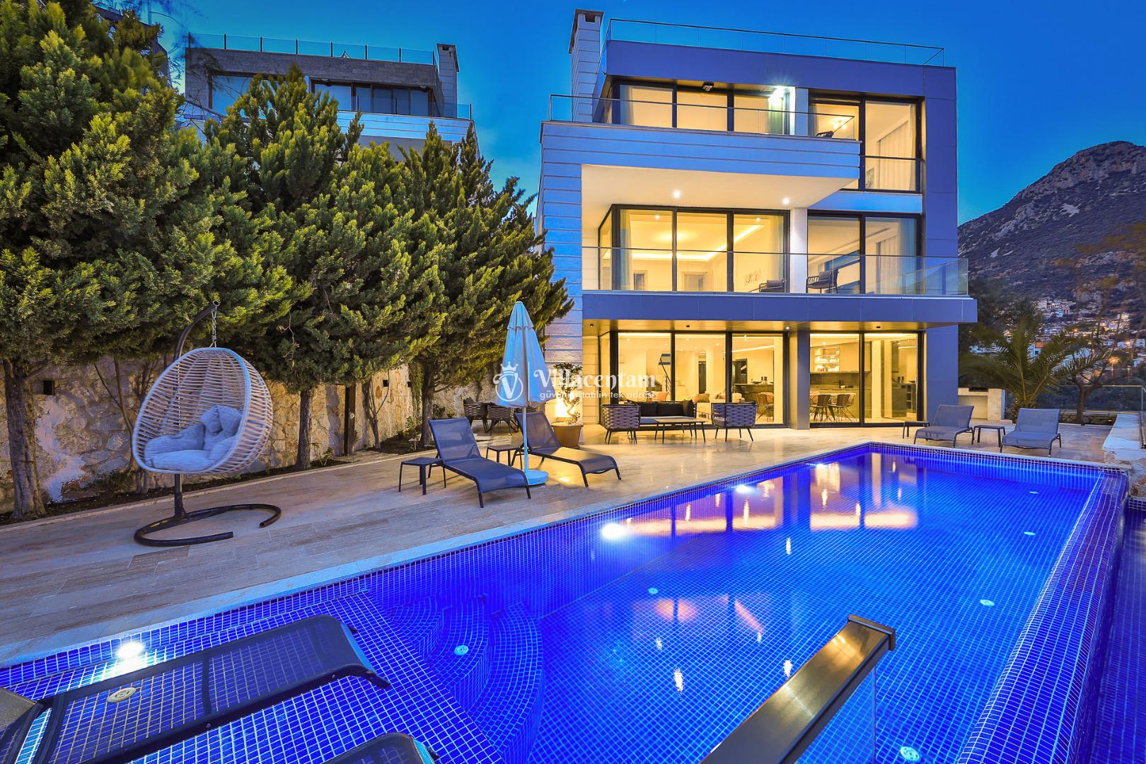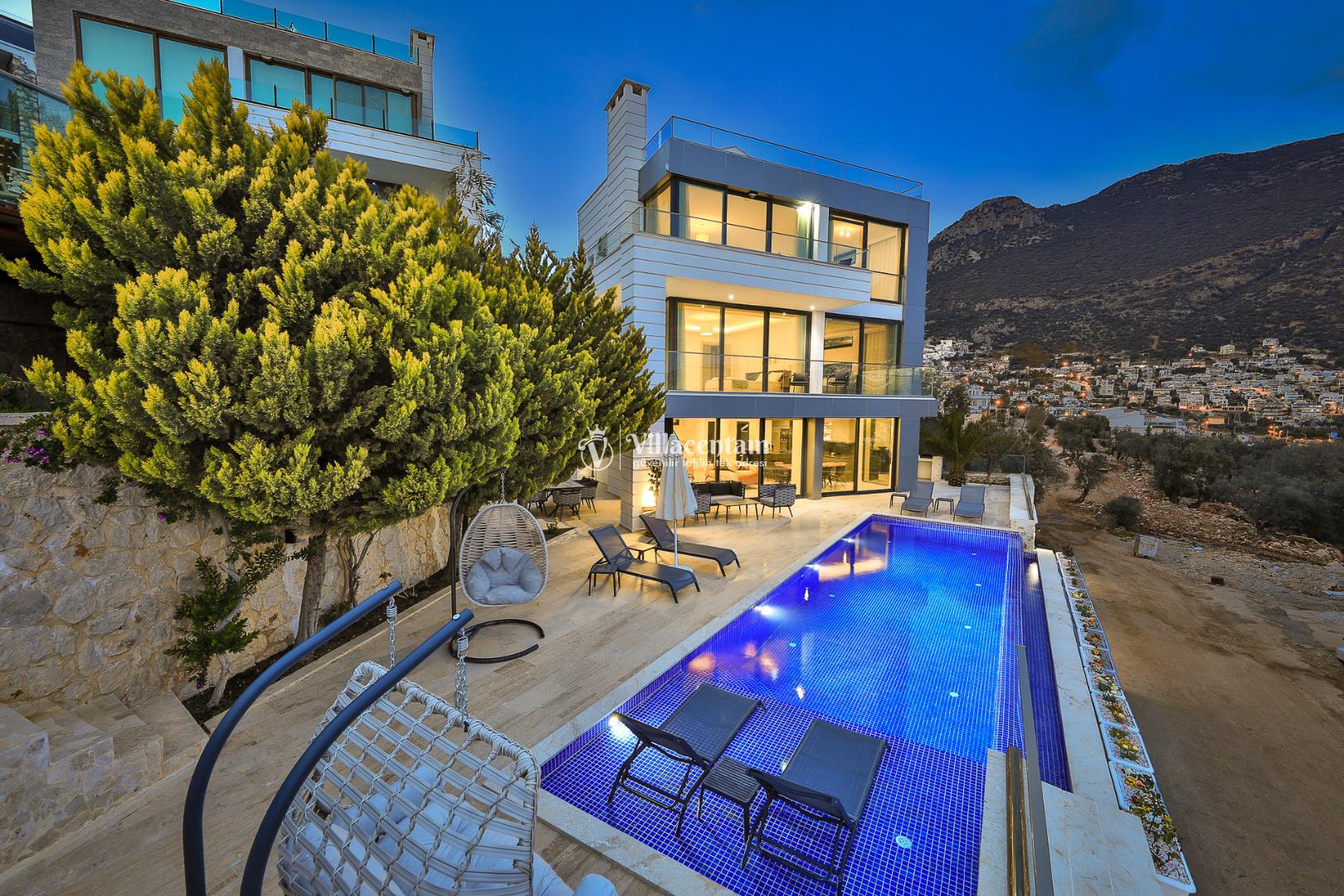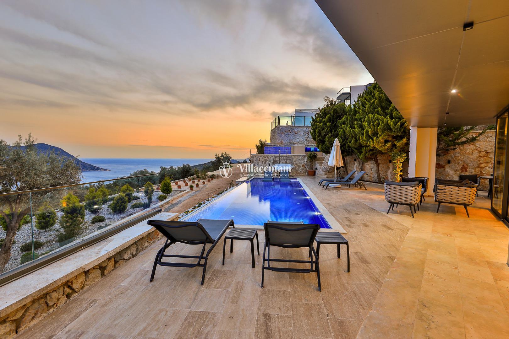Dışarıda, panoramik manzaraya bakan özel yüzme havuzu (infinity tarzı) ve geniş teras alanı tatilinizi unutulmaz kılar. Havuz terası, şezlonglar, oturma grupları ve barbekü alanıyla yaz boyunca dinlenmek ve eğlenmek için ideal bir mekân sunar.