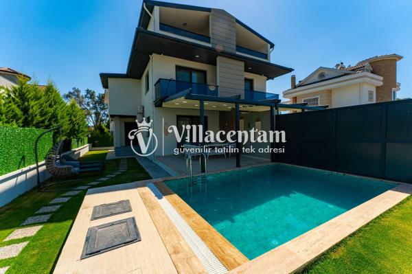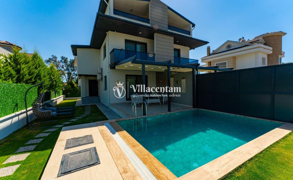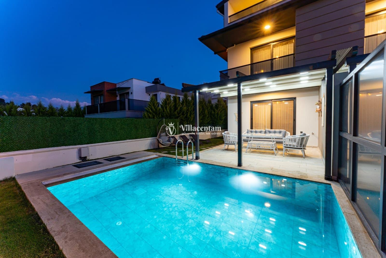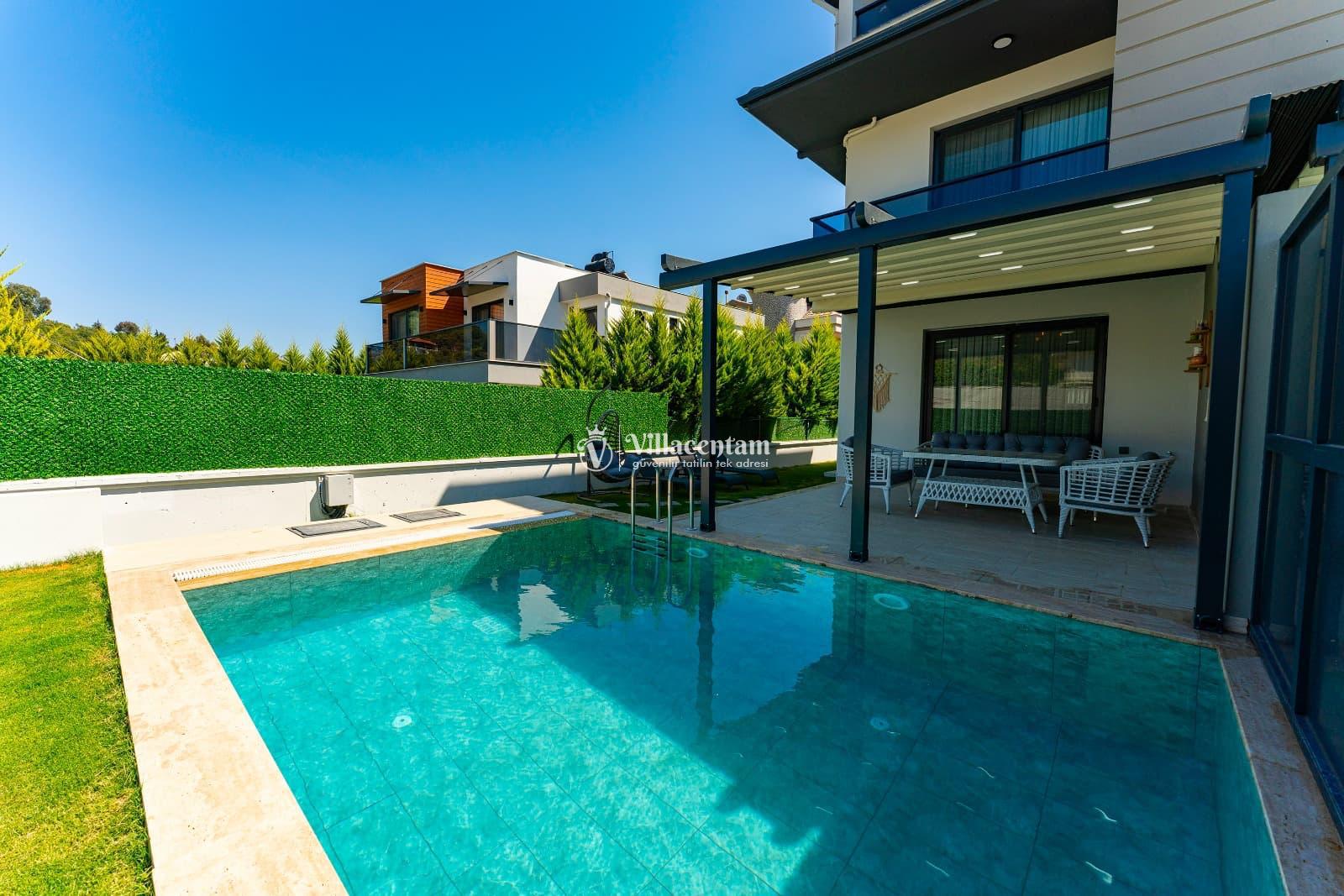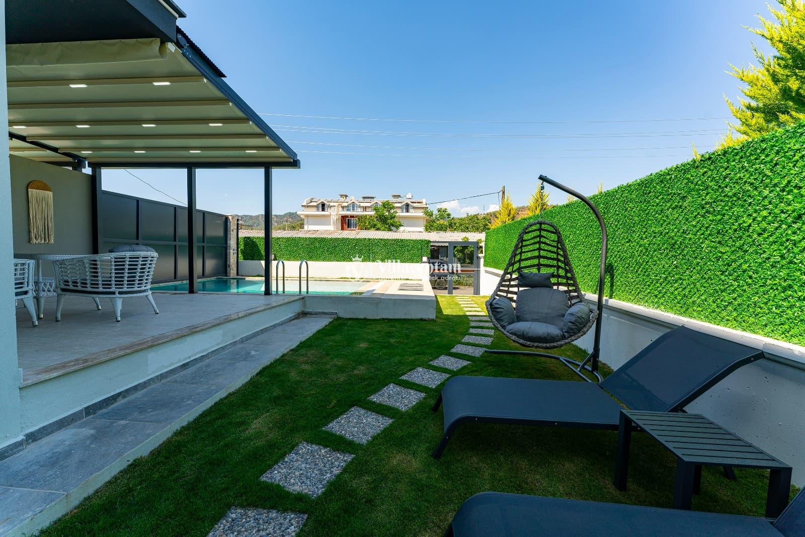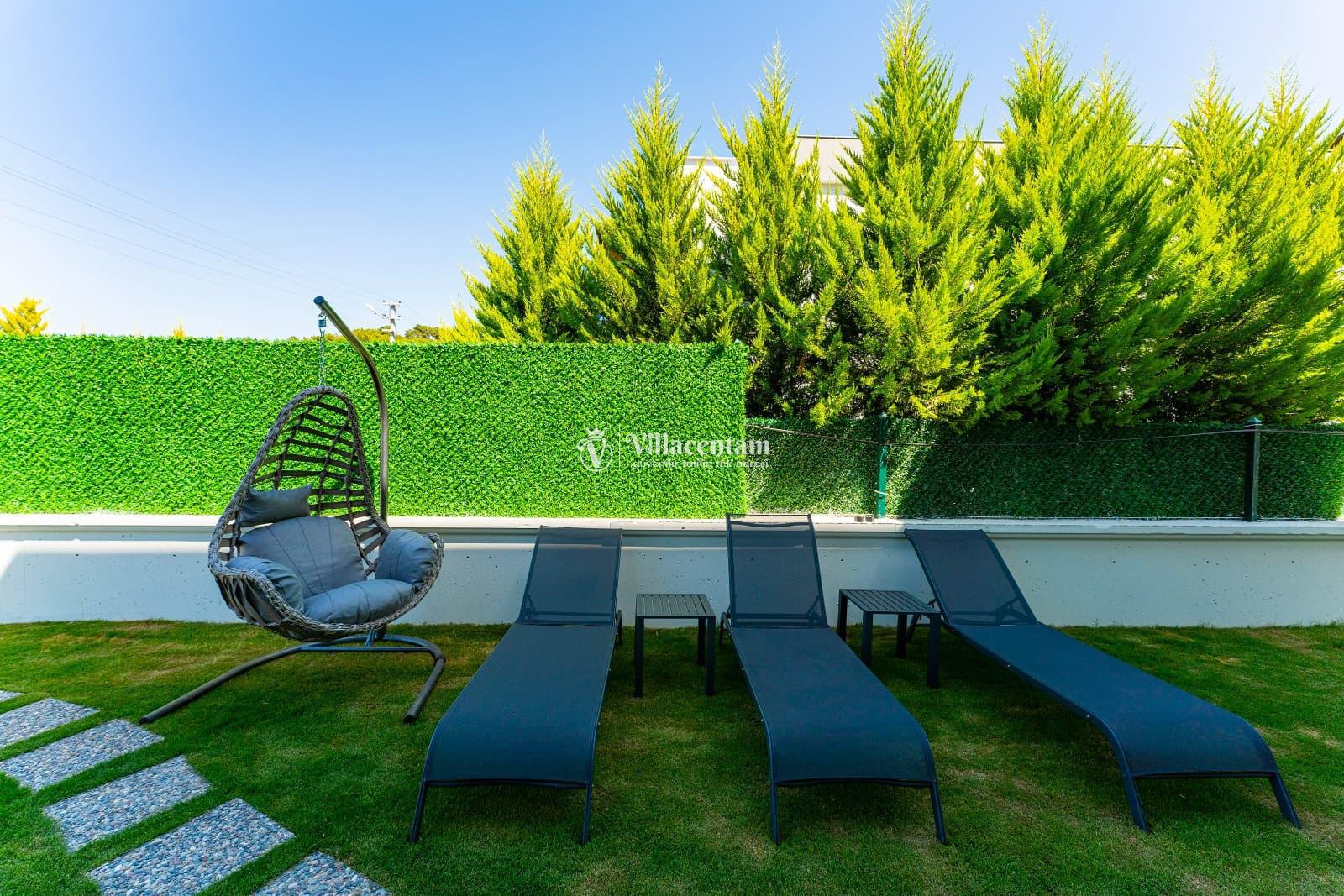 Dışarıda bulunan özel yüzme havuzu ve geniş havuz terası, gün boyu serinleme ve dinlenme imkanı sağlar. Bahçedeki şezlonglar, oturma köşeleri ve barbekü alanı ile açık havada keyifli vakit geçirebilirsiniz.