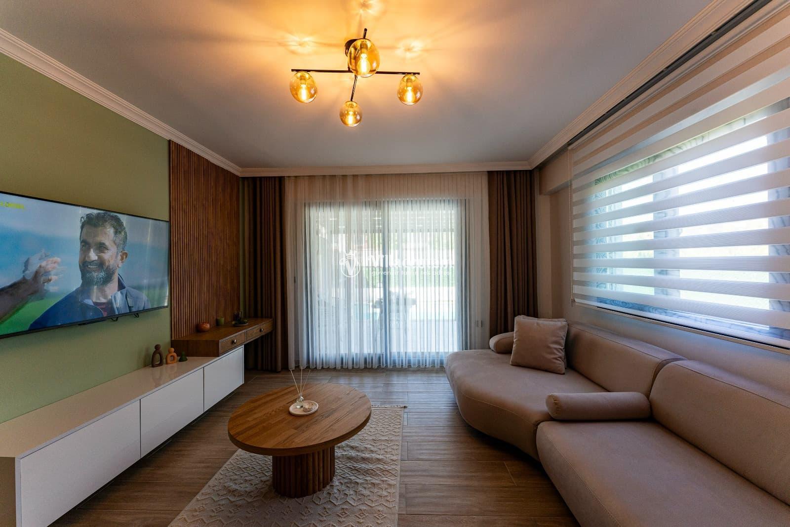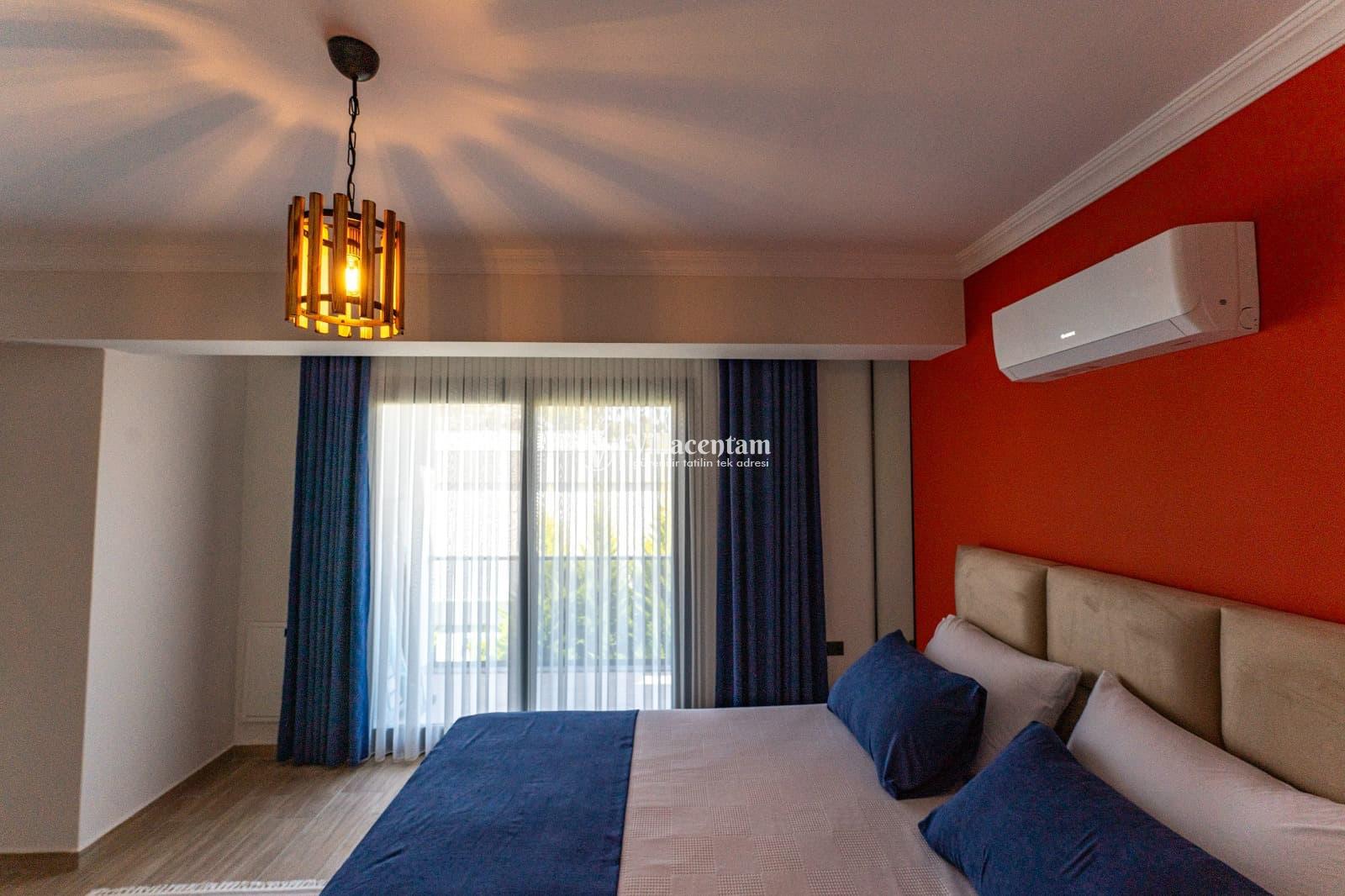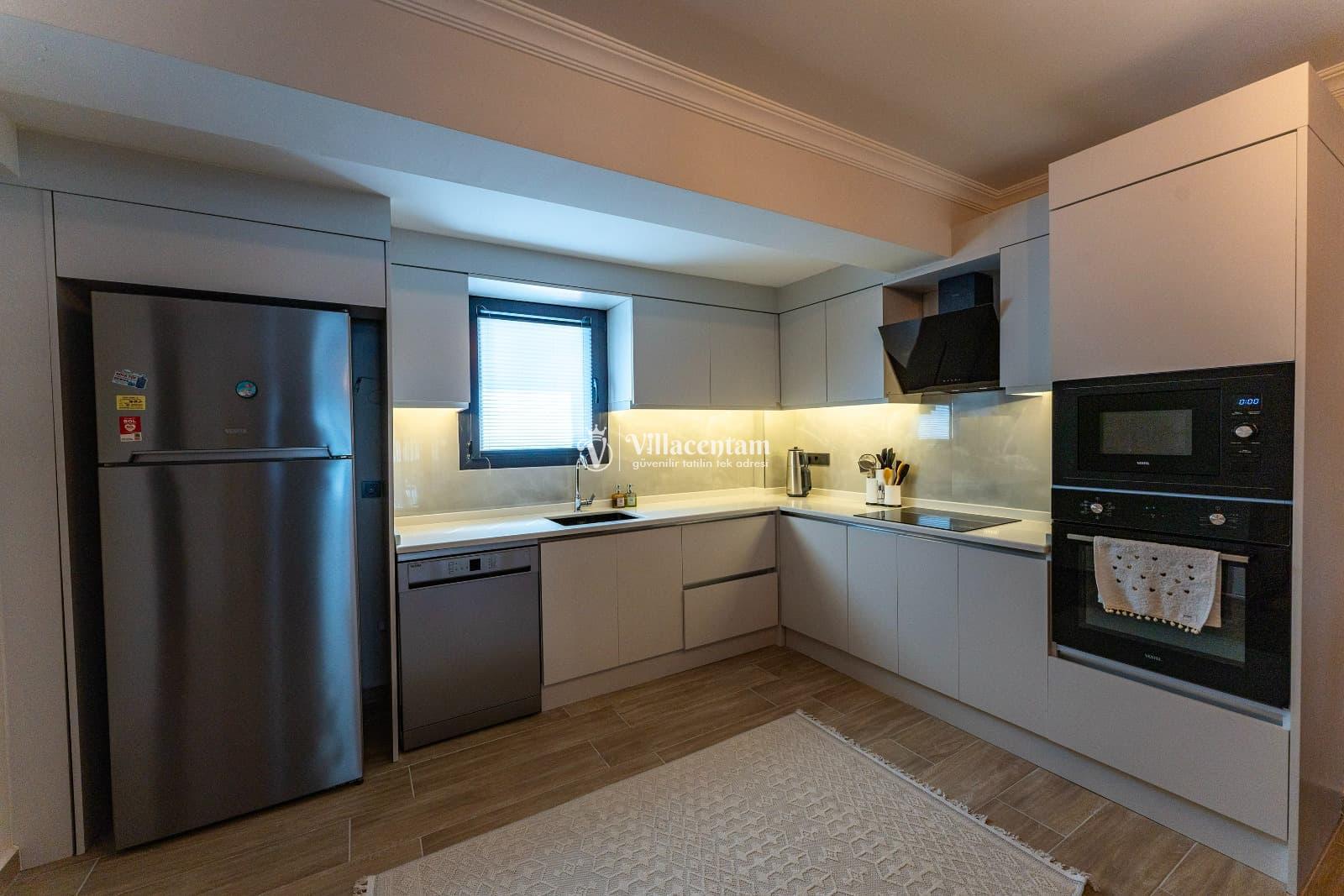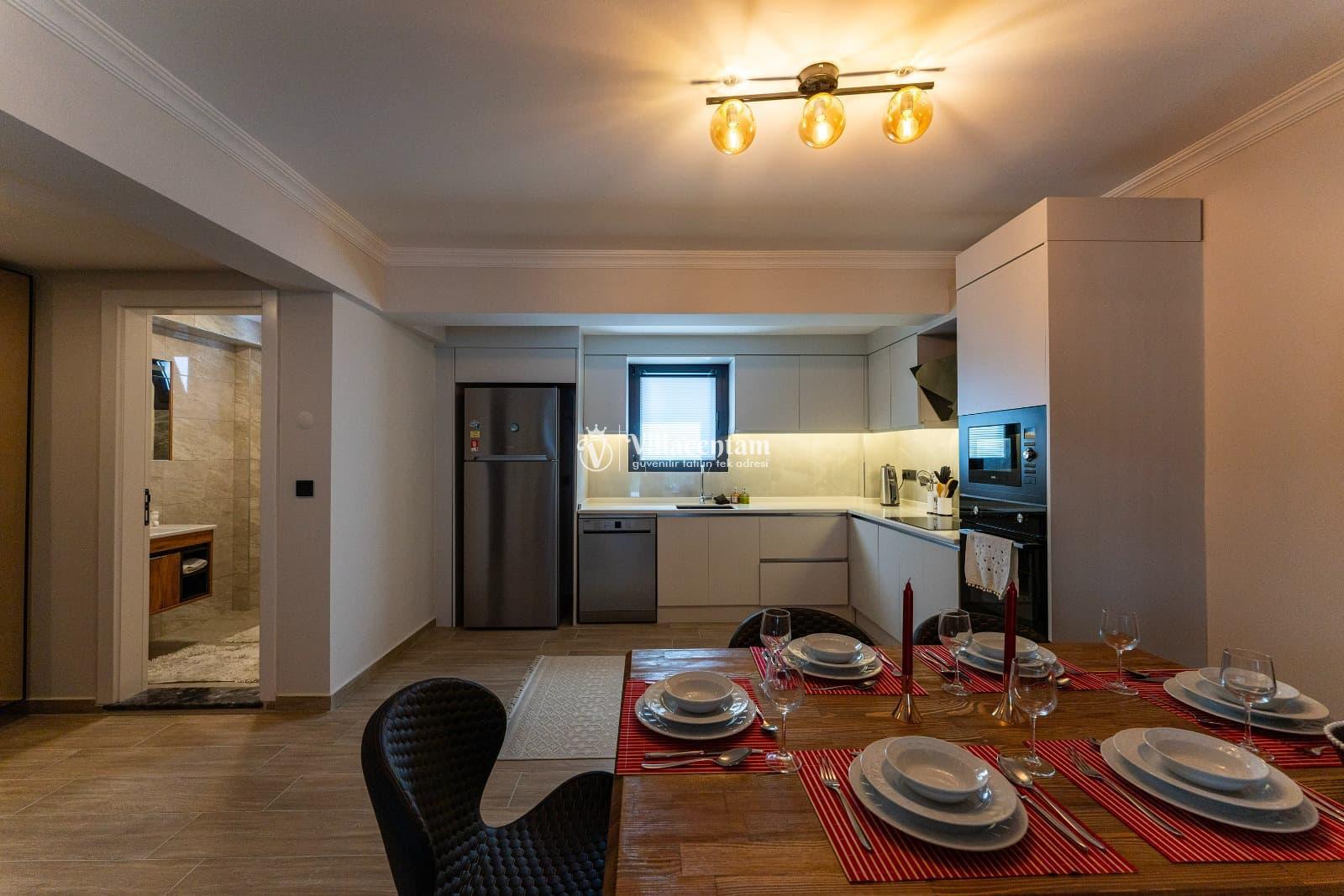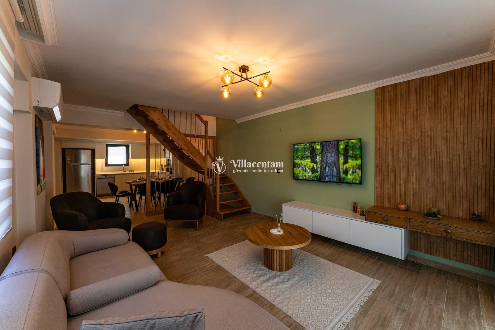 Modern ve ferah yaşam alanlarına sahip iç mekânda konforlu salon, tam donanımlı mutfak ve şık dekorasyon detaylarıyla ev sıcaklığını hissedersiniz. Ferah odalar, doğal ışıkla dolu iç mekân ve estetik çizgiler, tatilinizi dinlendirici bir deneyime dönüştürür.