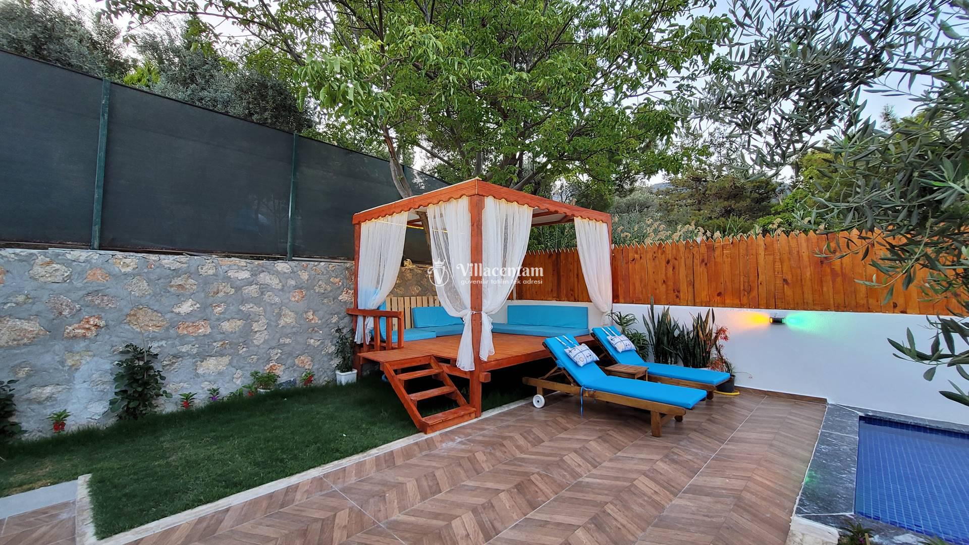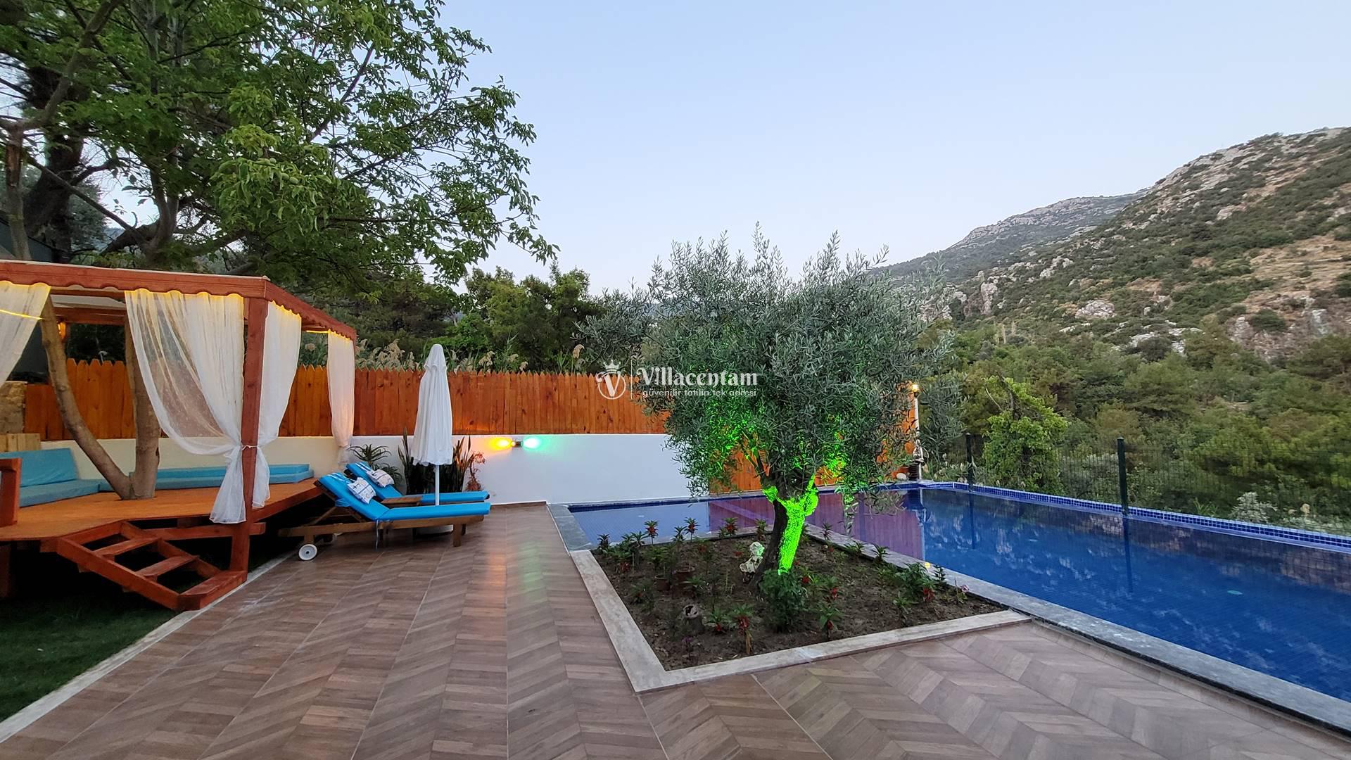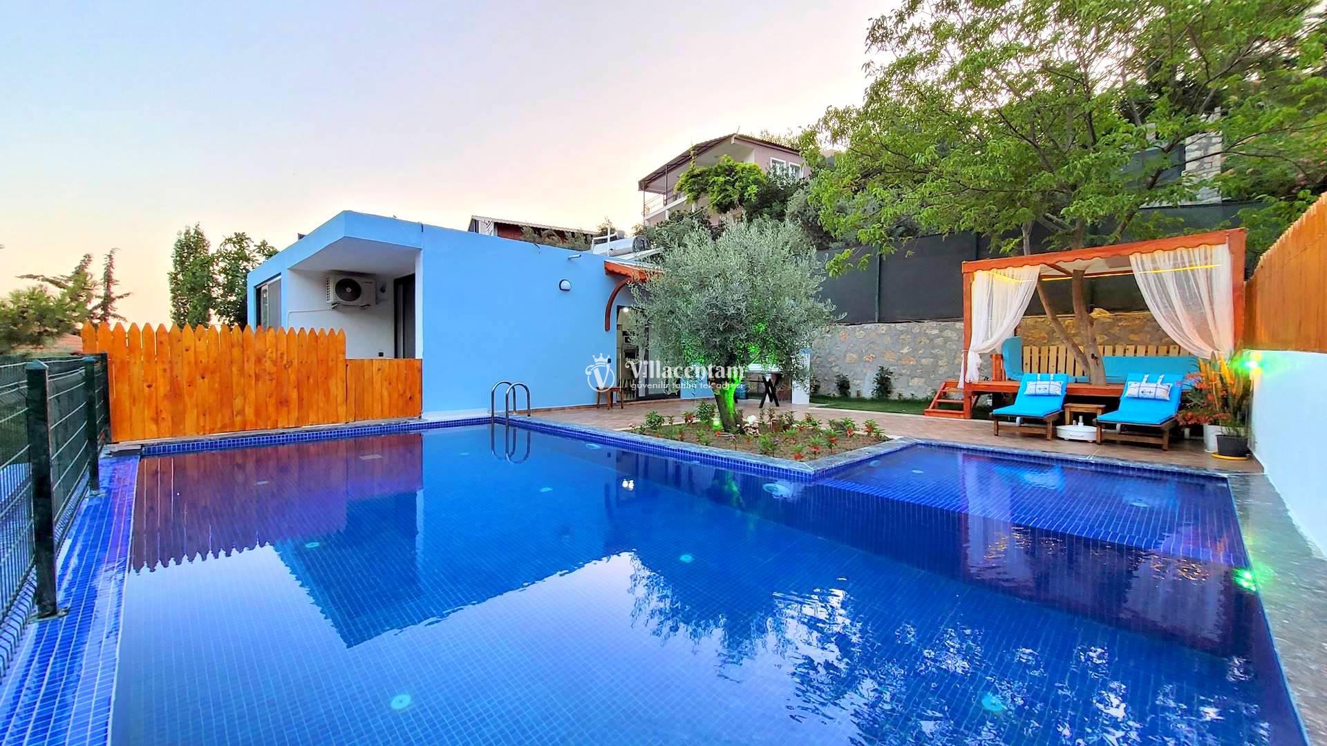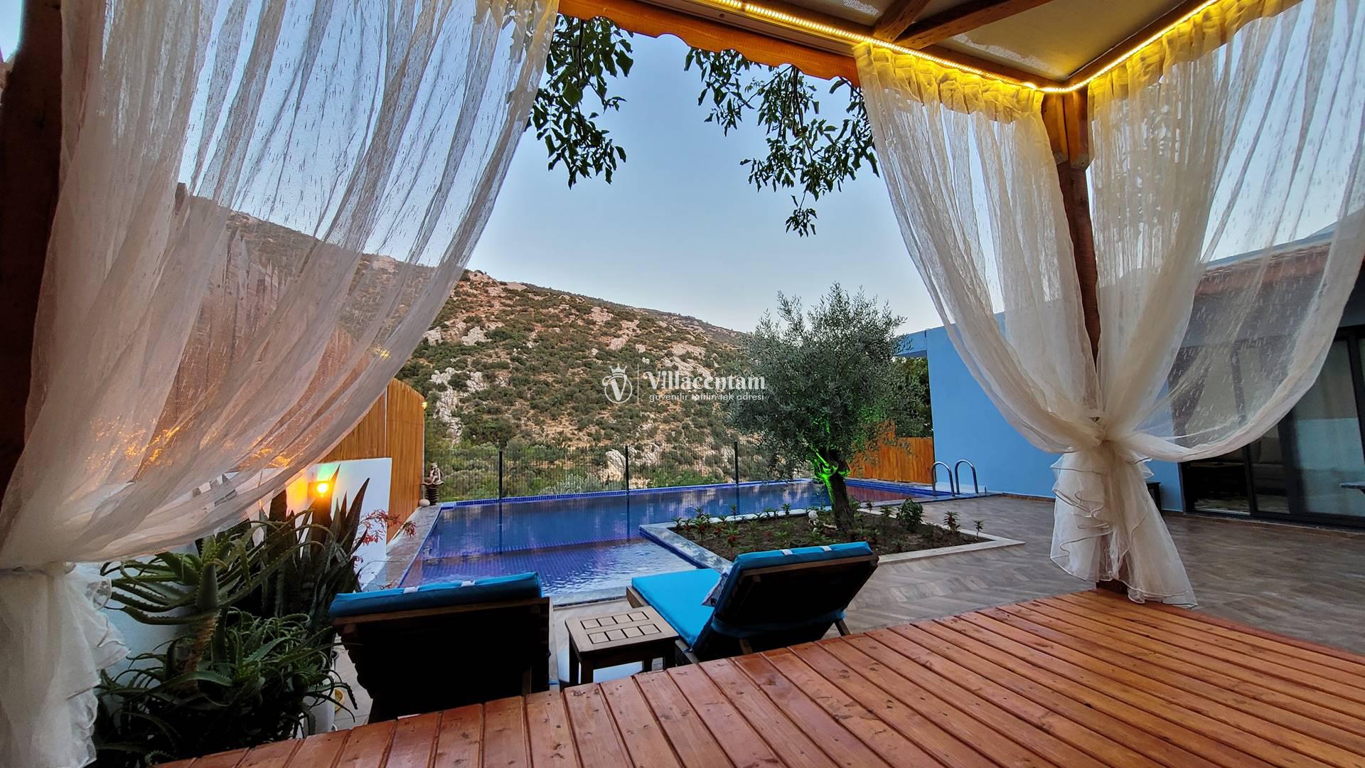 Villa Rayna, Kalkan’ın İslamlar bölgesinde, yemyeşil doğa içinde konumlanan ve özellikle çiftlere hitap eden şık bir tatil villasıdır. 2 kişilik konaklama kapasitesi, 1 yatak odası ve 1 banyosu ile balayı çiftleri ve sakin, huzurlu bir tatil arayan misafirler için ideal bir seçenek sunar. Villanın korunaklı özel yüzme havuzu dışarıdan görünmeyen yapısıyla mahremiyet sağlarken, jakuzisi ve geniş bahçesi konaklamaya ekstra konfor katar. Şömine, veranda, internet bağlantısı, barbekü alanı ve deniz manzarası gibi detaylarla öne çıkan Villa Rayna, hem dinlenmek hem de doğayla iç içe keyifli bir Kalkan tatili geçirmek isteyen misafirler için oldukça cazip bir alternatiftir. Ayrıca markete ve restorana kısa mesafede, Kalkan merkeze ise araçla kolay ulaşılabilir konumda bulunması da önemli bir avantaj sağlar.