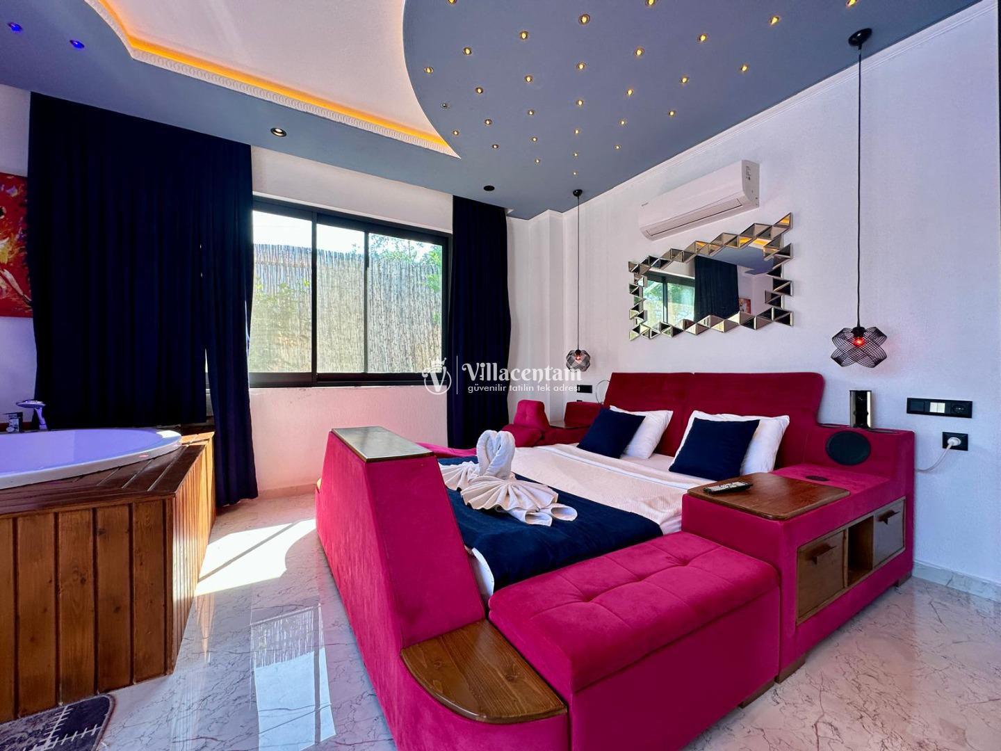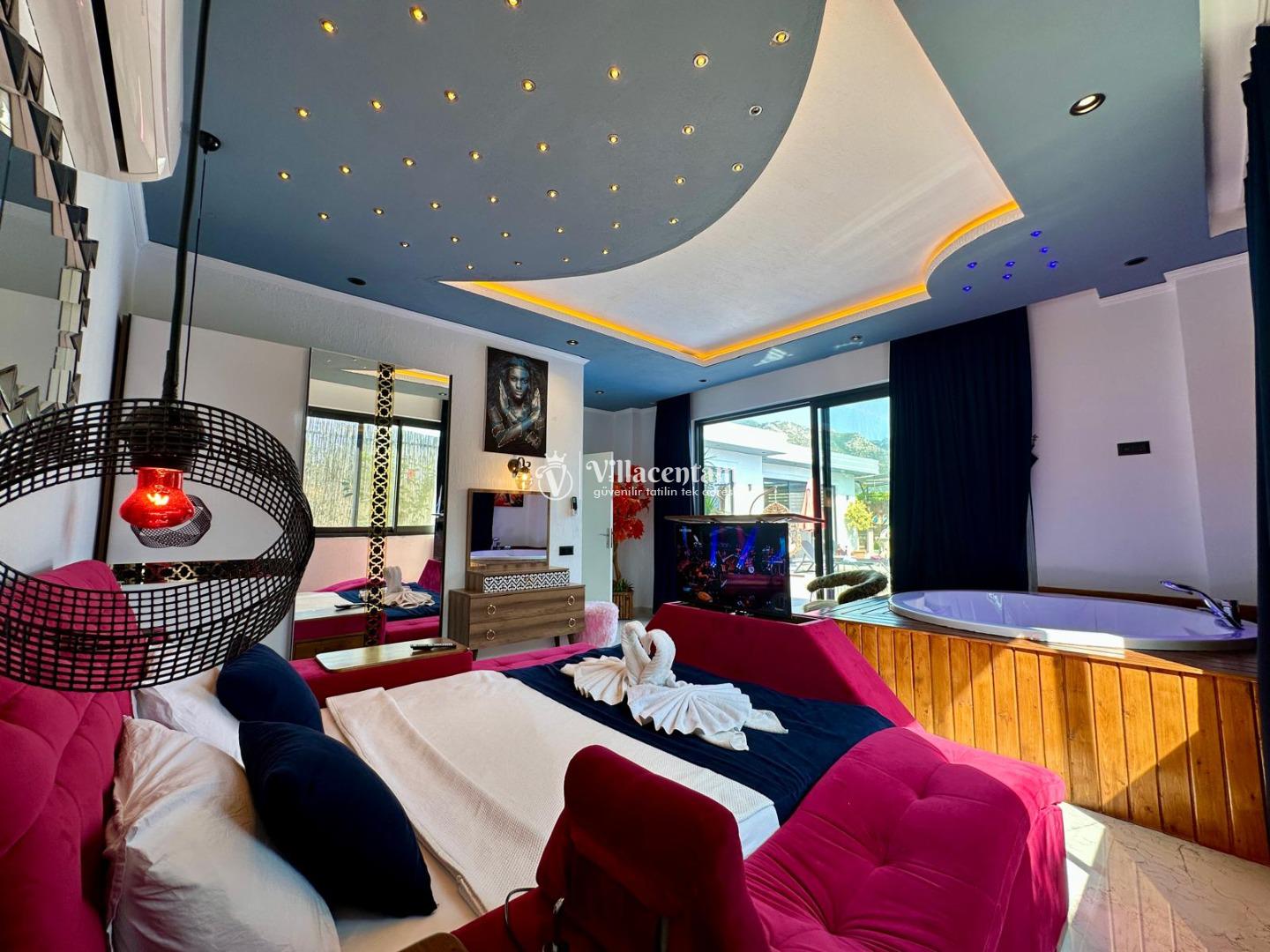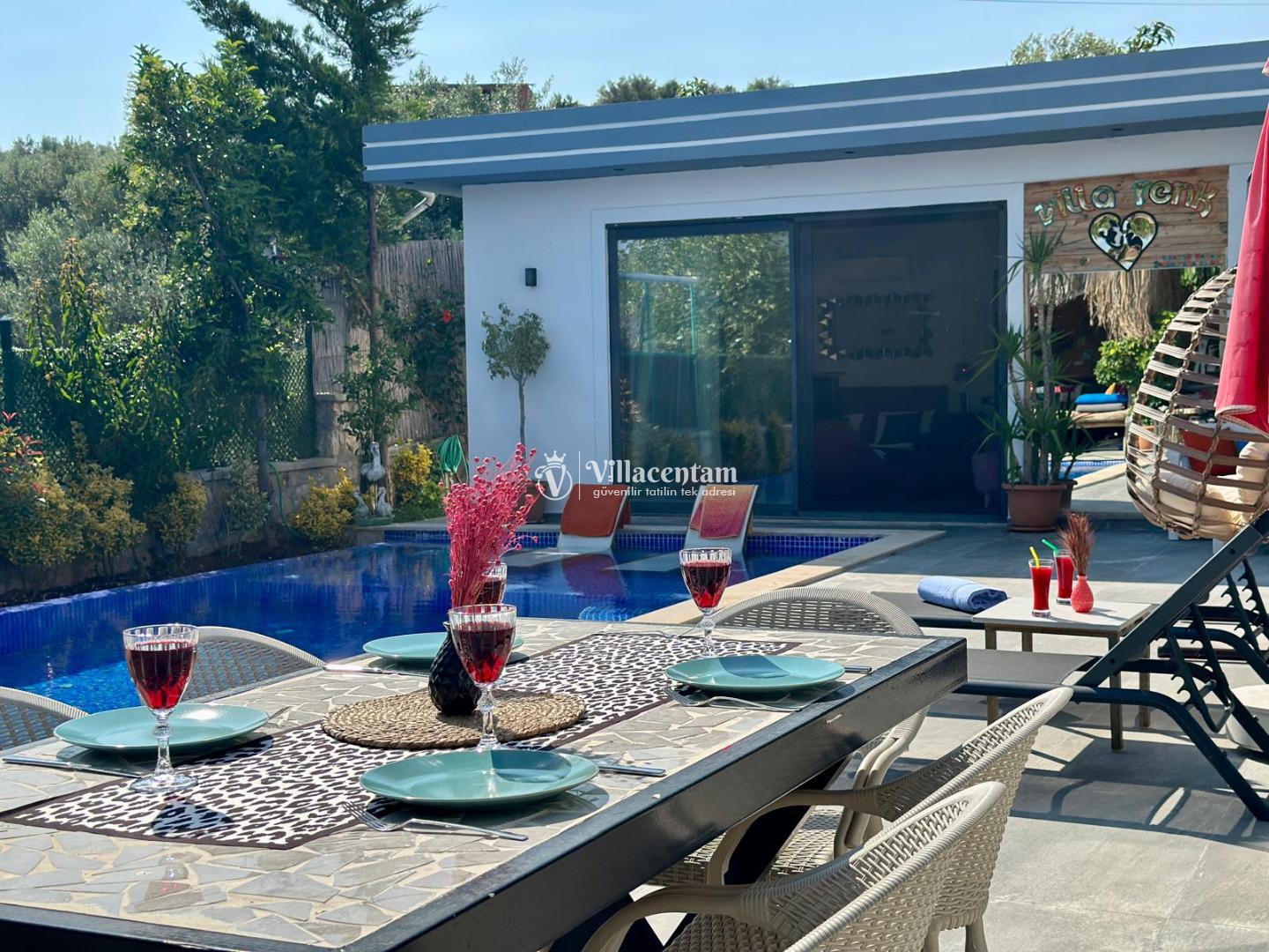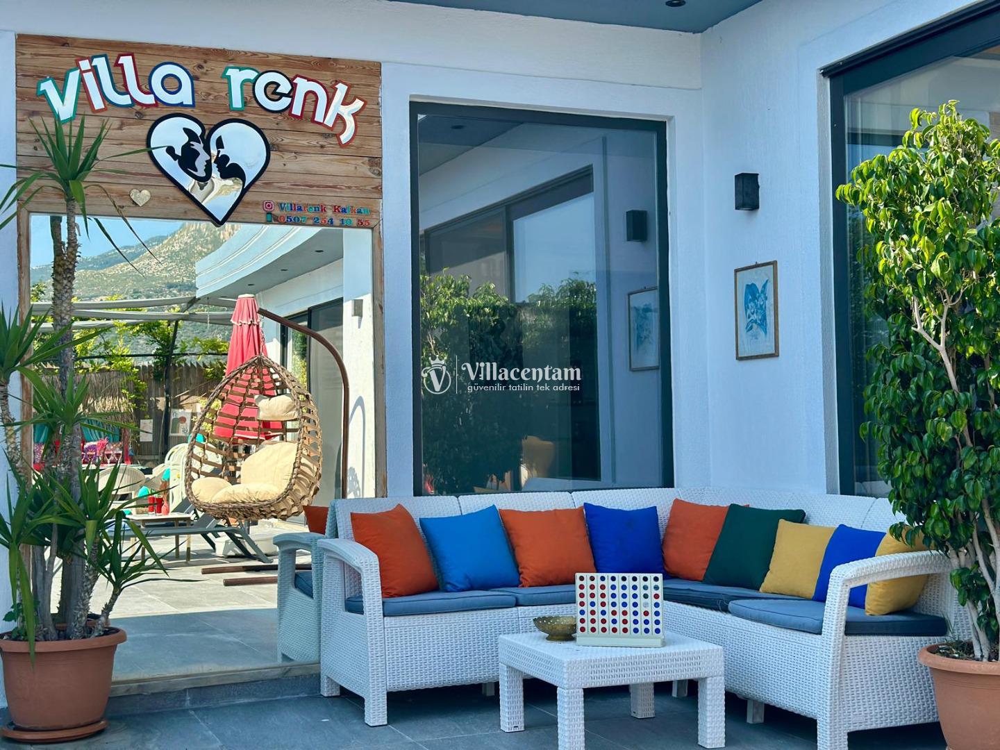 Villa Renk, Kalkan Çayköy mevkiinde konumlanmakta olan doğa manzarasına hakim kiralık villalarımız arasında yer almaktadır. Modern ve konforlu bir şekilde dizayn edilen yazlık villamızda 2 adet yatak odası bulunmakta olup, 4 kişiye konaklama imkanı sağlamaktadır. Her iki yatak odasının içerisinde de tüm yılın yorgunluğunu atabileceğiniz jakuzi bulunmaktadır. Ayrıca sauna, film odası ve çocuklar için uygun oyun alanı mevcuttur. Havuz ve havuz terası korunaklı bir hale getirilmiştir. Dışarıdan bir kimse tarafından görünmemektedir. Dış özel yüzme havuzuna entegre sığ havuz yer almaktadır. Muhafazakar balayı çiftleri ve çekirdek aileler rahatlıkla tercih edebilirler. Sessizlik ve sakinlik içerisinde huzur dolu bir tatil için Villa Renk doğru bir tercih olacaktır.