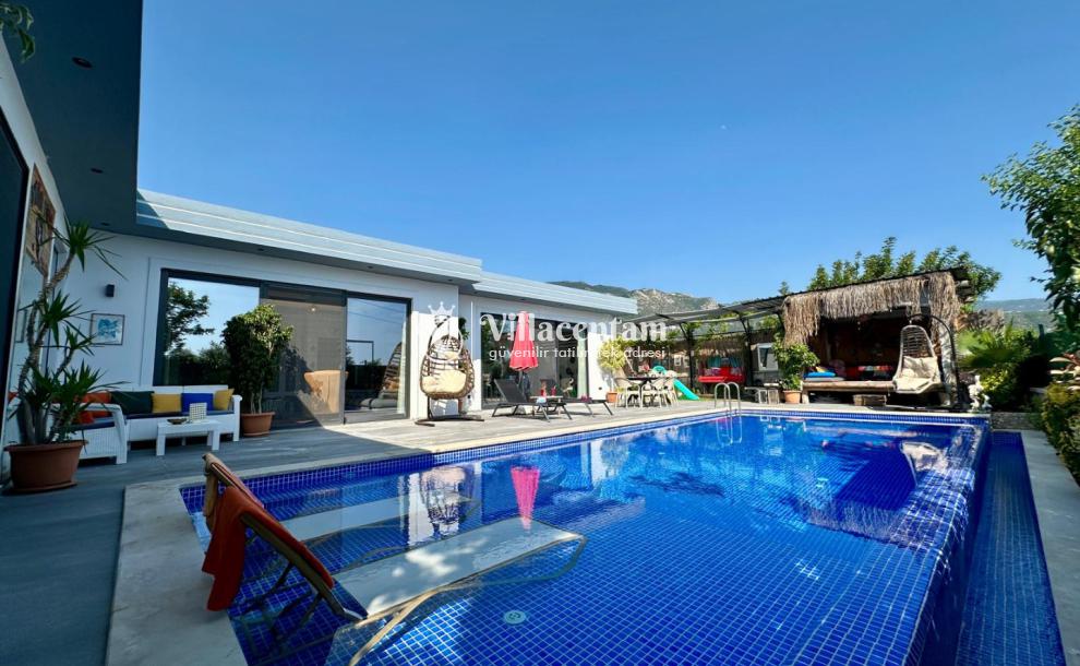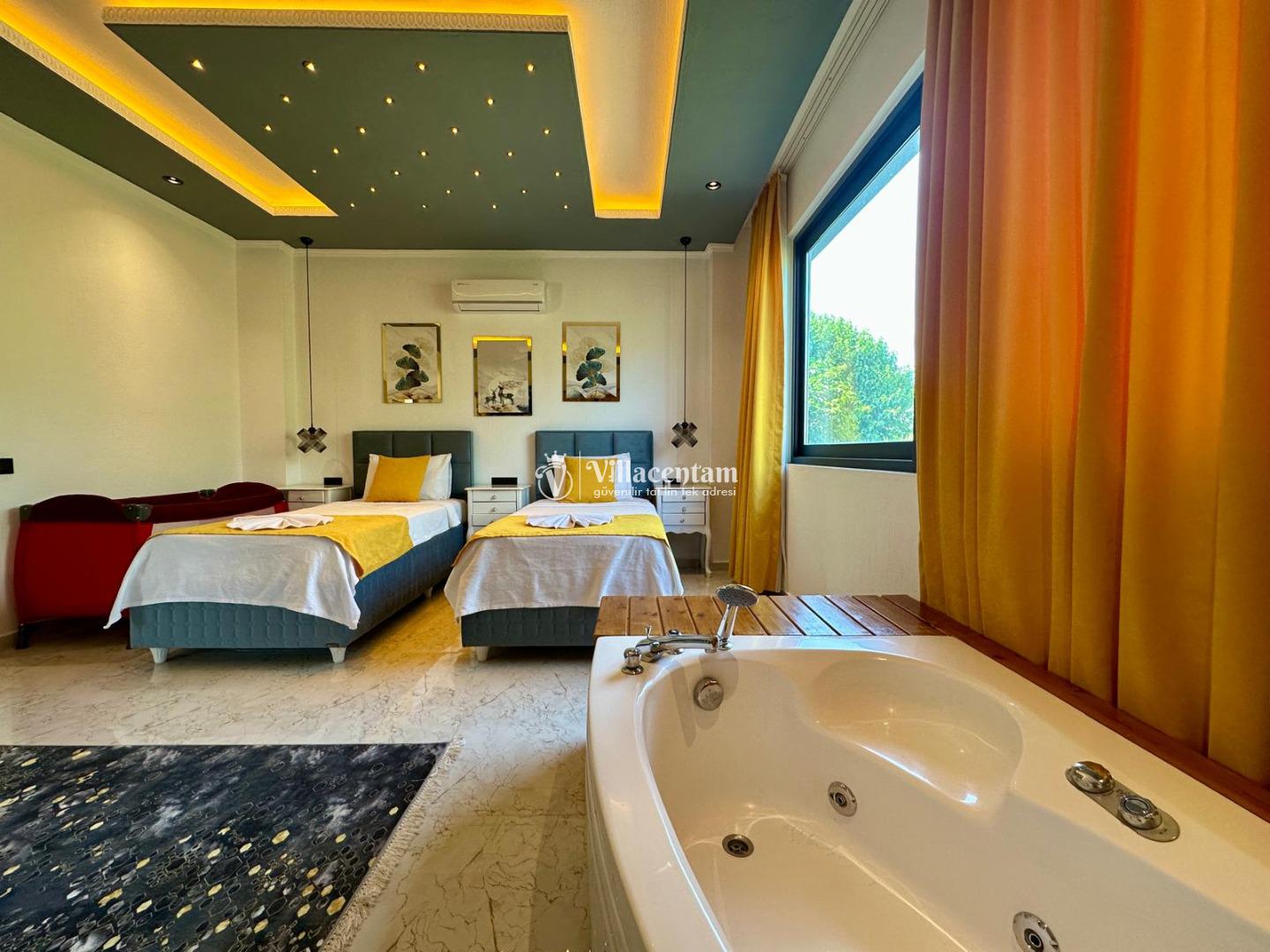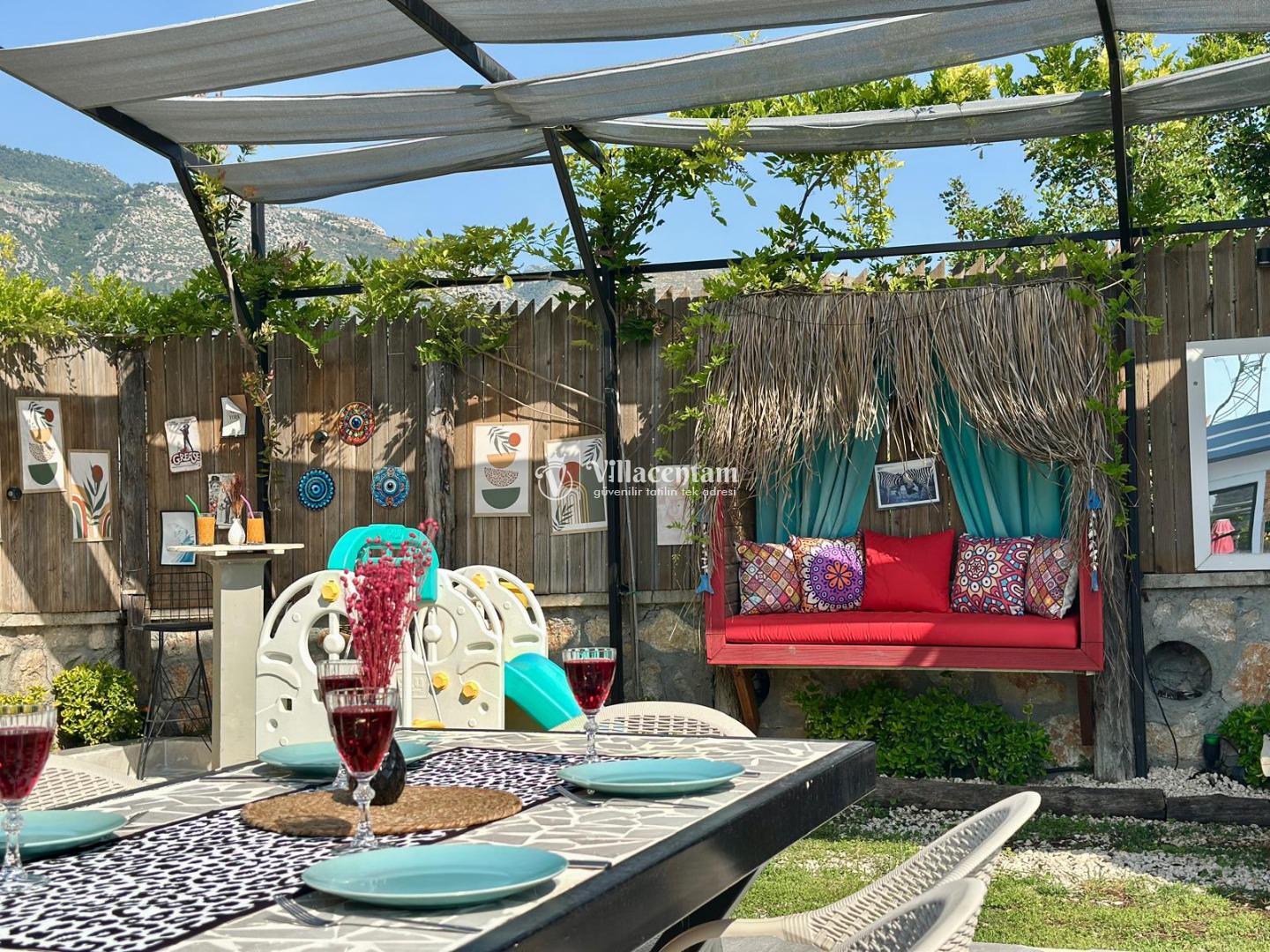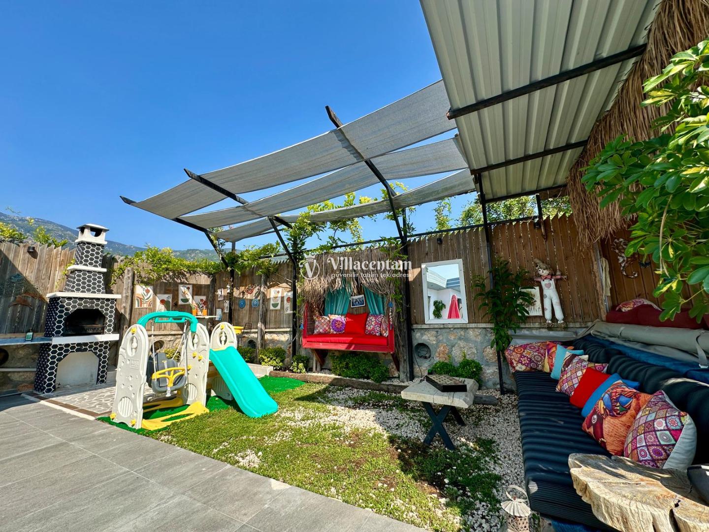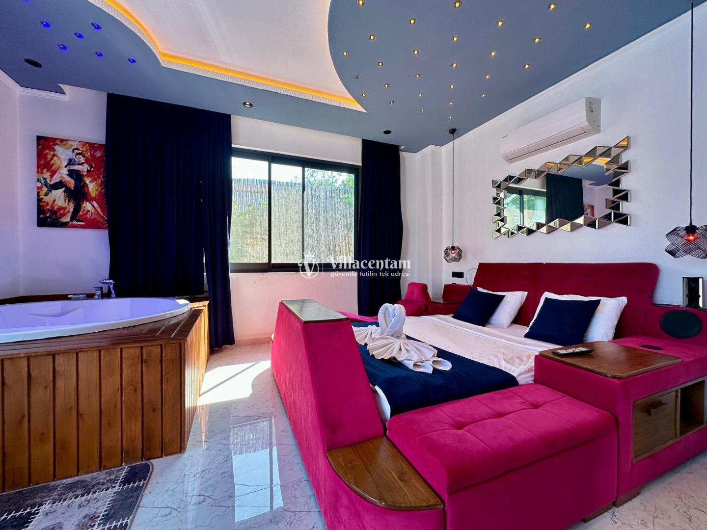 Villa Renk, Kalkan Çayköy mevkiinde konumlanmakta olan doğa manzarasına hakim kiralık villalarımız arasında yer almaktadır. Modern ve konforlu bir şekilde dizayn edilen yazlık villamızda 2 adet yatak odası bulunmakta olup, 4 kişiye konaklama imkanı sağlamaktadır. Her iki yatak odasının içerisinde de tüm yılın yorgunluğunu atabileceğiniz jakuzi bulunmaktadır. Ayrıca sauna, film odası ve çocuklar için uygun oyun alanı mevcuttur. Havuz ve havuz terası korunaklı bir hale getirilmiştir. Dışarıdan bir kimse tarafından görünmemektedir. Dış özel yüzme havuzuna entegre sığ havuz yer almaktadır. Muhafazakar balayı çiftleri ve çekirdek aileler rahatlıkla tercih edebilirler. Sessizlik ve sakinlik içerisinde huzur dolu bir tatil için Villa Renk doğru bir tercih olacaktır.