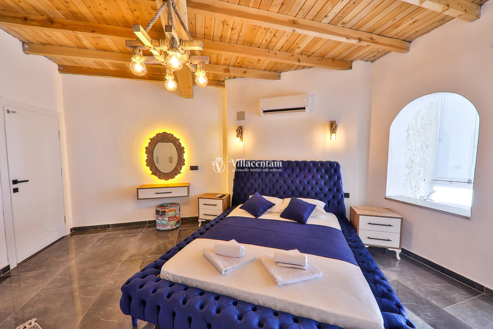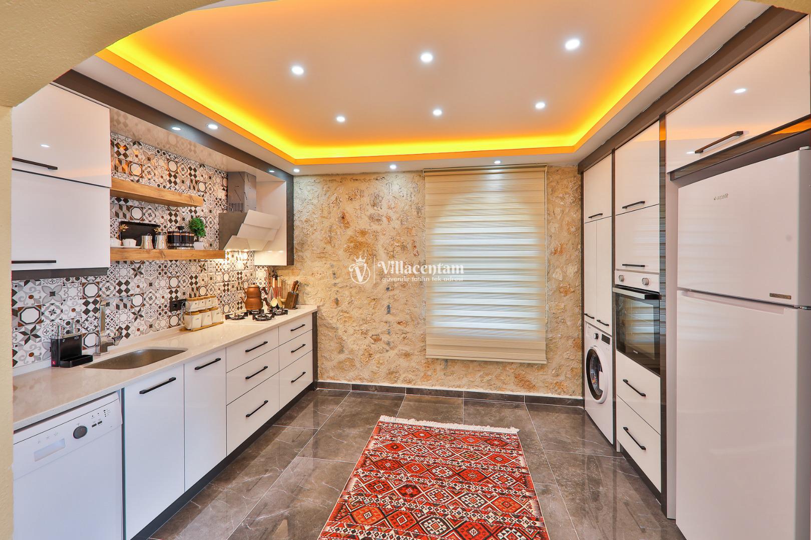 Villanın iç tasarımı modern ve rahat olup, ferah salon, tam donanımlı mutfak ve konforlu yatak odaları ile ev konforunda bir yaşam alanı sağlar. İki yatak odasında özel jakuzi bulunurken, ortak alanlarda da geniş yaşam alanları tatilinizi daha keyifli hâle getirir.