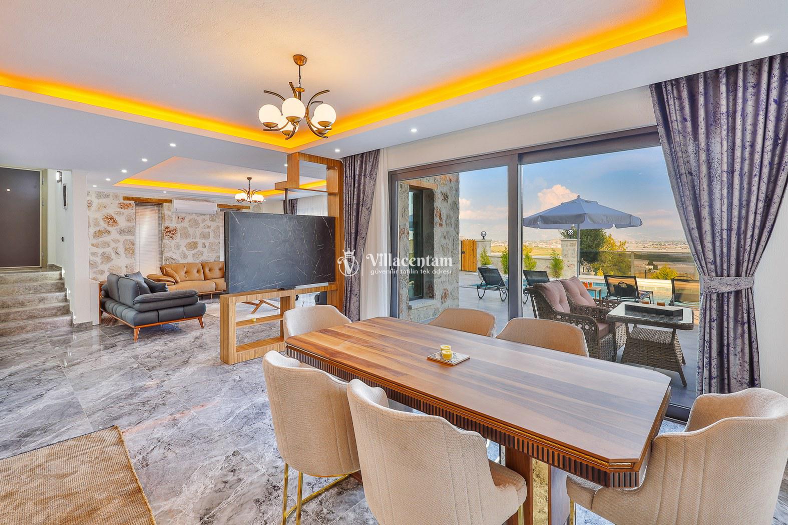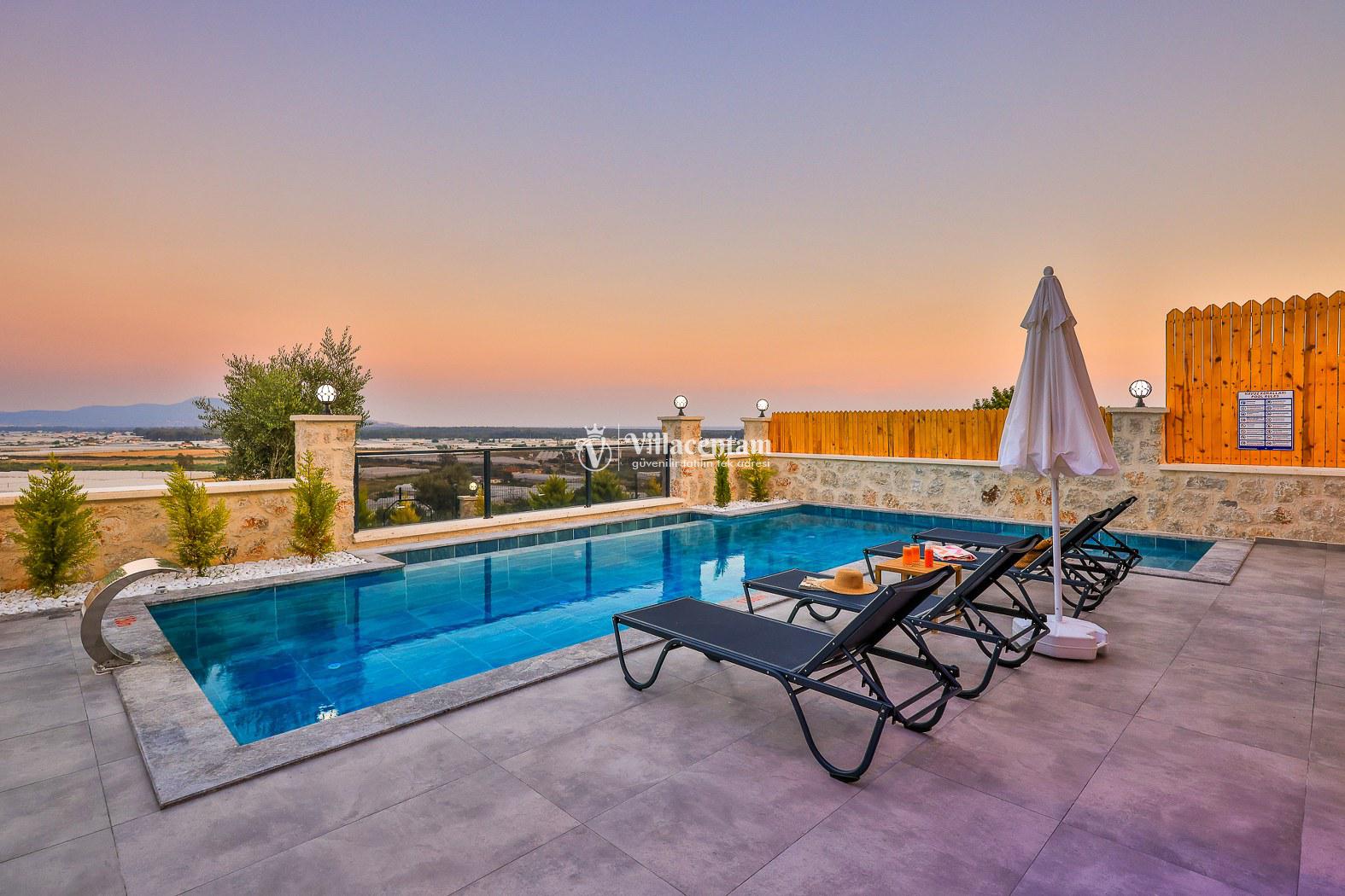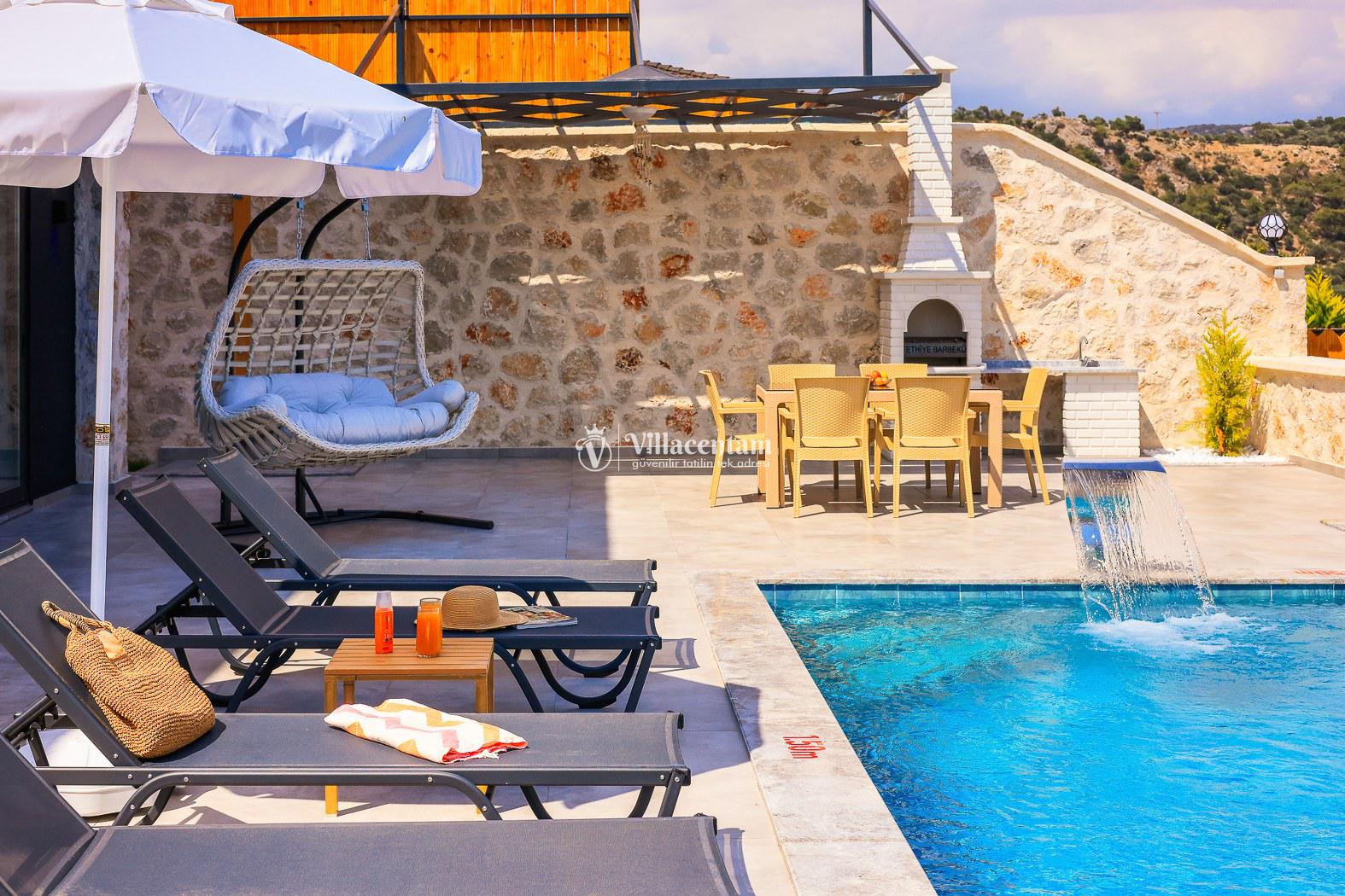 Villanın iç tasarımı modern ve rahat olup, ferah salon, tam donanımlı mutfak ve konforlu yatak odaları ile ev konforunda bir yaşam alanı sağlar. İki yatak odasında özel jakuzi bulunurken, ortak alanlarda da geniş yaşam alanları tatilinizi daha keyifli hâle getirir.