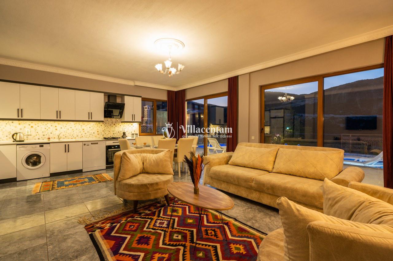 Villa Sariha, Kalkan Sarıbelen mevkiinde konumlanmakta olan doğa manzarasına hakim kiralık villalarımız arasında yer almaktadır. Modern ve lüks bir şekilde dekore edilen yazlık villamızda 2 adet yatak odası bulunmakta olup, 4 kişiye konaklama imkanı sağlamaktadır. Havuz ve havuz terası korunaklı hale getirilmiştir. Dışarıdan bir kimse tarafından görünmemektedir. Muhafazakar balayı çiftleri ve çekirdek aileler rahatlıkla tercih edebilirler. Geniş ve ferah bir havuz terasına sahip olan villamızda sevdiklerinizle tatilin tadını çıkarabilirsiniz. Keyifli bir tatil için Villa Sariha'yı tercih edebilirsiniz.