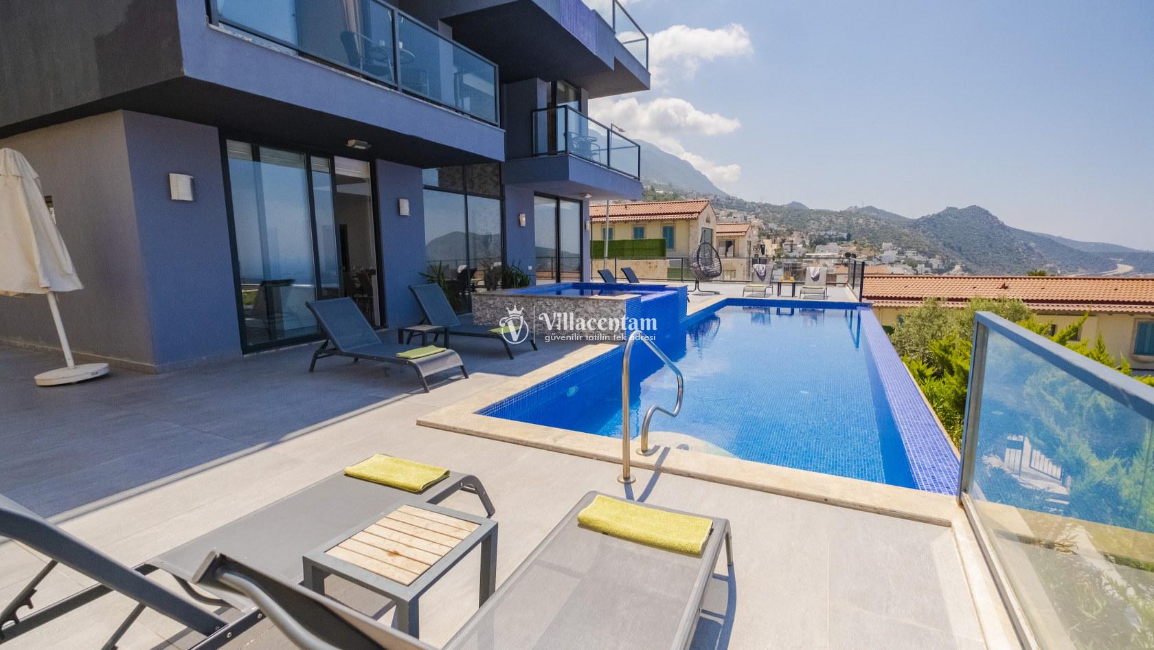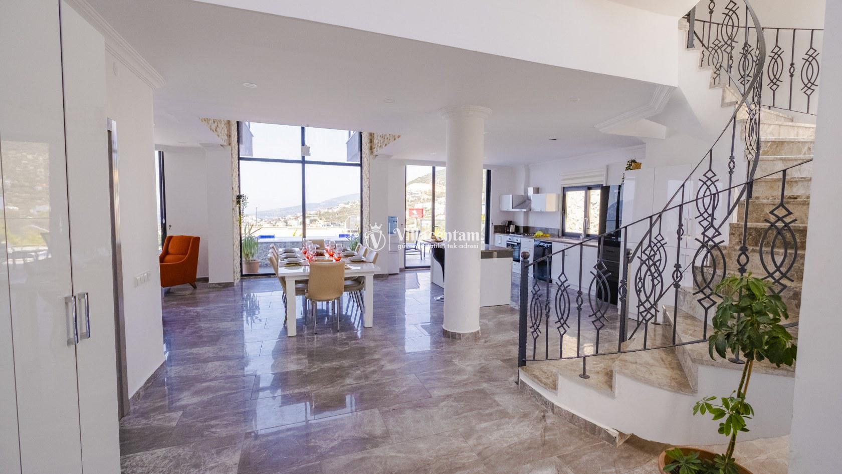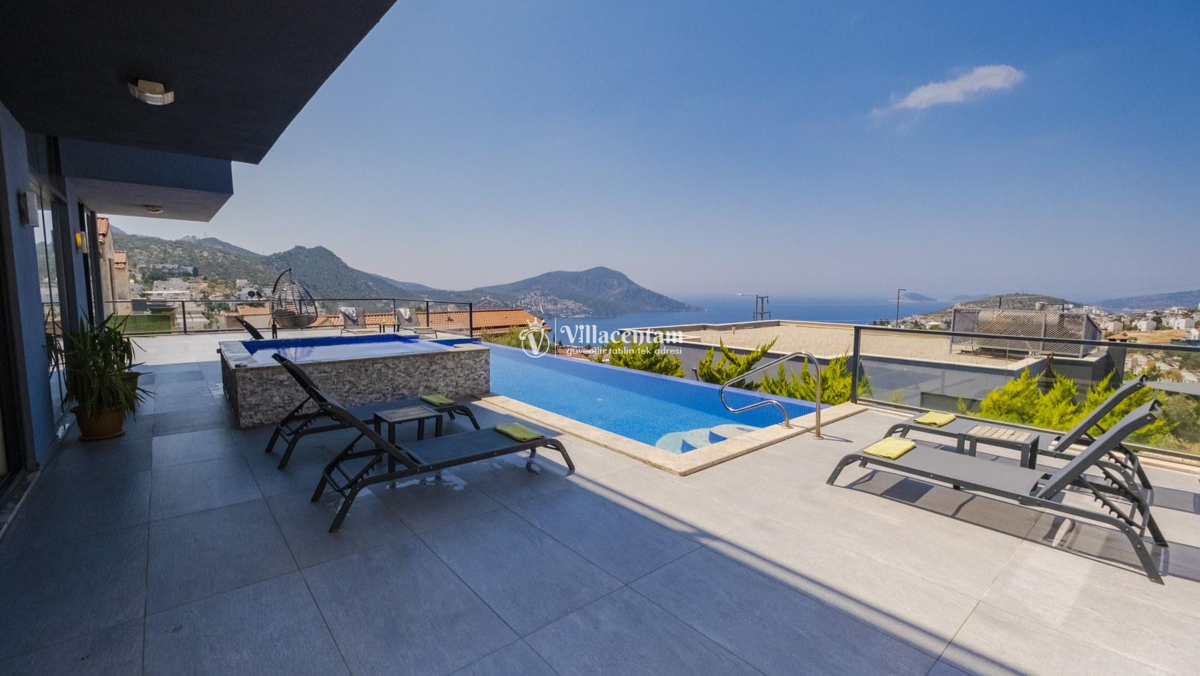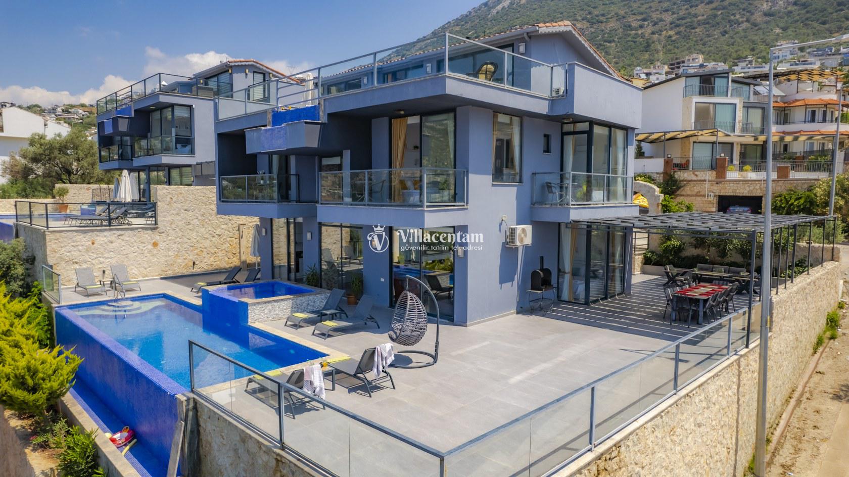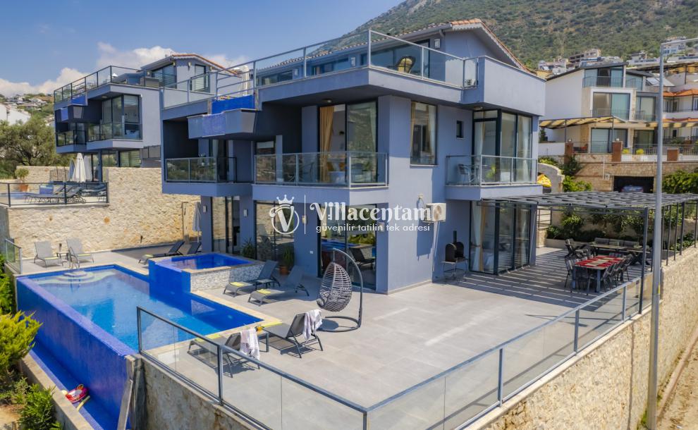 Villa Şelale 1, Antalya’nın gözde tatil merkezlerinden Kalkan’da, panoramik deniz manzarasına hâkim konumuyla lüks ve konforu bir arada sunan özel bir tatil villasıdır. Toplam 5 suit yatak odası ve 10 kişilik konaklama kapasitesi sayesinde geniş aileler ve arkadaş grupları için ideal olan villa, modern mimarisi ve ferah yaşam alanlarıyla ayrıcalıklı bir tatil deneyimi yaşatır. Deniz manzaralı geniş salonu, şık oturma grubu ve tam donanımlı açık mutfağı ile günün her anında rahat ve keyifli vakit geçirmenize olanak tanır. Villanın her biri özel banyolu yatak odaları konfor ön planda tutularak tasarlanmış olup, bazı odalardan havuz terasına veya balkona doğrudan çıkış imkânı bulunmaktadır. Dış alanda yer alan özel yüzme havuzu ve çatı katındaki ikinci havuz, gün boyu güneşlenme ve manzaranın tadını çıkarma fırsatı sunarken; şezlonglar, oturma alanları, barbekü köşesi ve masa tenisi gibi detaylar tatilinizi daha keyifli hale getirir. Kalkan merkeze ve sosyal alanlara yakın konumuyla hem sakin hem de ulaşımı kolay bir tatil imkânı sunan Villa Şelale 1, deniz manzaralı, geniş ve konforlu bir villa tatili arayan misafirler için kusursuz bir seçenektir.