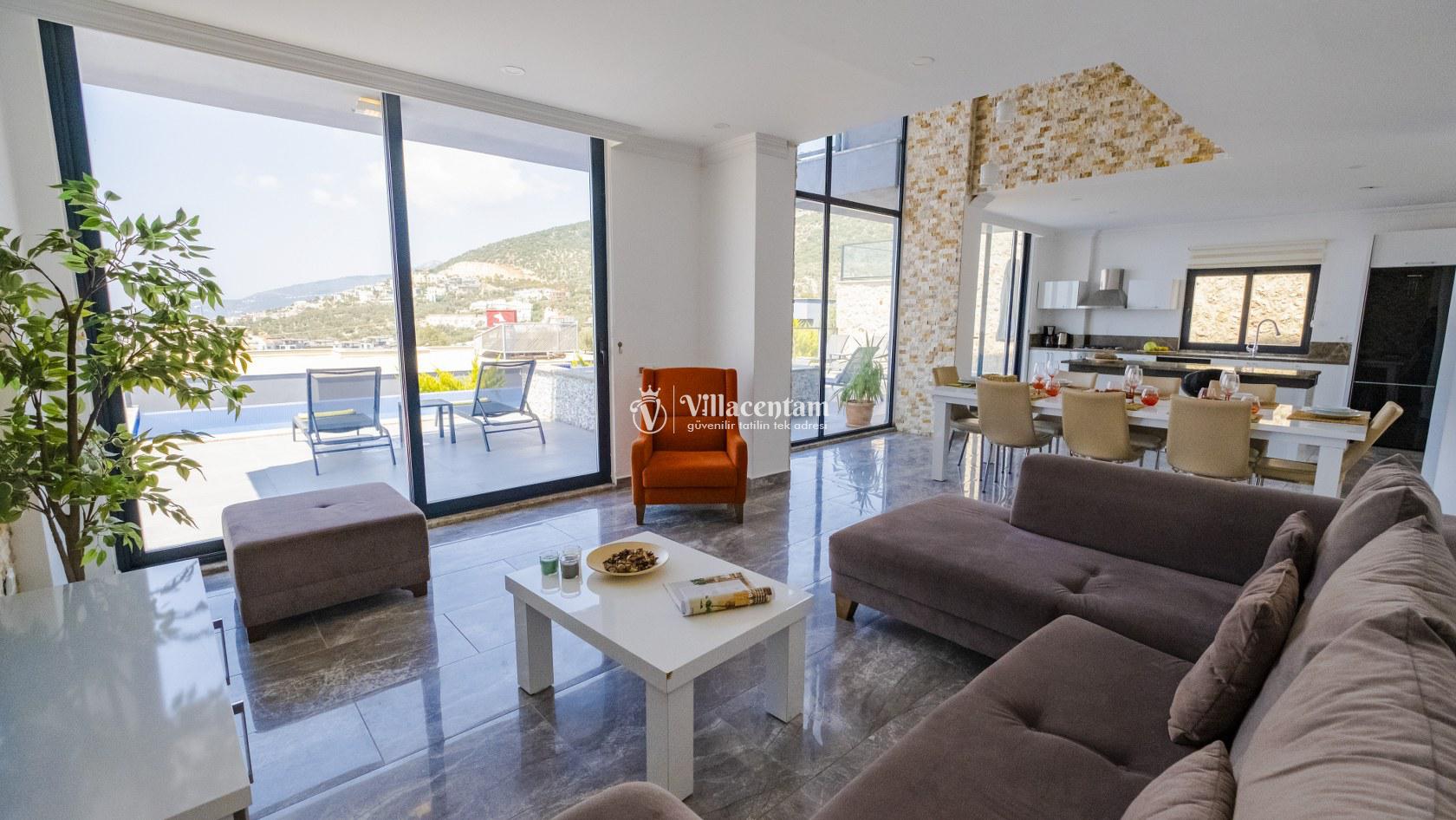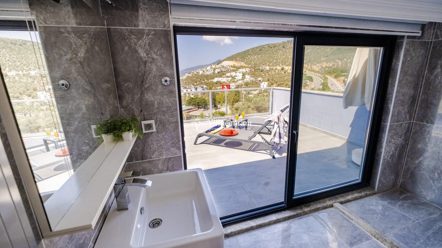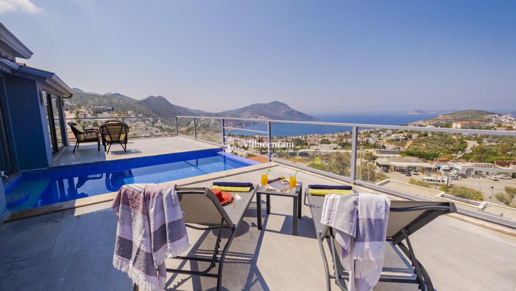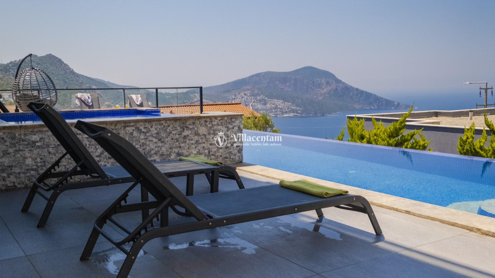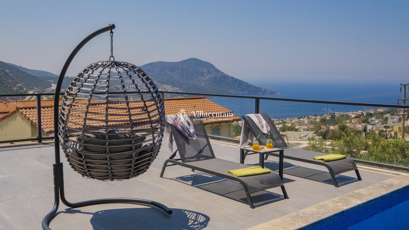 Villa Şelale 1, Antalya’nın gözde tatil merkezlerinden Kalkan’da, panoramik deniz manzarasına hâkim konumuyla lüks ve konforu bir arada sunan özel bir tatil villasıdır. Toplam 5 suit yatak odası ve 10 kişilik konaklama kapasitesi sayesinde geniş aileler ve arkadaş grupları için ideal olan villa, modern mimarisi ve ferah yaşam alanlarıyla ayrıcalıklı bir tatil deneyimi yaşatır. Deniz manzaralı geniş salonu, şık oturma grubu ve tam donanımlı açık mutfağı ile günün her anında rahat ve keyifli vakit geçirmenize olanak tanır. Villanın her biri özel banyolu yatak odaları konfor ön planda tutularak tasarlanmış olup, bazı odalardan havuz terasına veya balkona doğrudan çıkış imkânı bulunmaktadır. Dış alanda yer alan özel yüzme havuzu ve çatı katındaki ikinci havuz, gün boyu güneşlenme ve manzaranın tadını çıkarma fırsatı sunarken; şezlonglar, oturma alanları, barbekü köşesi ve masa tenisi gibi detaylar tatilinizi daha keyifli hale getirir. Kalkan merkeze ve sosyal alanlara yakın konumuyla hem sakin hem de ulaşımı kolay bir tatil imkânı sunan Villa Şelale 1, deniz manzaralı, geniş ve konforlu bir villa tatili arayan misafirler için kusursuz bir seçenektir.