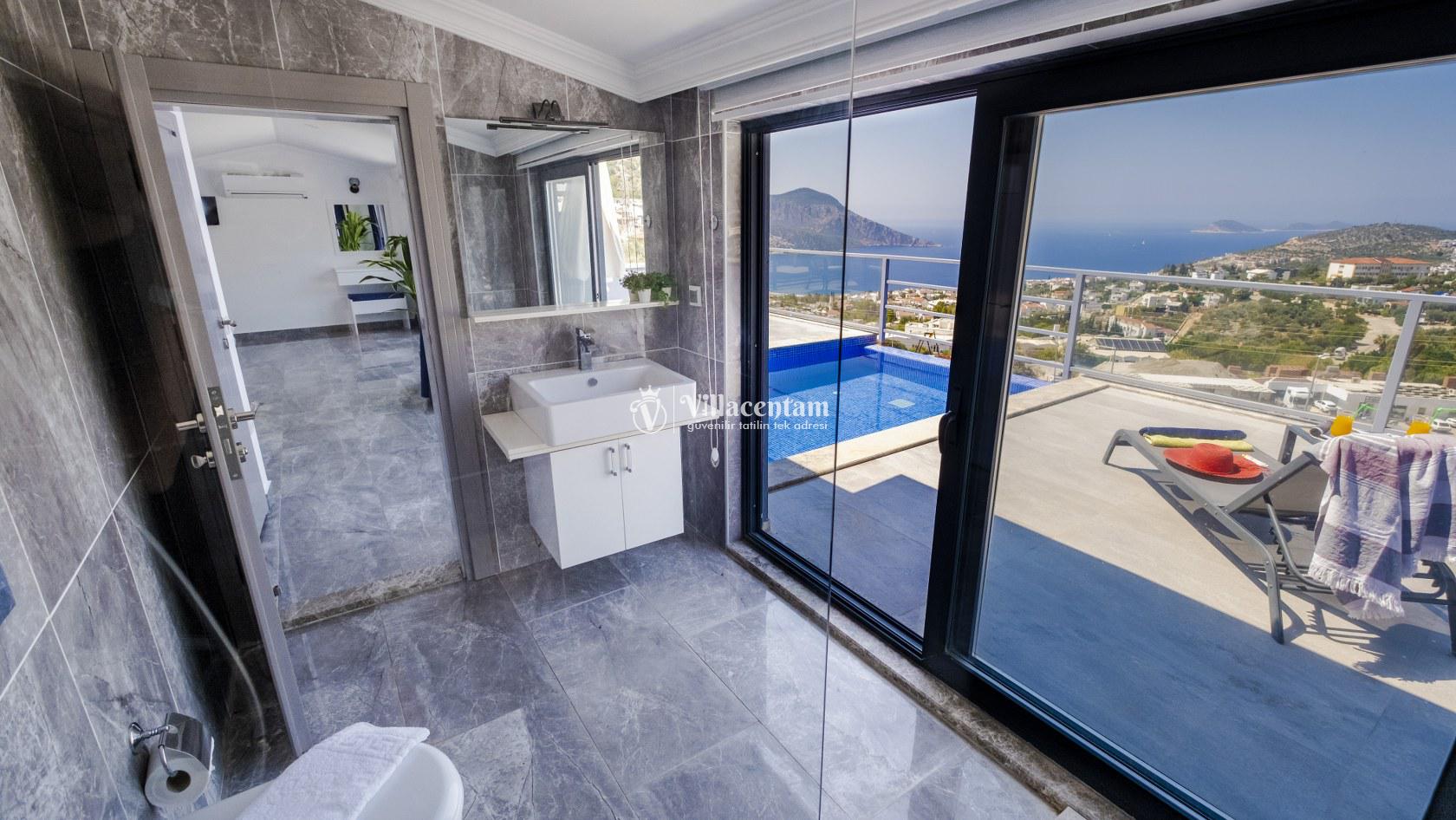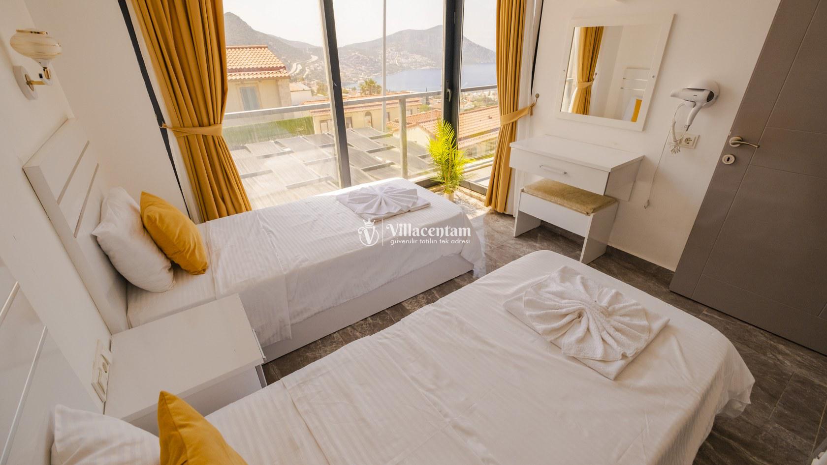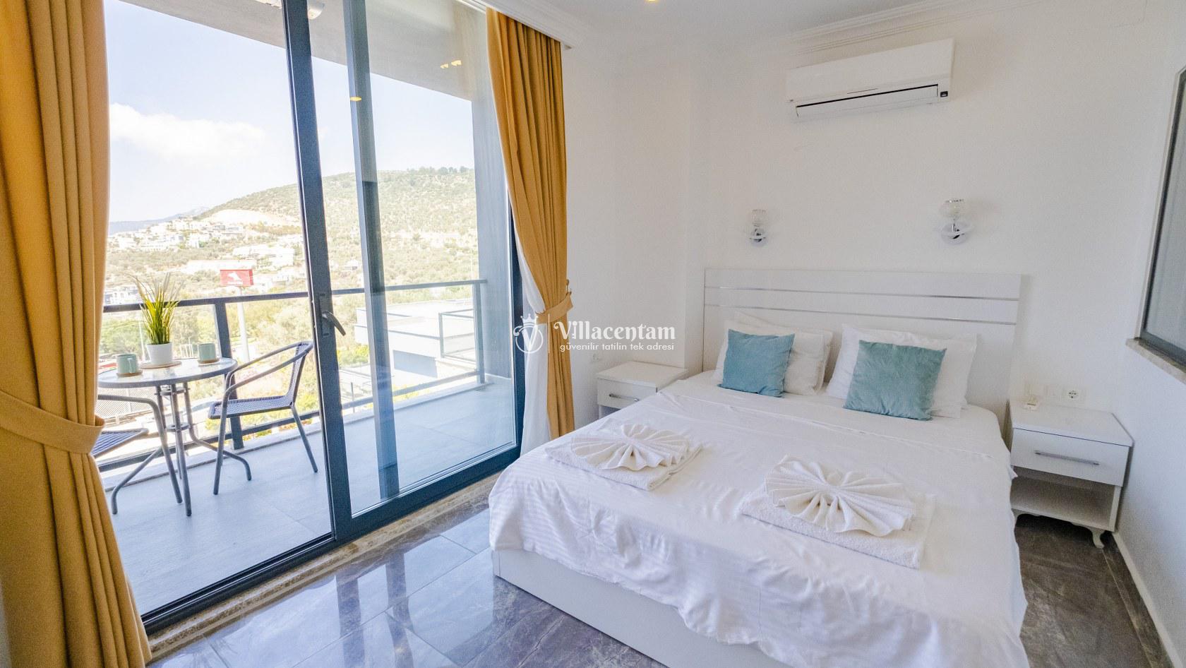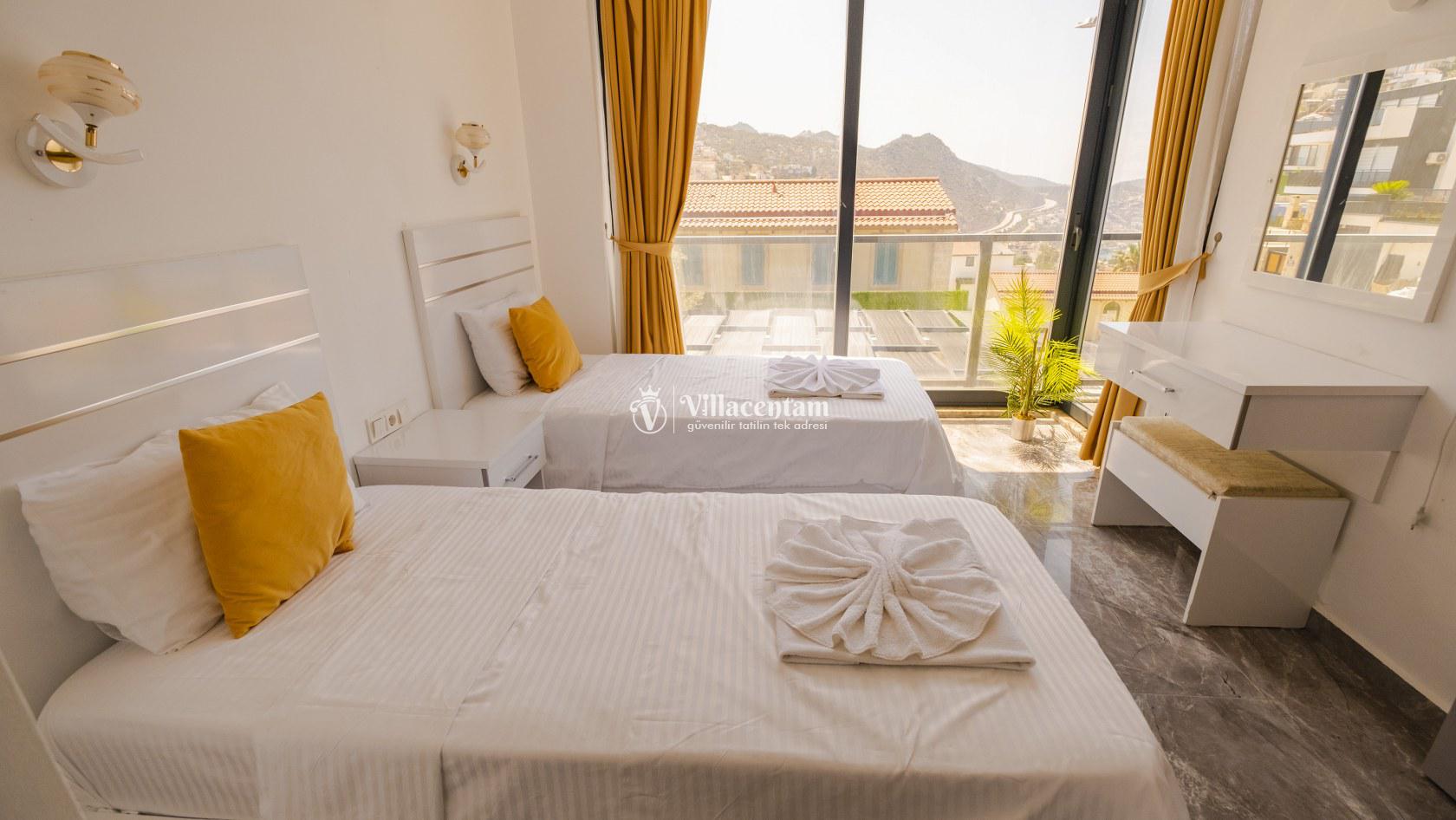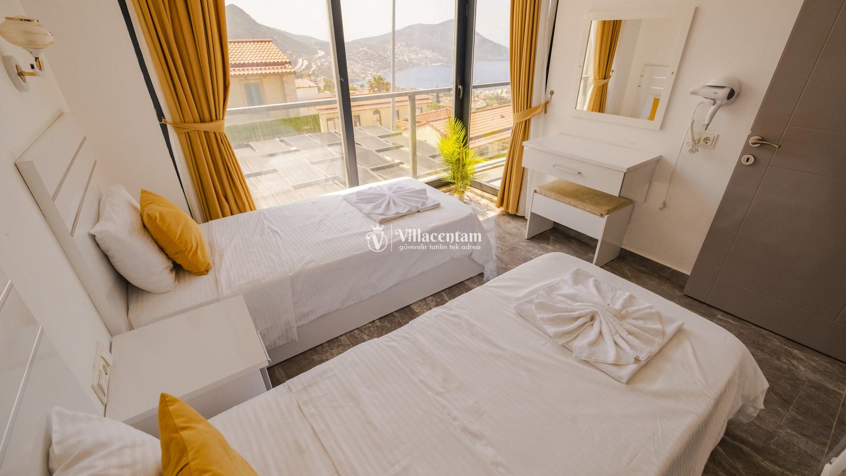 Villa Şelale 1, Antalya’nın gözde tatil merkezlerinden Kalkan’da, panoramik deniz manzarasına hâkim konumuyla lüks ve konforu bir arada sunan özel bir tatil villasıdır. Toplam 5 suit yatak odası ve 10 kişilik konaklama kapasitesi sayesinde geniş aileler ve arkadaş grupları için ideal olan villa, modern mimarisi ve ferah yaşam alanlarıyla ayrıcalıklı bir tatil deneyimi yaşatır. Deniz manzaralı geniş salonu, şık oturma grubu ve tam donanımlı açık mutfağı ile günün her anında rahat ve keyifli vakit geçirmenize olanak tanır. Villanın her biri özel banyolu yatak odaları konfor ön planda tutularak tasarlanmış olup, bazı odalardan havuz terasına veya balkona doğrudan çıkış imkânı bulunmaktadır. Dış alanda yer alan özel yüzme havuzu ve çatı katındaki ikinci havuz, gün boyu güneşlenme ve manzaranın tadını çıkarma fırsatı sunarken; şezlonglar, oturma alanları, barbekü köşesi ve masa tenisi gibi detaylar tatilinizi daha keyifli hale getirir. Kalkan merkeze ve sosyal alanlara yakın konumuyla hem sakin hem de ulaşımı kolay bir tatil imkânı sunan Villa Şelale 1, deniz manzaralı, geniş ve konforlu bir villa tatili arayan misafirler için kusursuz bir seçenektir.