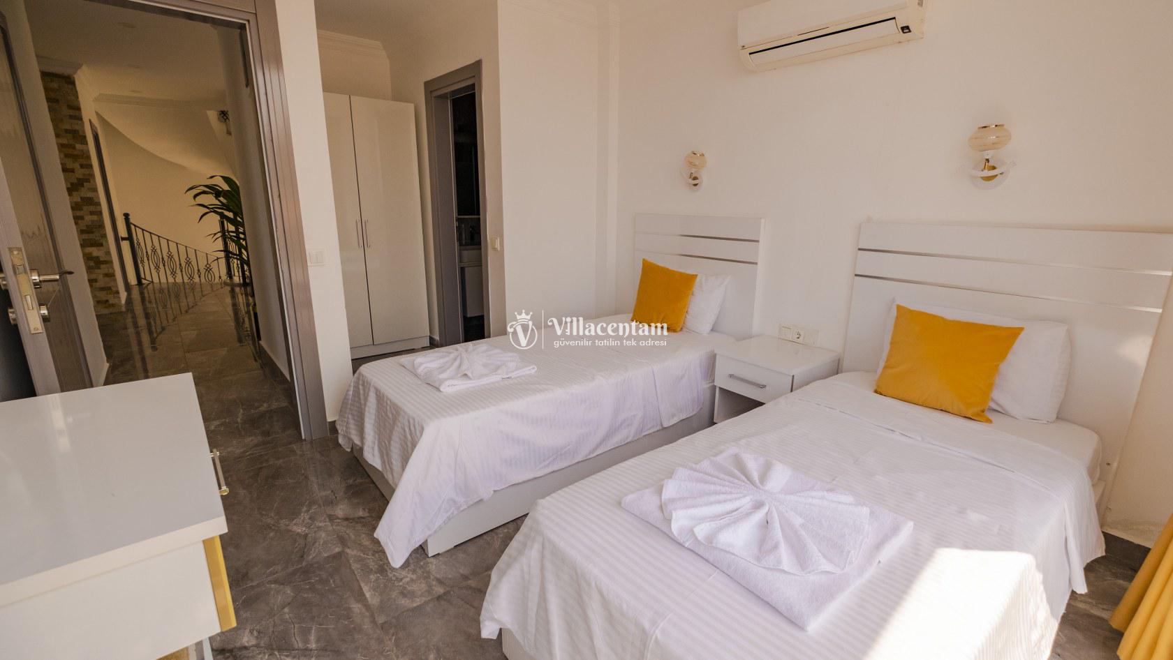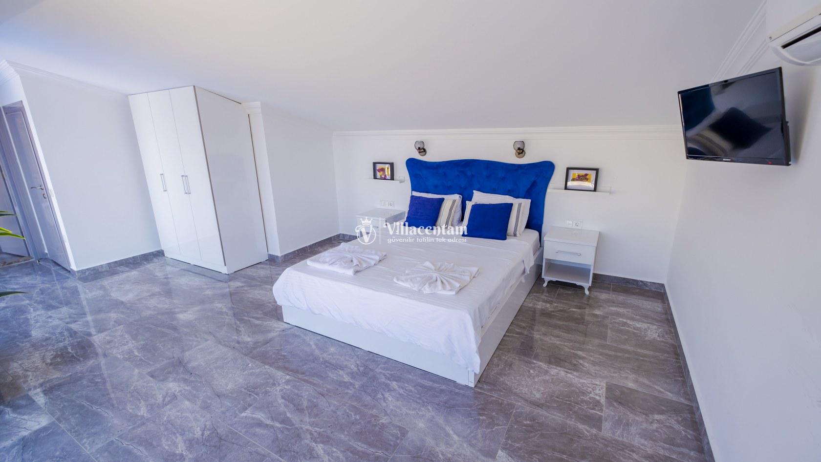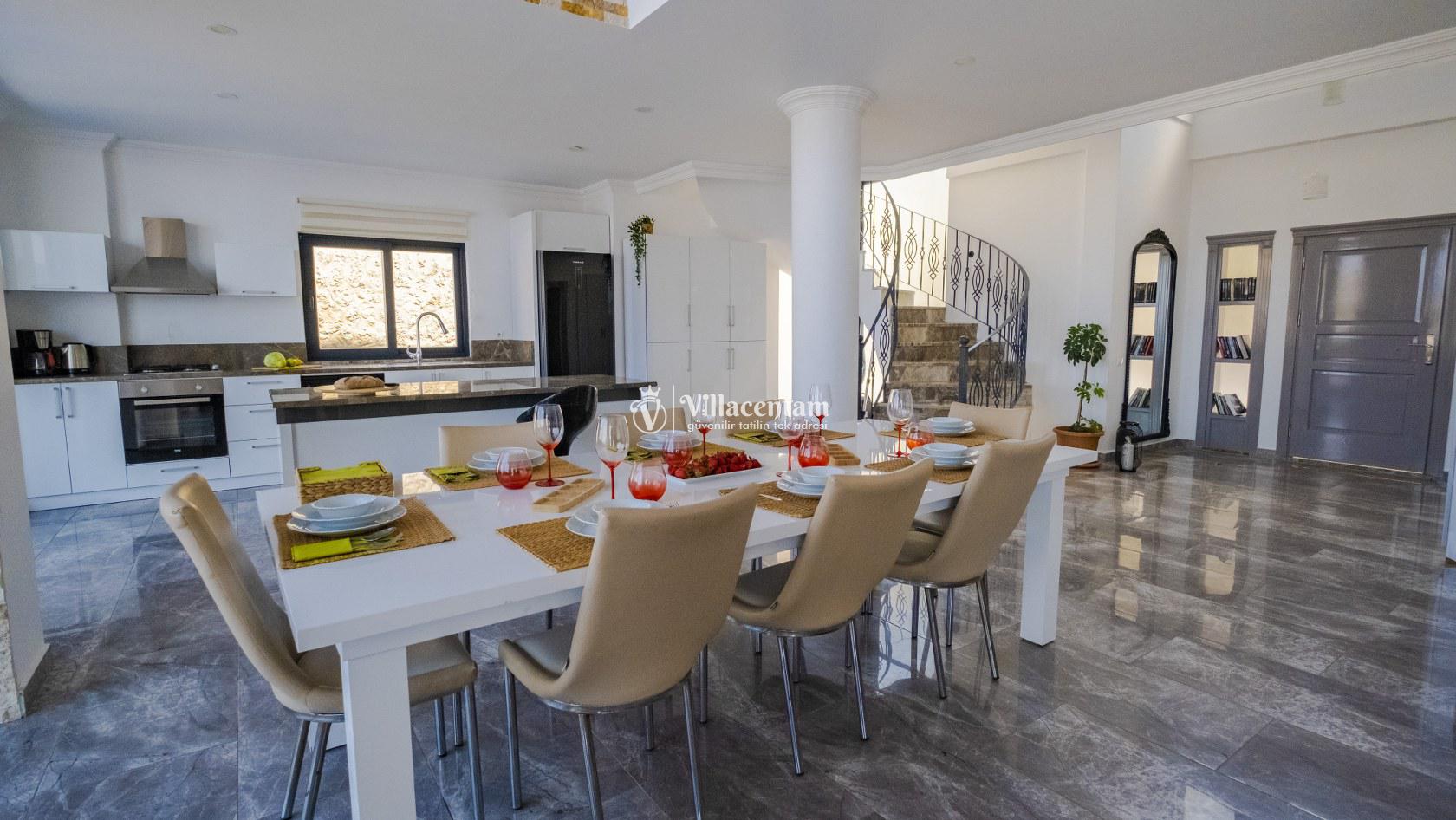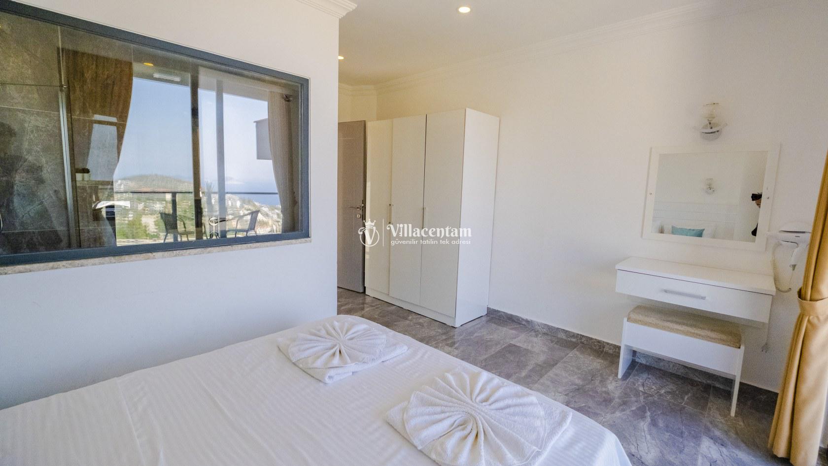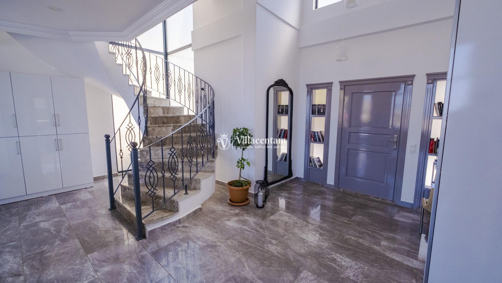 Villa Şelale 1, Antalya’nın gözde tatil merkezlerinden Kalkan’da, panoramik deniz manzarasına hâkim konumuyla lüks ve konforu bir arada sunan özel bir tatil villasıdır. Toplam 5 suit yatak odası ve 10 kişilik konaklama kapasitesi sayesinde geniş aileler ve arkadaş grupları için ideal olan villa, modern mimarisi ve ferah yaşam alanlarıyla ayrıcalıklı bir tatil deneyimi yaşatır. Deniz manzaralı geniş salonu, şık oturma grubu ve tam donanımlı açık mutfağı ile günün her anında rahat ve keyifli vakit geçirmenize olanak tanır. Villanın her biri özel banyolu yatak odaları konfor ön planda tutularak tasarlanmış olup, bazı odalardan havuz terasına veya balkona doğrudan çıkış imkânı bulunmaktadır. Dış alanda yer alan özel yüzme havuzu ve çatı katındaki ikinci havuz, gün boyu güneşlenme ve manzaranın tadını çıkarma fırsatı sunarken; şezlonglar, oturma alanları, barbekü köşesi ve masa tenisi gibi detaylar tatilinizi daha keyifli hale getirir. Kalkan merkeze ve sosyal alanlara yakın konumuyla hem sakin hem de ulaşımı kolay bir tatil imkânı sunan Villa Şelale 1, deniz manzaralı, geniş ve konforlu bir villa tatili arayan misafirler için kusursuz bir seçenektir.