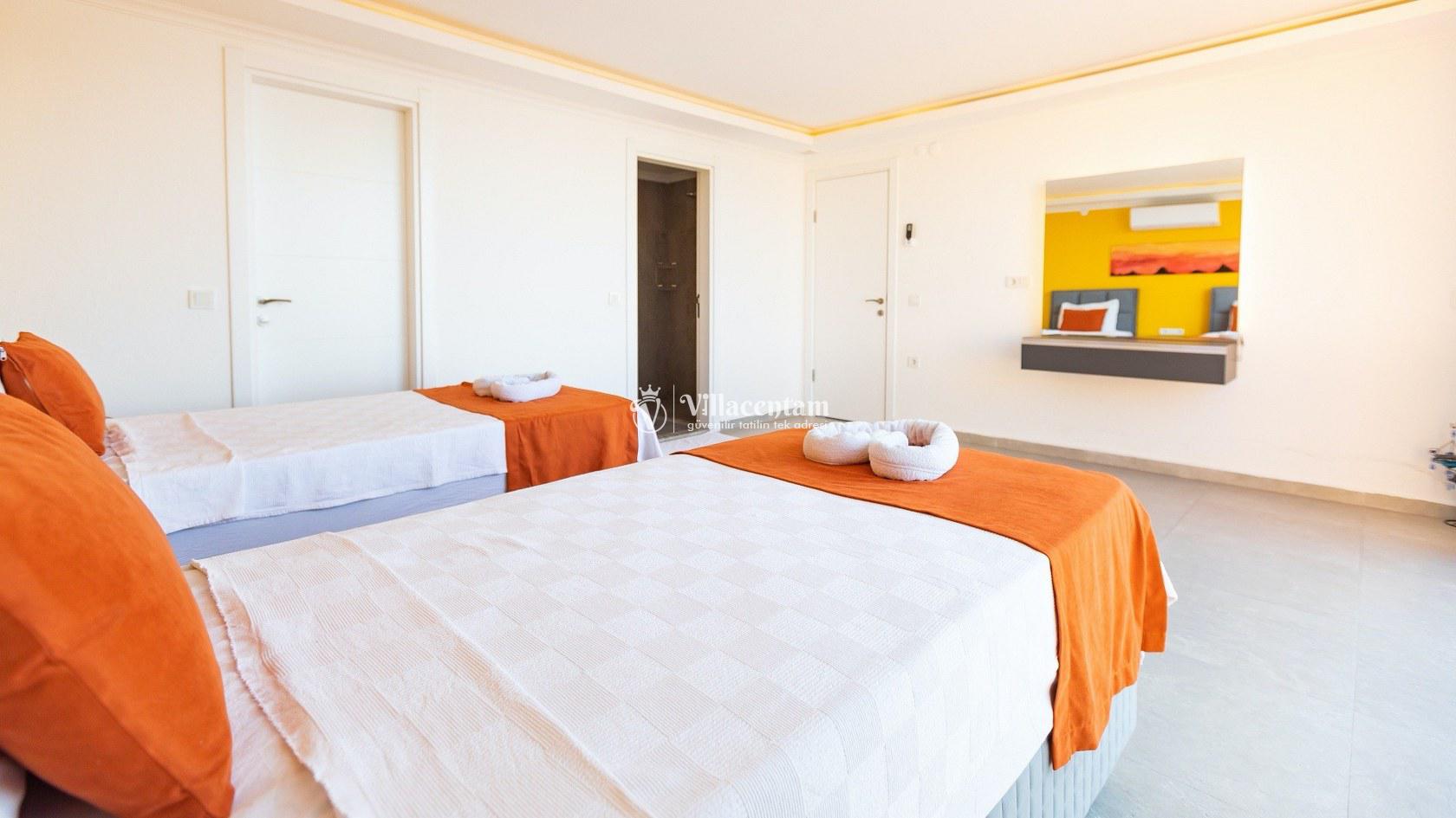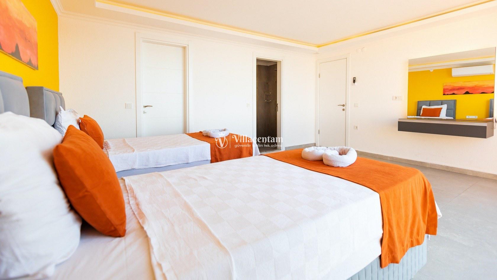 *Villalarda sıcak su için güneş enerjili su ısıtma sistemleri kullanılmaktadır. Çok yoğun sıcak su kullanımında, yoğunluğa ve su tankının büyüklüğüne bağlı olarak su tankında sıcak su tükenebilmekte ve tekrar suyun ısınması için belirli bir süre geçmesi gerekmektedir. Bu not sadece bu villa ile ilgili değil, tüm villalarımız için geçerli bir durumdur.