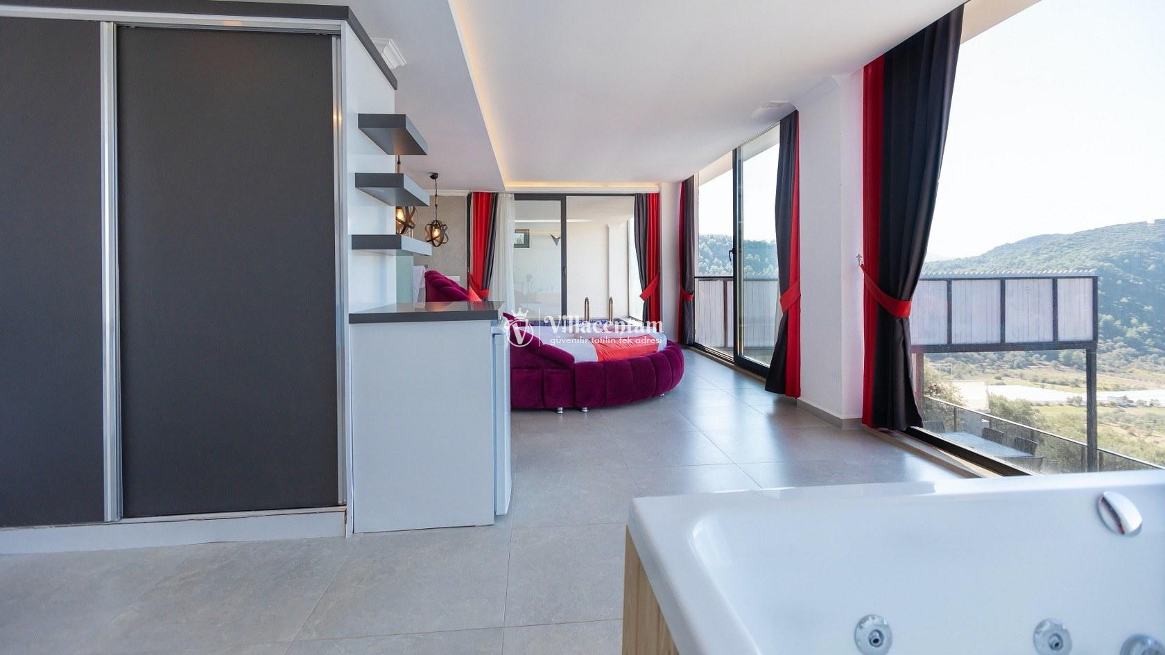 Villada iki adet jakuzi bulunur; bu özellik tatilinize ekstra bir dinlenme ve keyif unsuru katar. Dış mekandaki korunaklı özel havuz çevresi, güneşlenme ve dinlenme alanları ile birlikte açık havada rahat vakit geçirmenize imkan verir.
