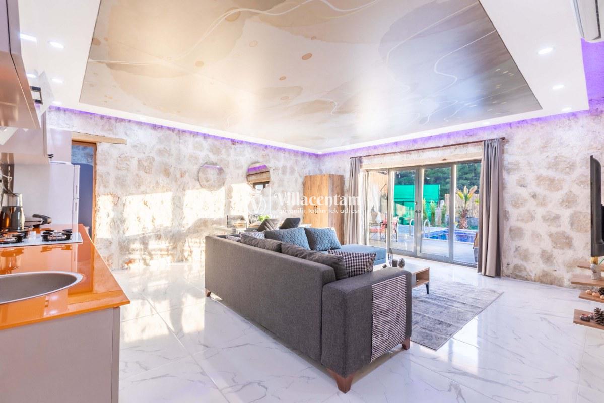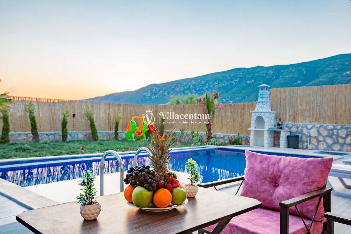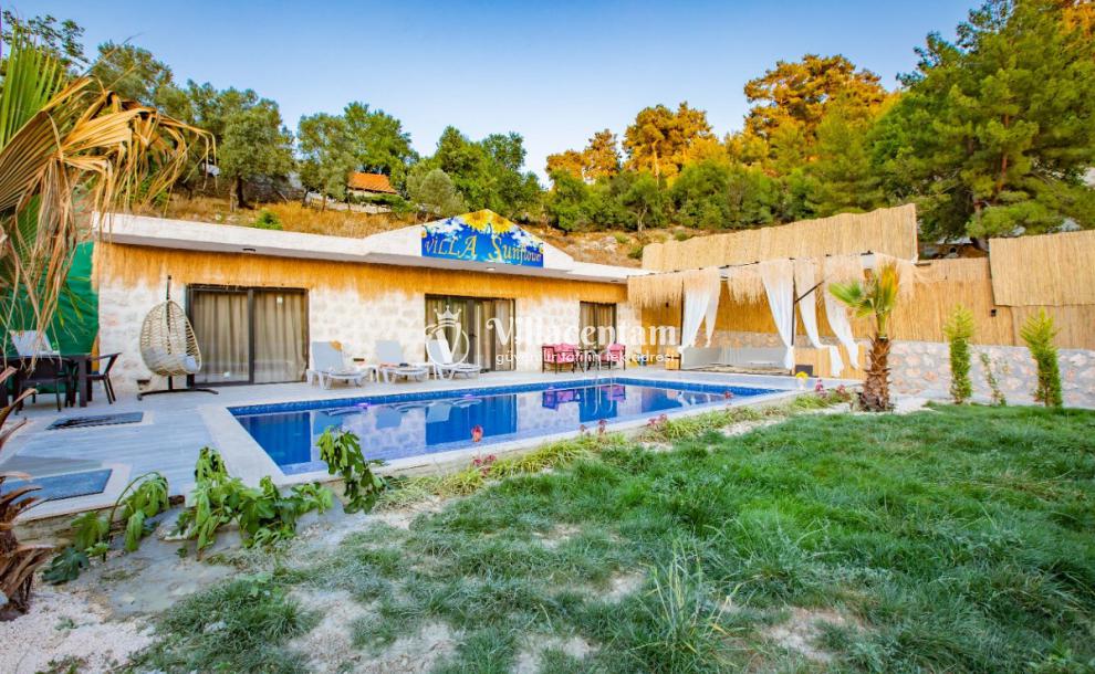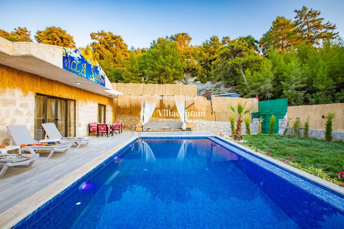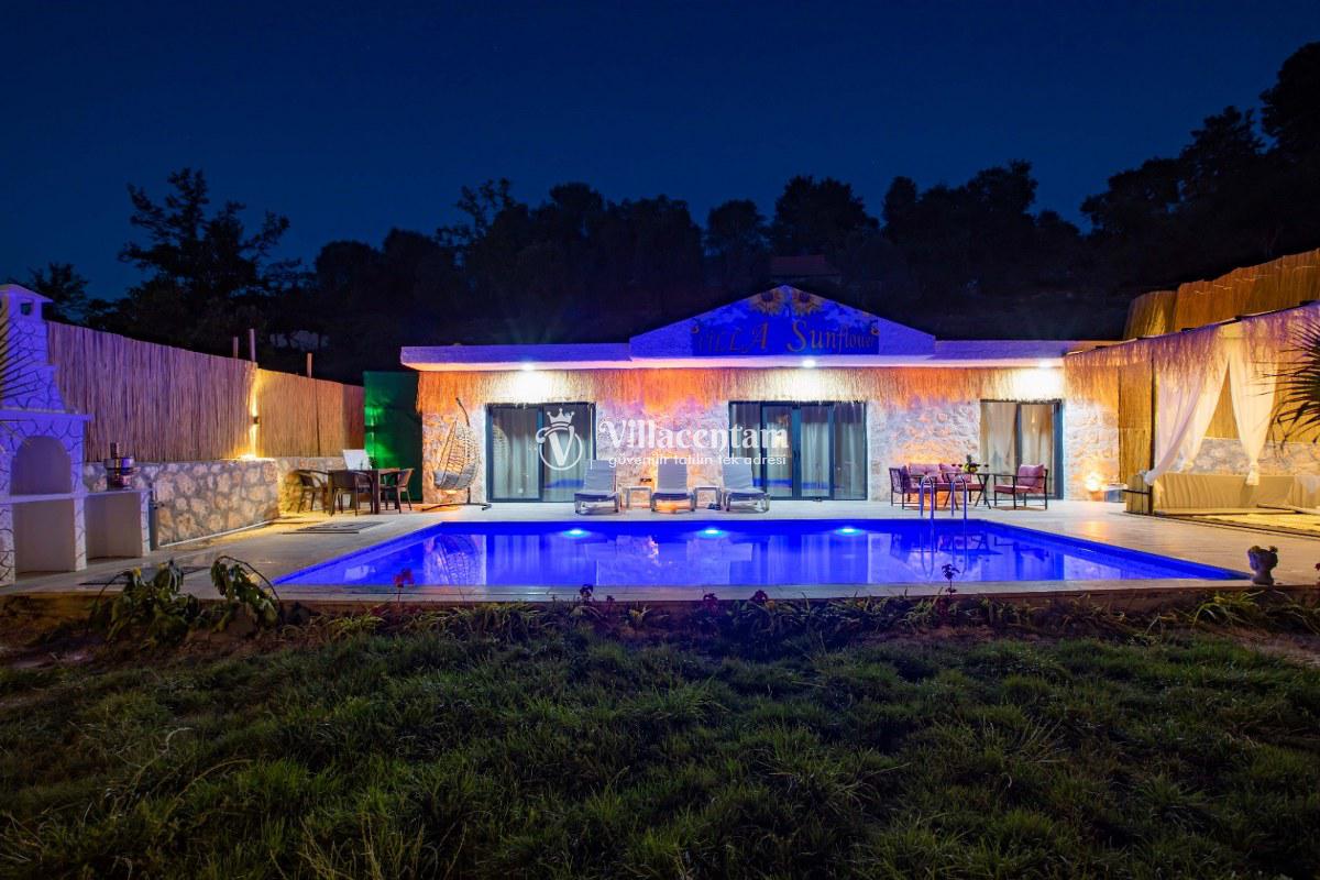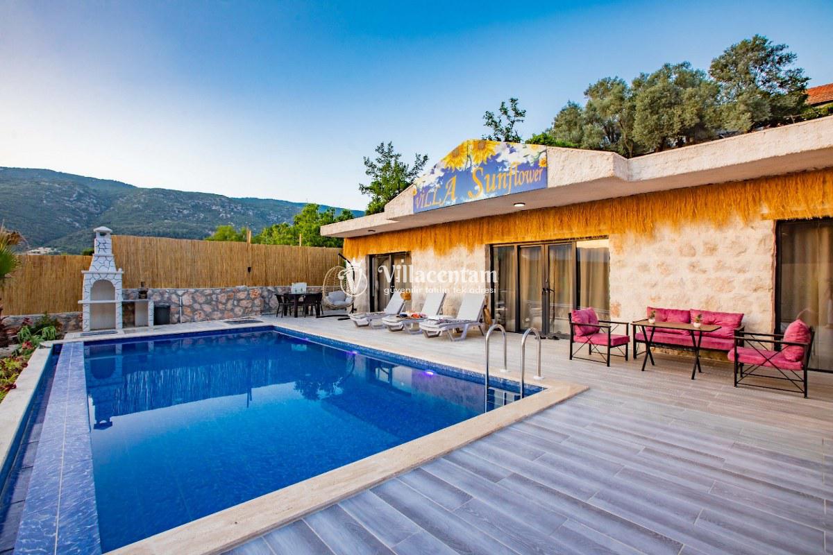 Villa Sunflower Uno, Kalkan Sarıbelen köyünde konumlanmakta olan yeşilliklerle kaplı doğa manzarasına hakim, taş yapı mimarisi ile otantik bir görünüme sahip kiralık villalarımız arasında yer almaktadır. Modern ve konforlu bir şekilde dekore edilen yazlık villamızda 2 adet yatak odası bulunmakta olup, 4 kişiye konaklama imkanı sağlamaktadır. Yatak odalarından bir tanesinin içerisinde tüm yılın vermiş olduğu yorgunluğu giderebileceğiniz jakuzi yer almaktadır. Her bir detayın en ince ayrıntısına kadar düşünüldüğü villamızda çocuklar için uygun mini oyun alanı mevcuttur. Havuz ve havuz terası korunaklı hale getirilen kiralık villamızı muhafazakar aileler, balayı çiftleri ve çekirdek aileler rahatlıkla tercih edebilirler. Sessizlik ve sakinlik içerisinde huzur dolu bir yazlık villada balayı tatili için Villa Sunflower Uno’ yu tercih edebilirsiniz.