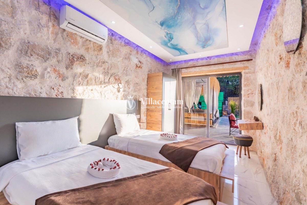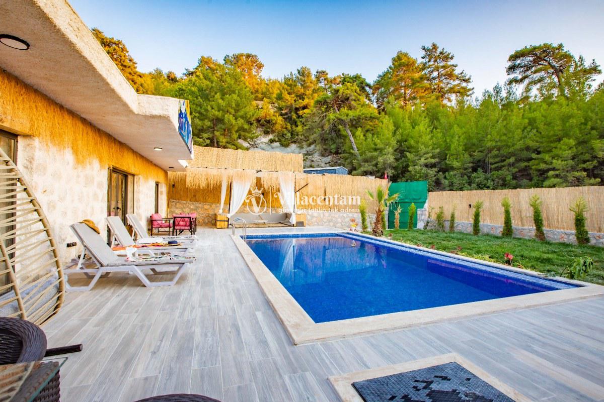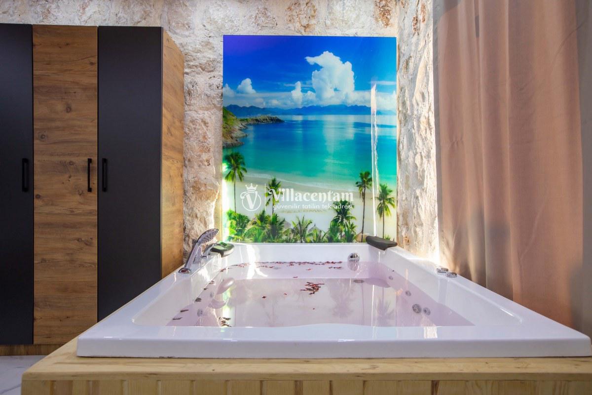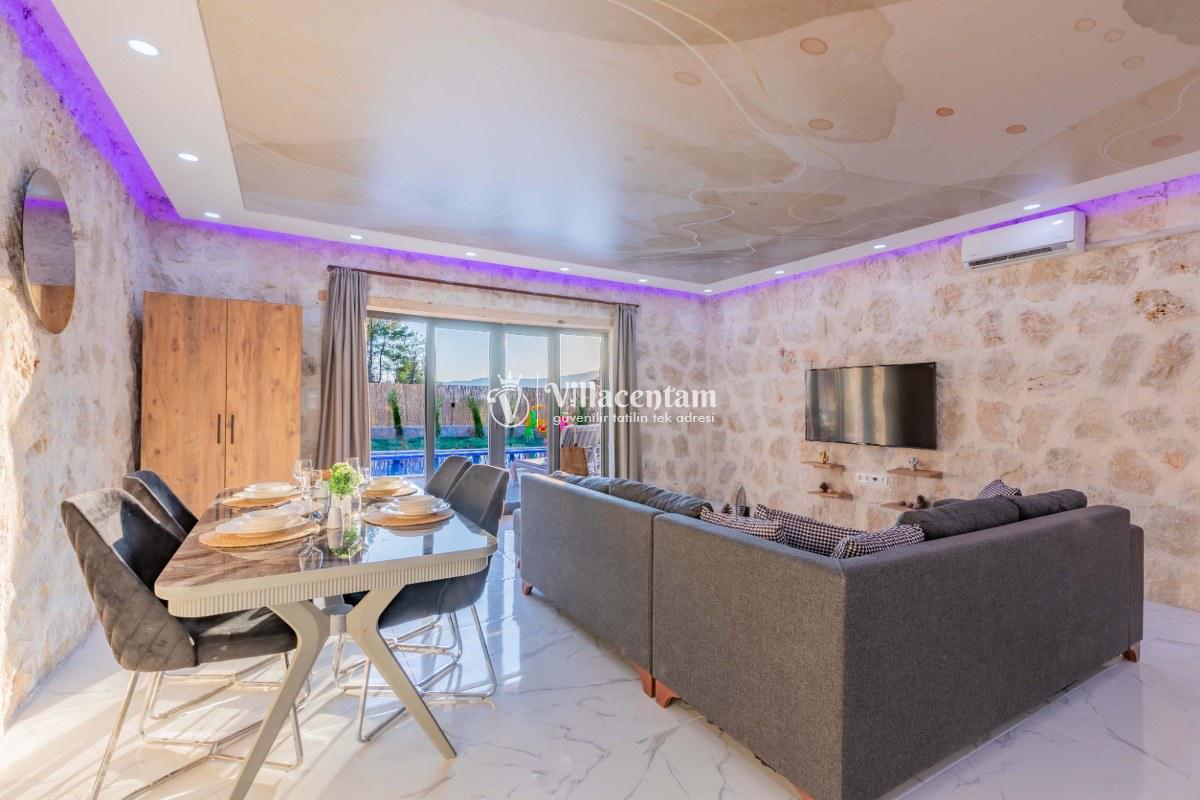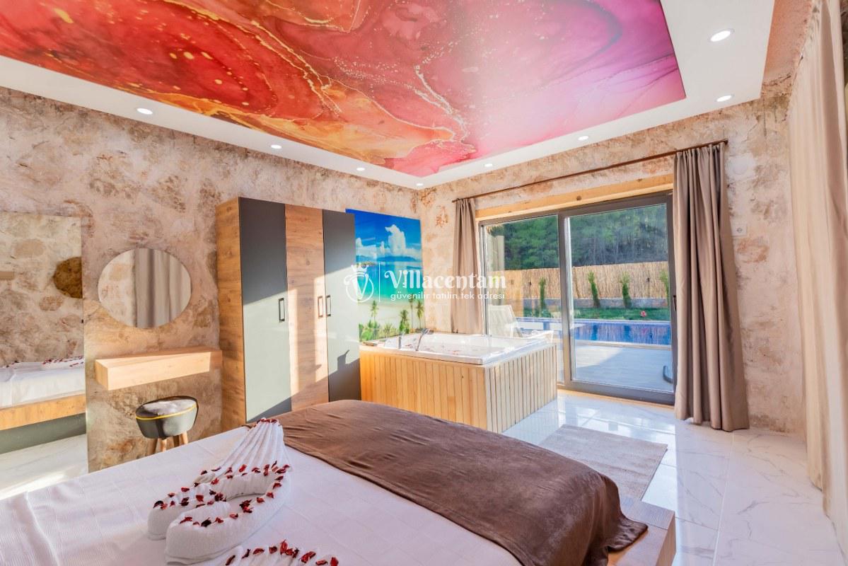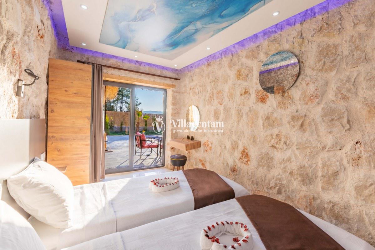 Villa Sunflower Uno, Kalkan Sarıbelen köyünde konumlanmakta olan yeşilliklerle kaplı doğa manzarasına hakim, taş yapı mimarisi ile otantik bir görünüme sahip kiralık villalarımız arasında yer almaktadır. Modern ve konforlu bir şekilde dekore edilen yazlık villamızda 2 adet yatak odası bulunmakta olup, 4 kişiye konaklama imkanı sağlamaktadır. Yatak odalarından bir tanesinin içerisinde tüm yılın vermiş olduğu yorgunluğu giderebileceğiniz jakuzi yer almaktadır. Her bir detayın en ince ayrıntısına kadar düşünüldüğü villamızda çocuklar için uygun mini oyun alanı mevcuttur. Havuz ve havuz terası korunaklı hale getirilen kiralık villamızı muhafazakar aileler, balayı çiftleri ve çekirdek aileler rahatlıkla tercih edebilirler. Sessizlik ve sakinlik içerisinde huzur dolu bir yazlık villada balayı tatili için Villa Sunflower Uno’ yu tercih edebilirsiniz.