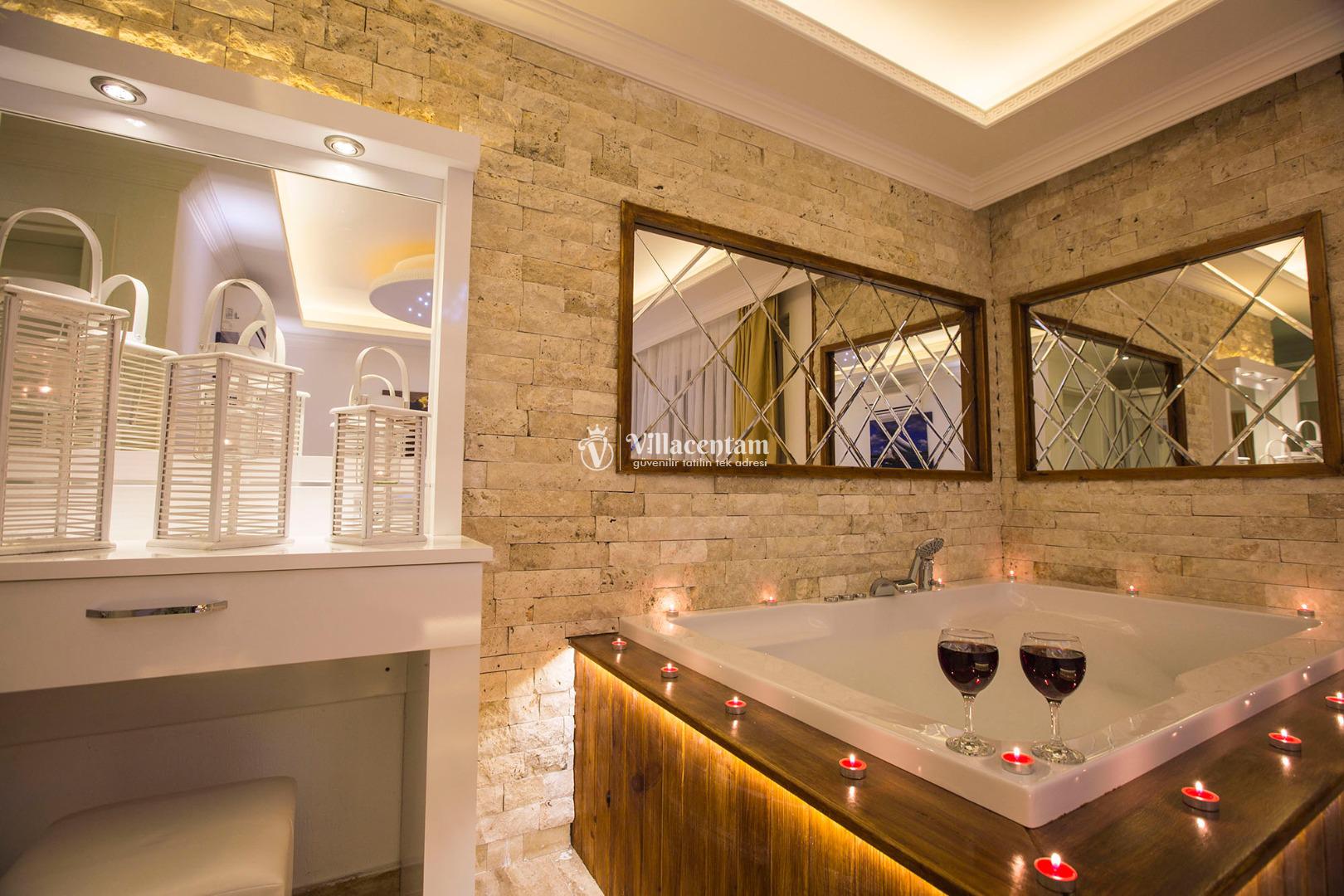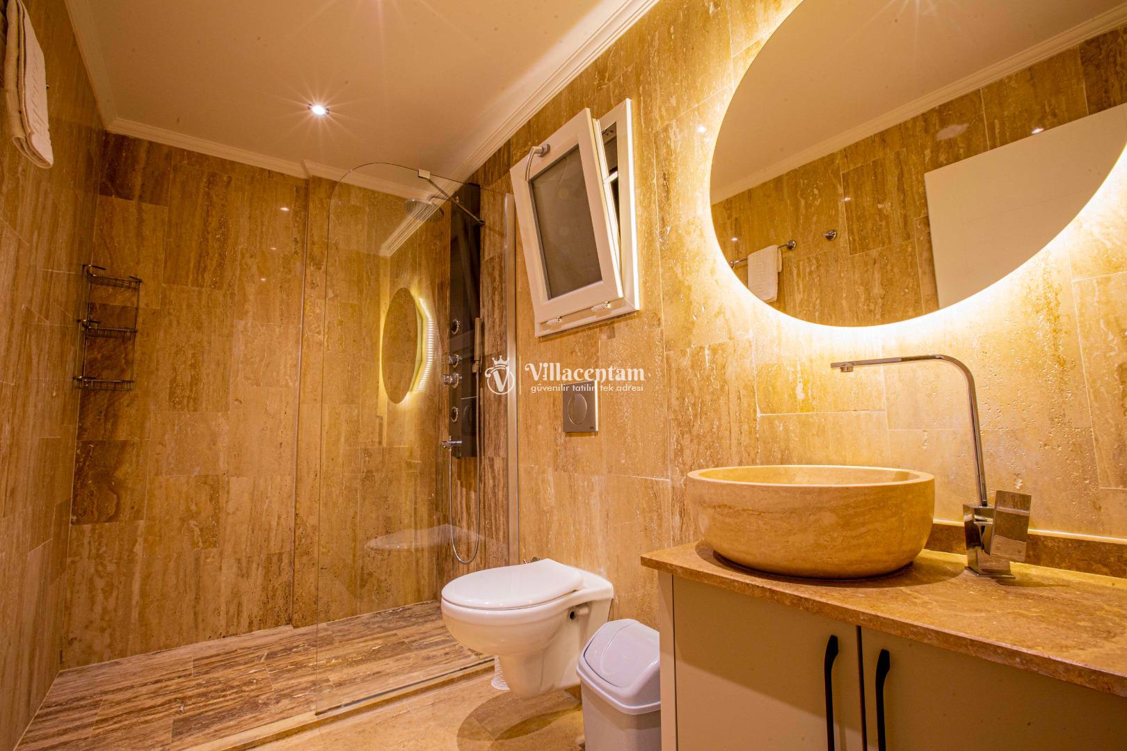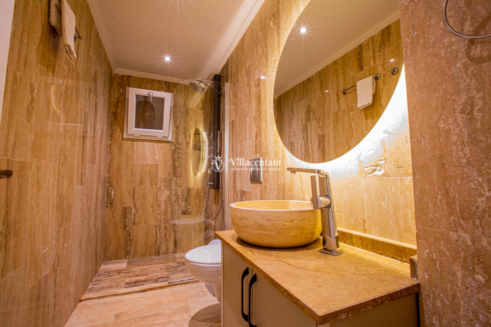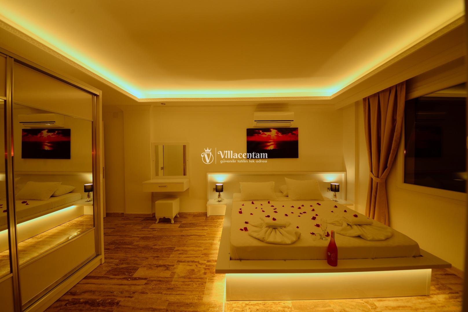 *Villalarda sıcak su için güneş enerjili su ısıtma sistemleri kullanılmaktadır. Çok yoğun sıcak su kullanımında, yoğunluğa ve su tankının büyüklüğüne bağlı olarak su tankında sıcak su tükenebilmekte ve tekrar suyun ısınması için belirli bir süre geçmesi gerekmektedir. Bu not sadece bu villa ile ilgili değil, tüm villalarımız için geçerli bir durumdur.