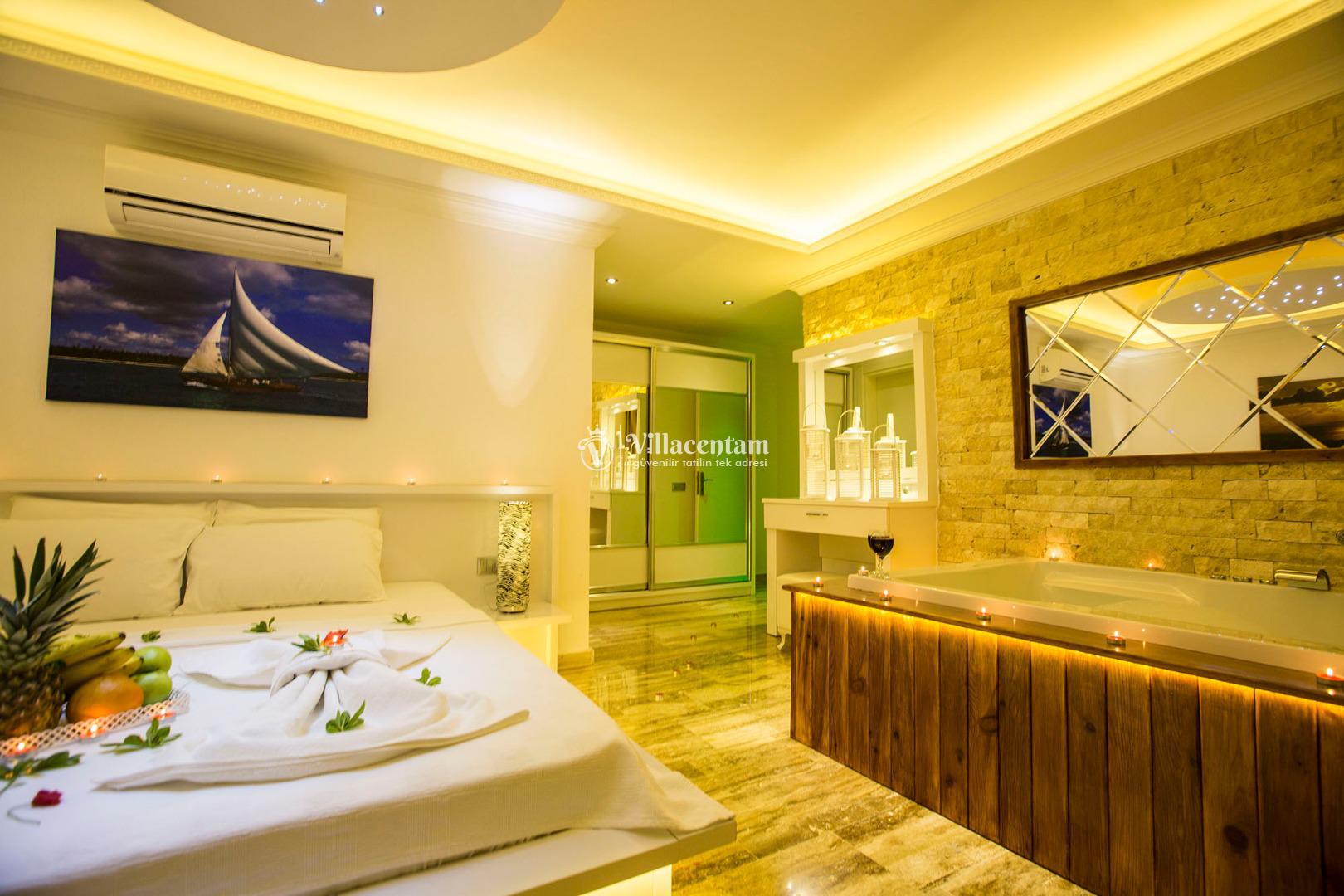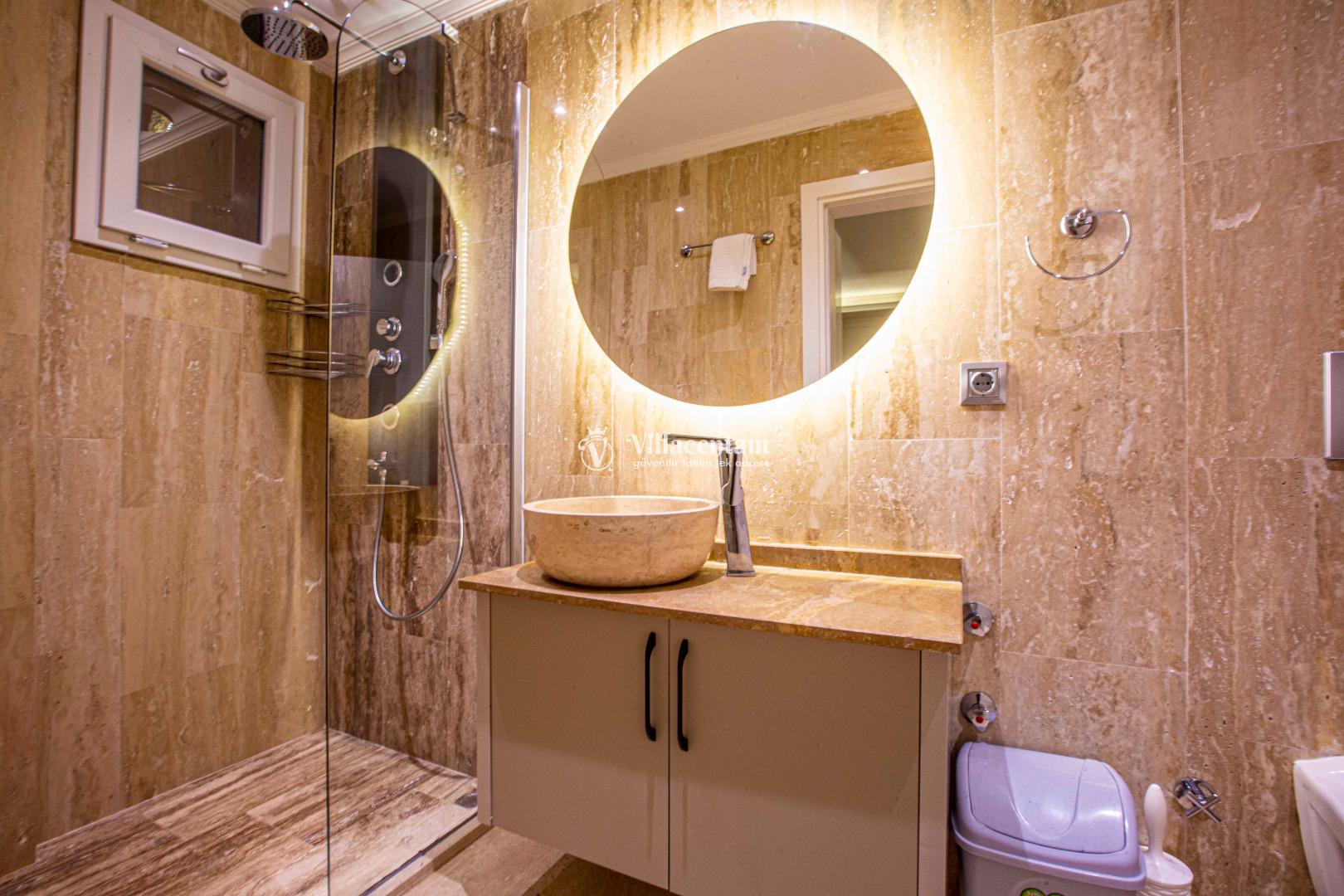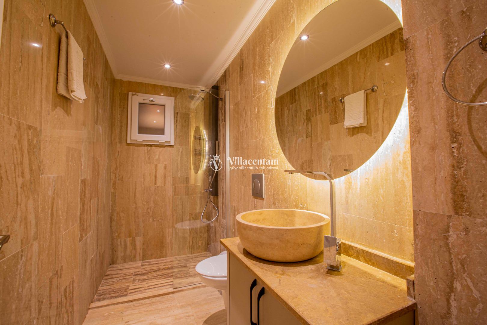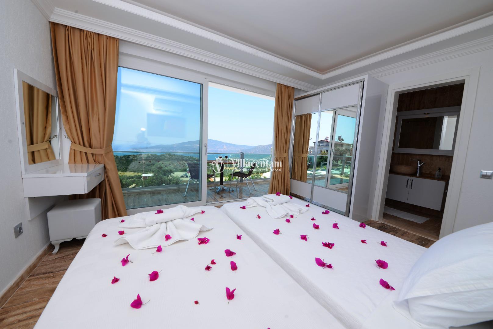 *Villalarda sıcak su için güneş enerjili su ısıtma sistemleri kullanılmaktadır. Çok yoğun sıcak su kullanımında, yoğunluğa ve su tankının büyüklüğüne bağlı olarak su tankında sıcak su tükenebilmekte ve tekrar suyun ısınması için belirli bir süre geçmesi gerekmektedir. Bu not sadece bu villa ile ilgili değil, tüm villalarımız için geçerli bir durumdur.