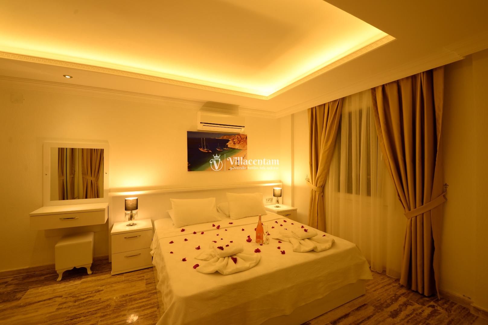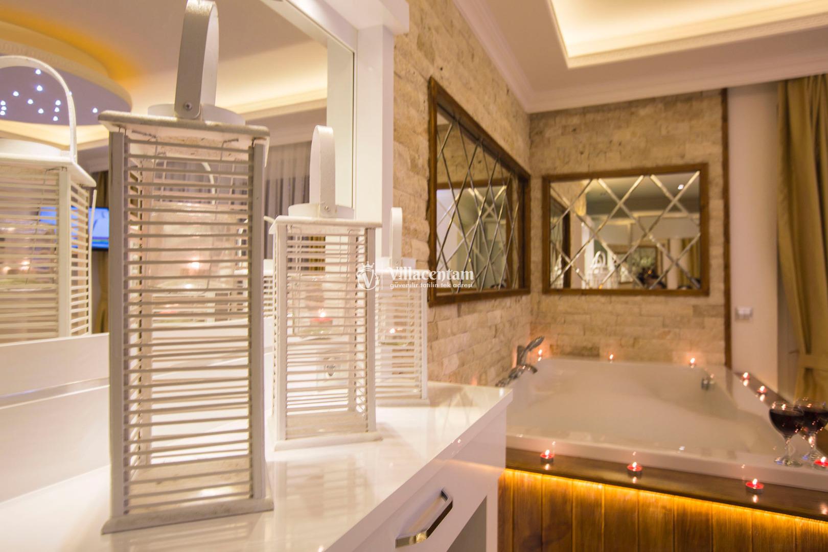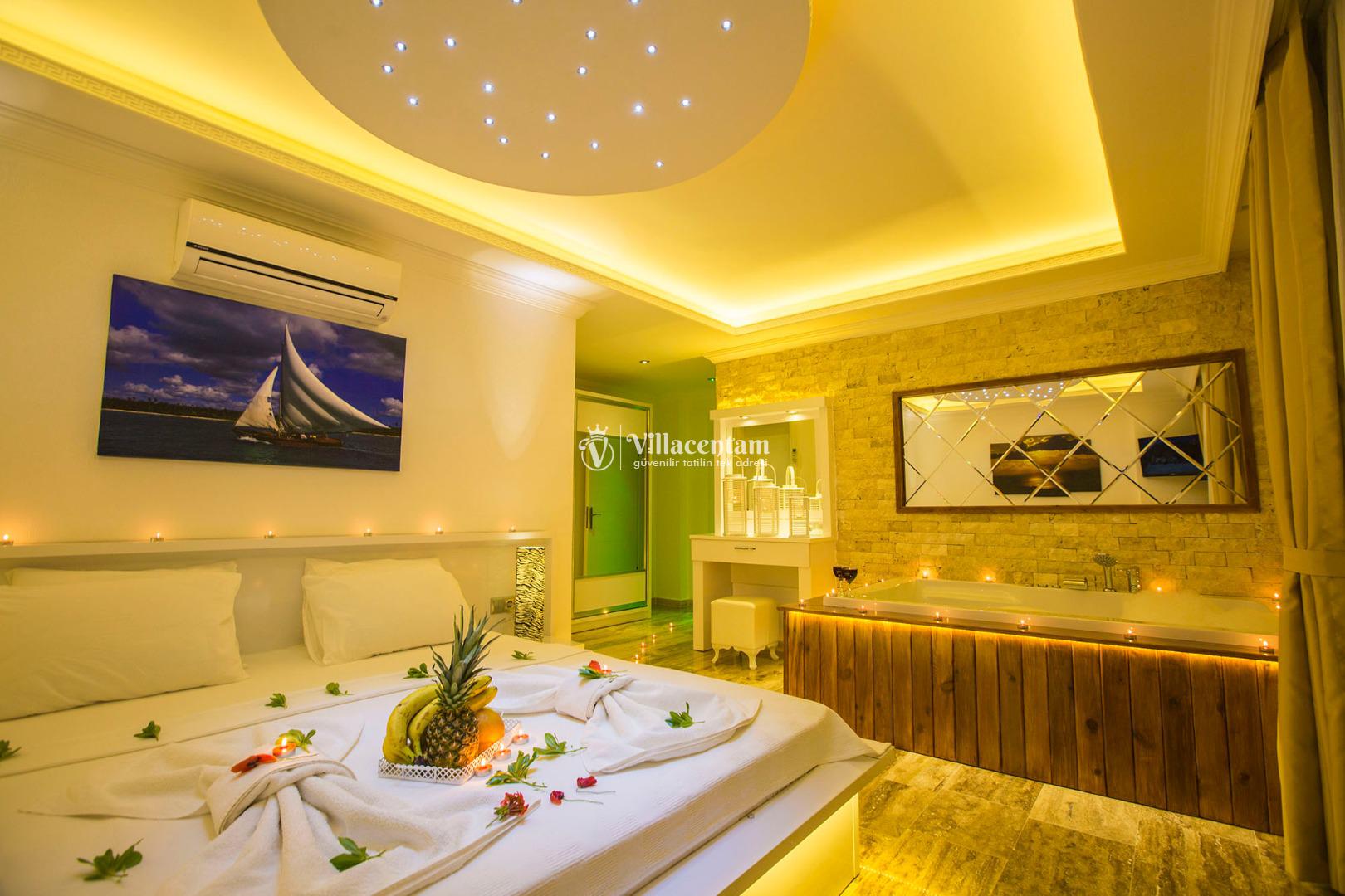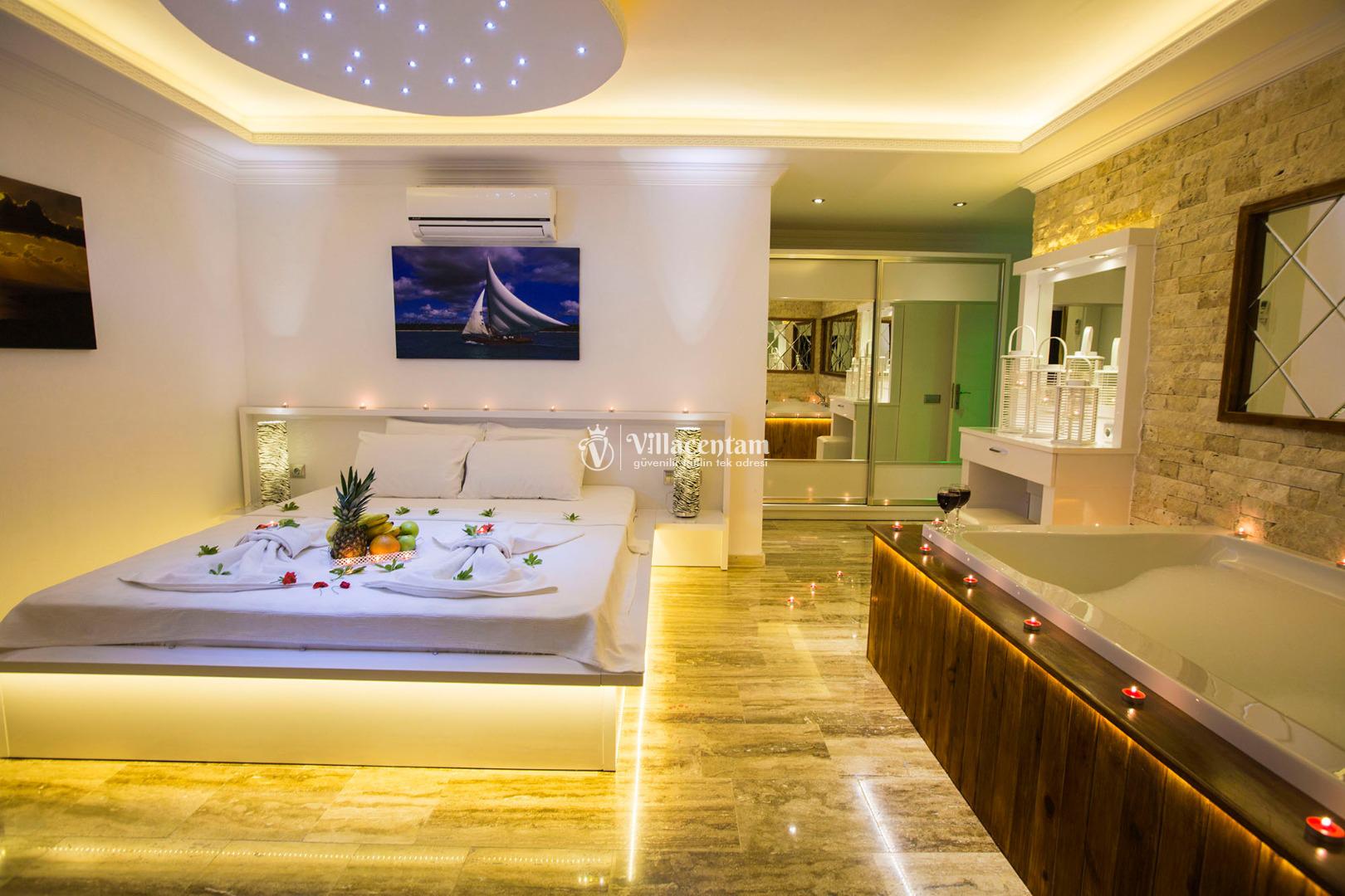 *Villalarda sıcak su için güneş enerjili su ısıtma sistemleri kullanılmaktadır. Çok yoğun sıcak su kullanımında, yoğunluğa ve su tankının büyüklüğüne bağlı olarak su tankında sıcak su tükenebilmekte ve tekrar suyun ısınması için belirli bir süre geçmesi gerekmektedir. Bu not sadece bu villa ile ilgili değil, tüm villalarımız için geçerli bir durumdur.