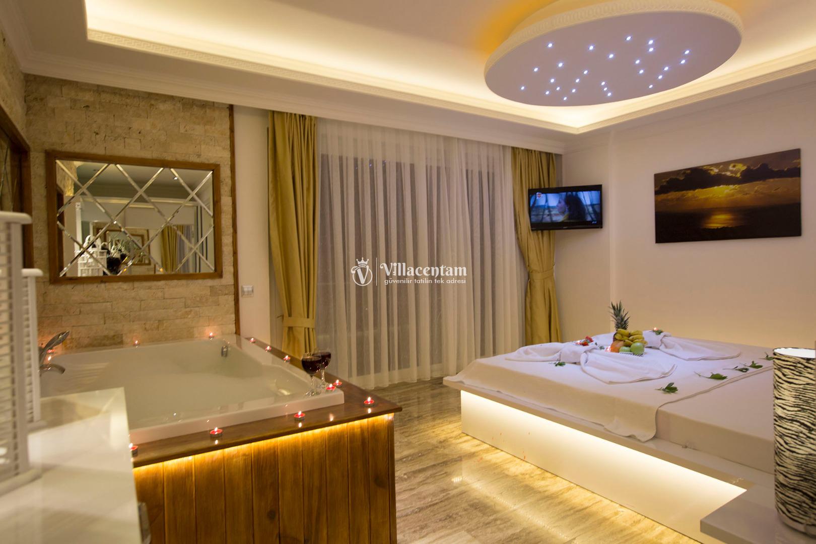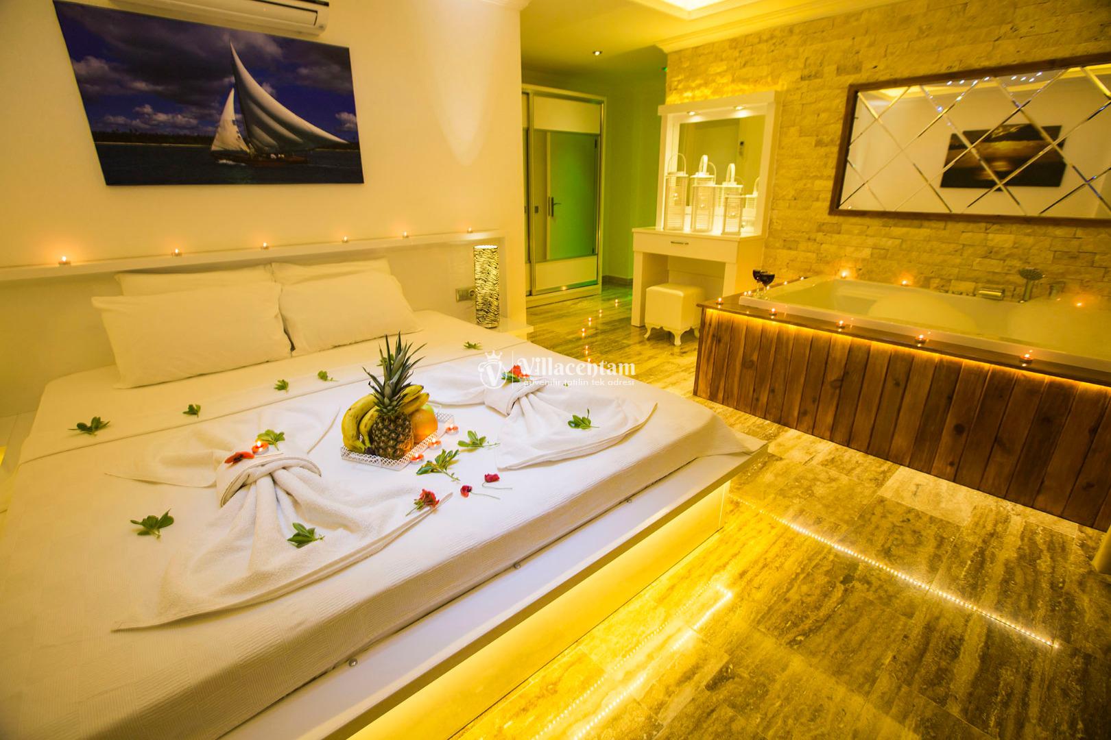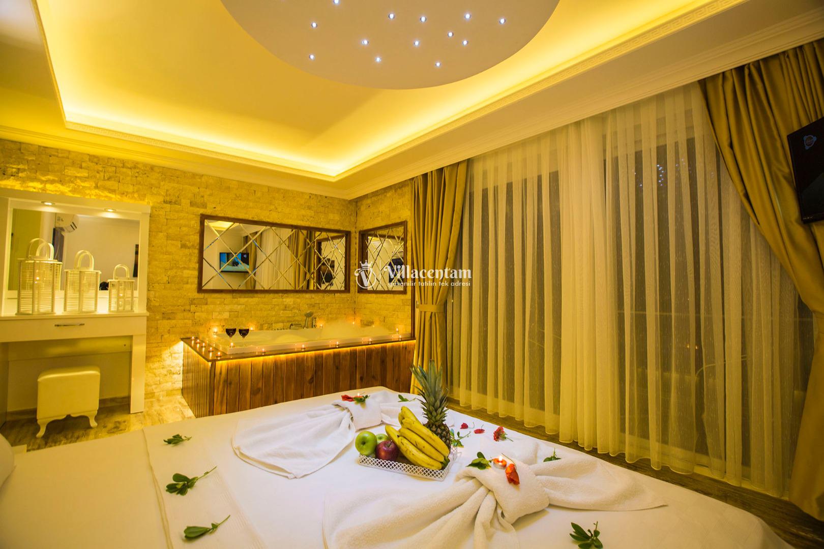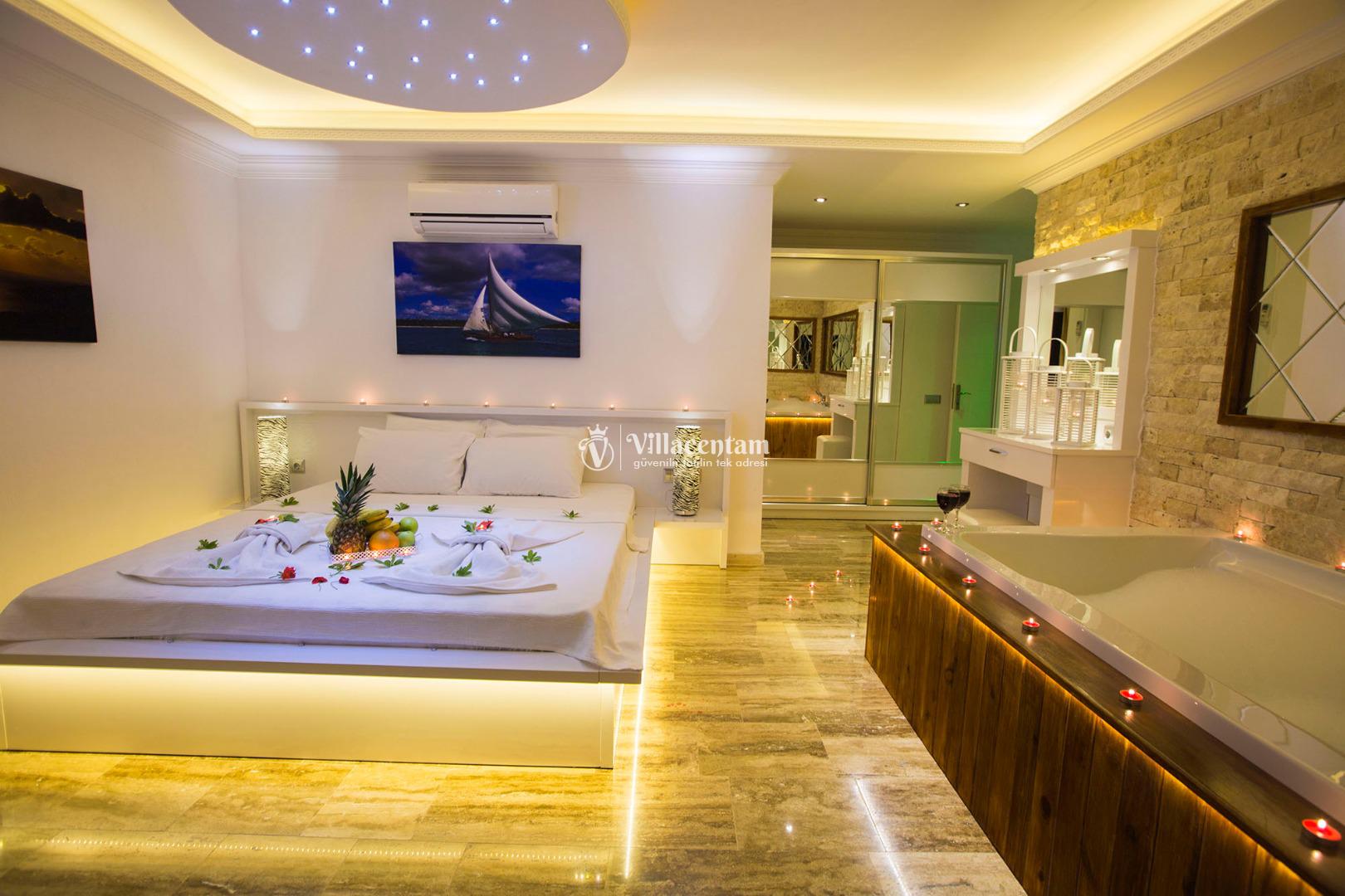 *Villalarda sıcak su için güneş enerjili su ısıtma sistemleri kullanılmaktadır. Çok yoğun sıcak su kullanımında, yoğunluğa ve su tankının büyüklüğüne bağlı olarak su tankında sıcak su tükenebilmekte ve tekrar suyun ısınması için belirli bir süre geçmesi gerekmektedir. Bu not sadece bu villa ile ilgili değil, tüm villalarımız için geçerli bir durumdur.