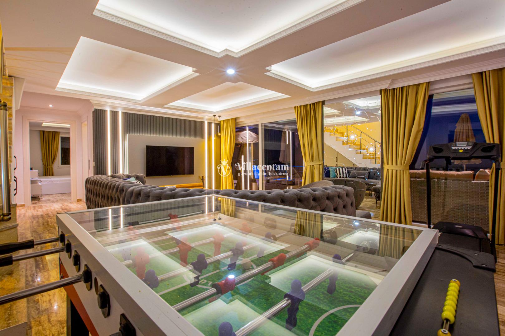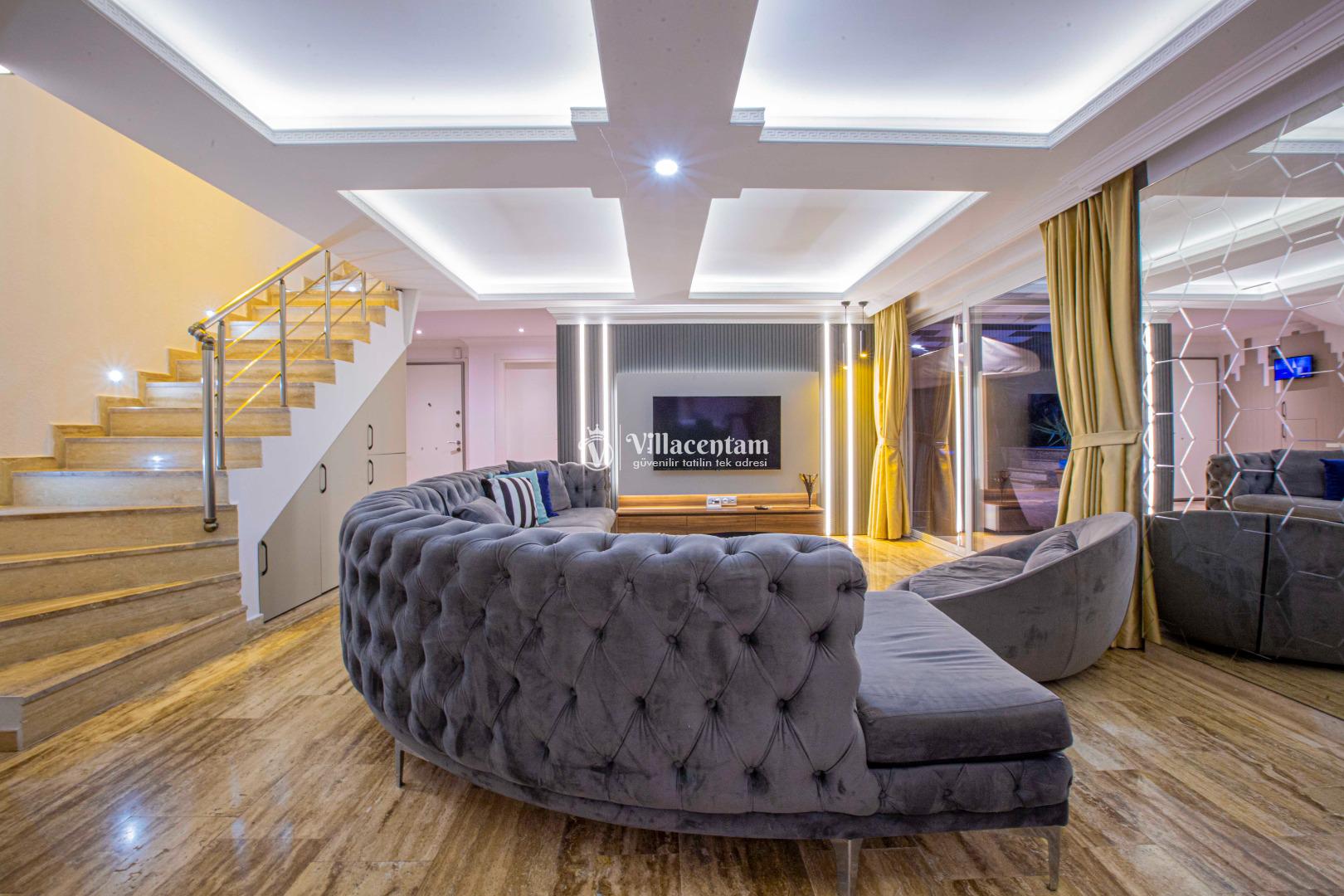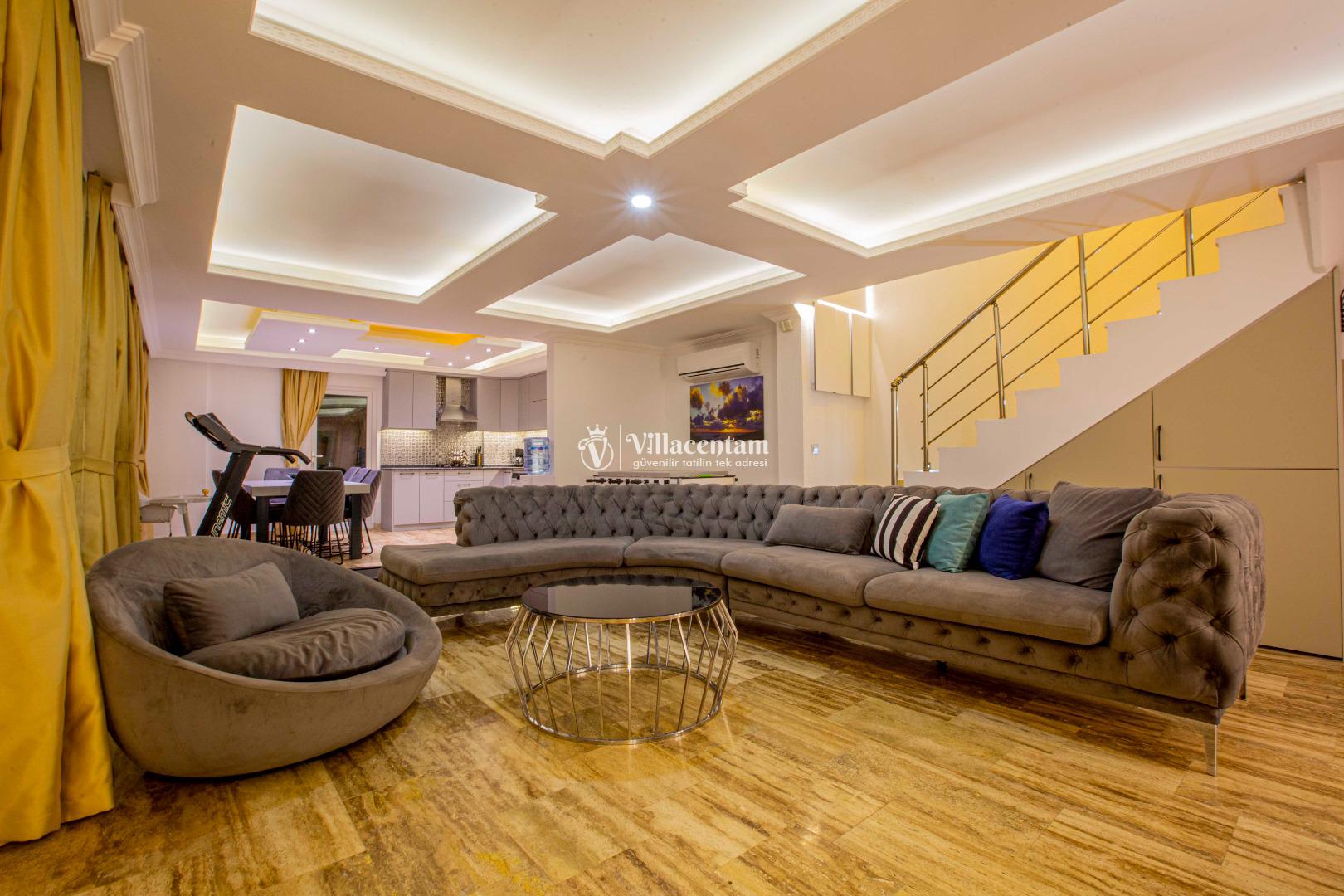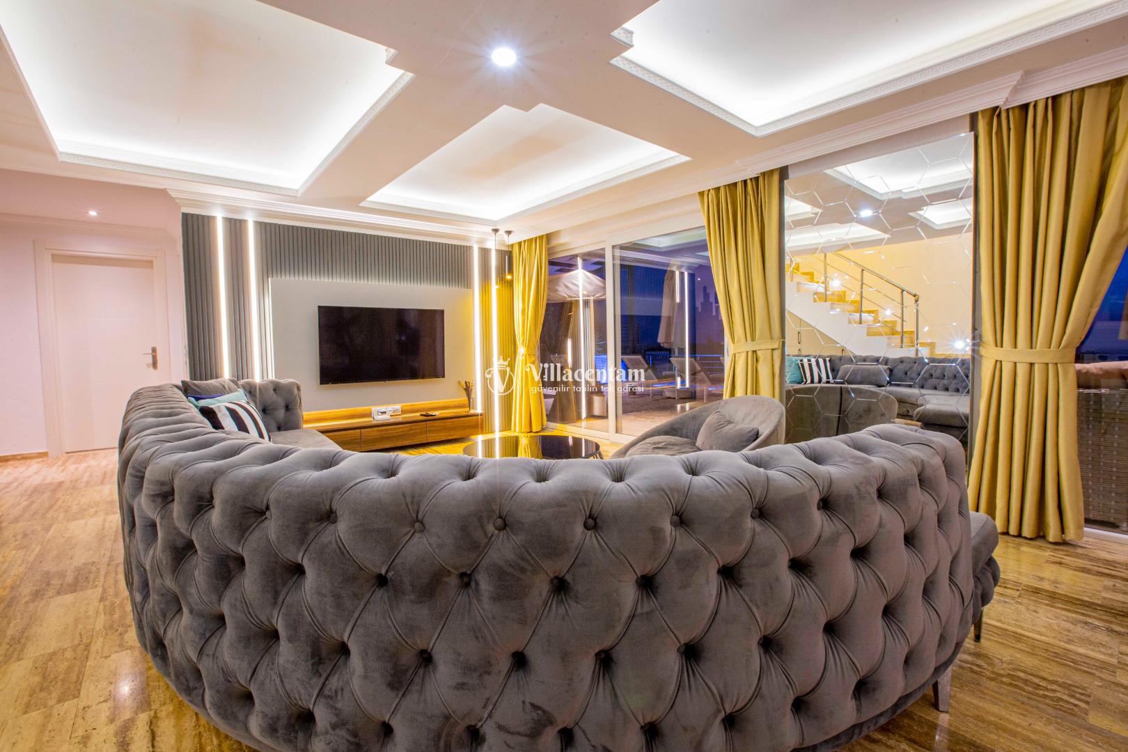 Geniş ve şık mimarisi, konforlu yaşam alanları ve özenle seçilmiş mobilyalarıyla villa, tatiliniz boyunca ihtiyaç duyabileceğiniz her detay düşünülerek hazırlanmıştır. Modern televizyon ünitesi, rahat oturma grupları ve ferah iç mekanlar sayesinde villada geçirdiğiniz her an keyfe dönüşür.