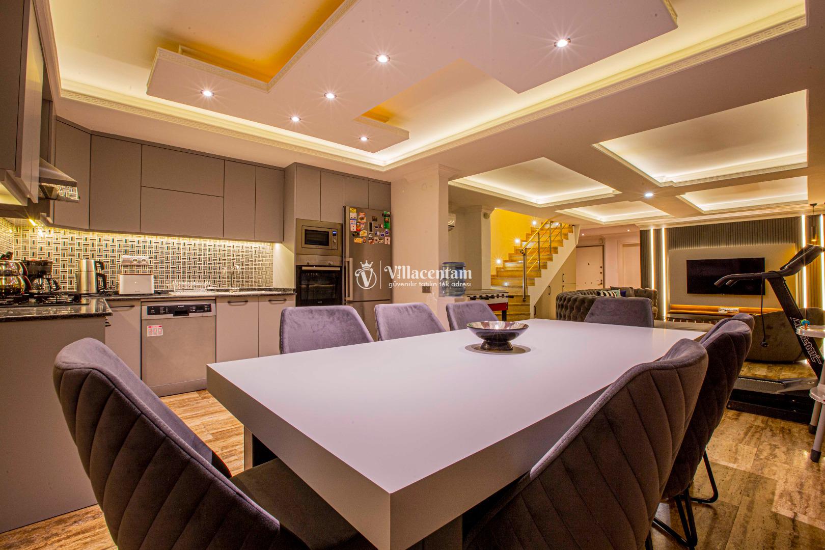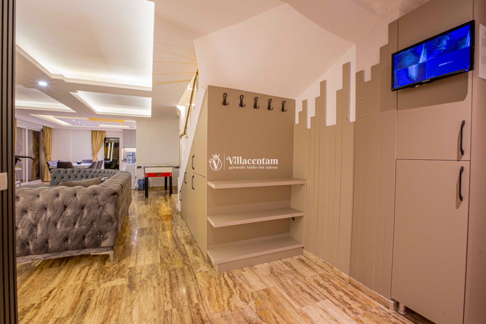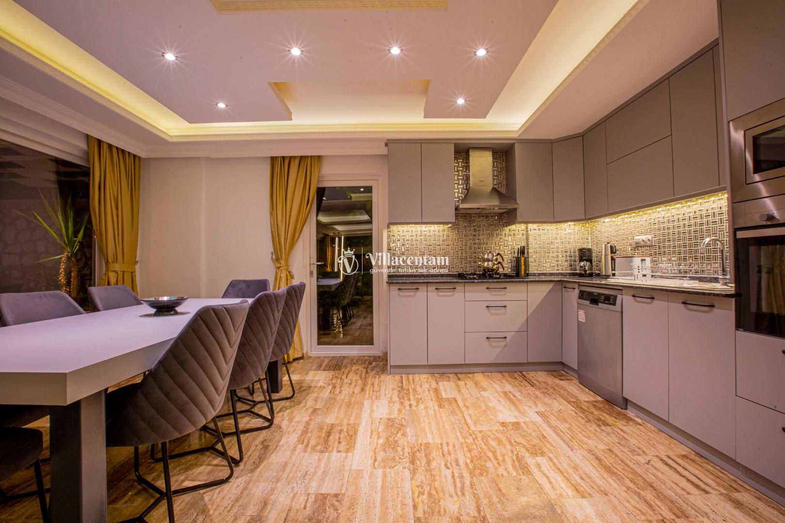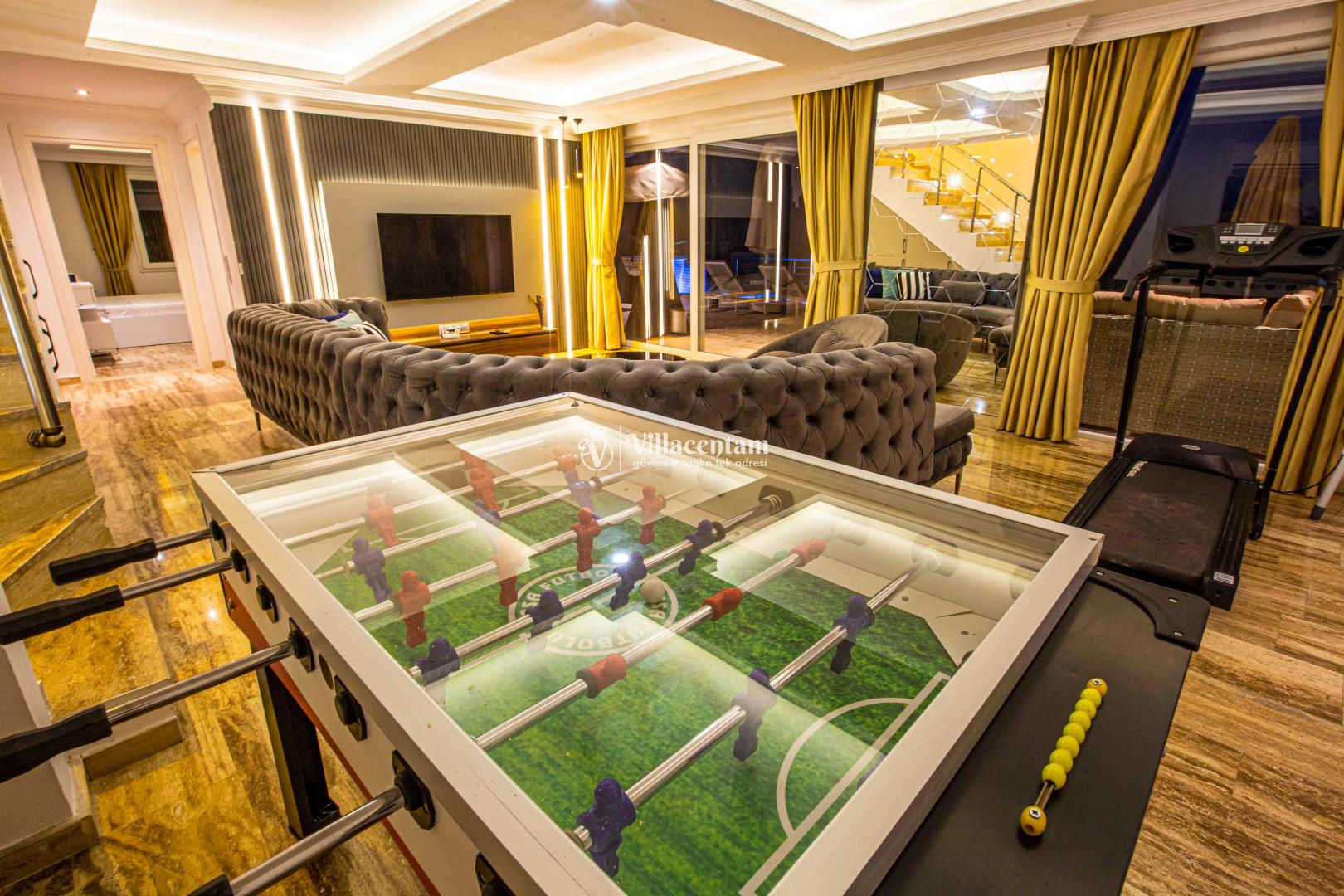 Geniş ve şık mimarisi, konforlu yaşam alanları ve özenle seçilmiş mobilyalarıyla villa, tatiliniz boyunca ihtiyaç duyabileceğiniz her detay düşünülerek hazırlanmıştır. Modern televizyon ünitesi, rahat oturma grupları ve ferah iç mekanlar sayesinde villada geçirdiğiniz her an keyfe dönüşür.