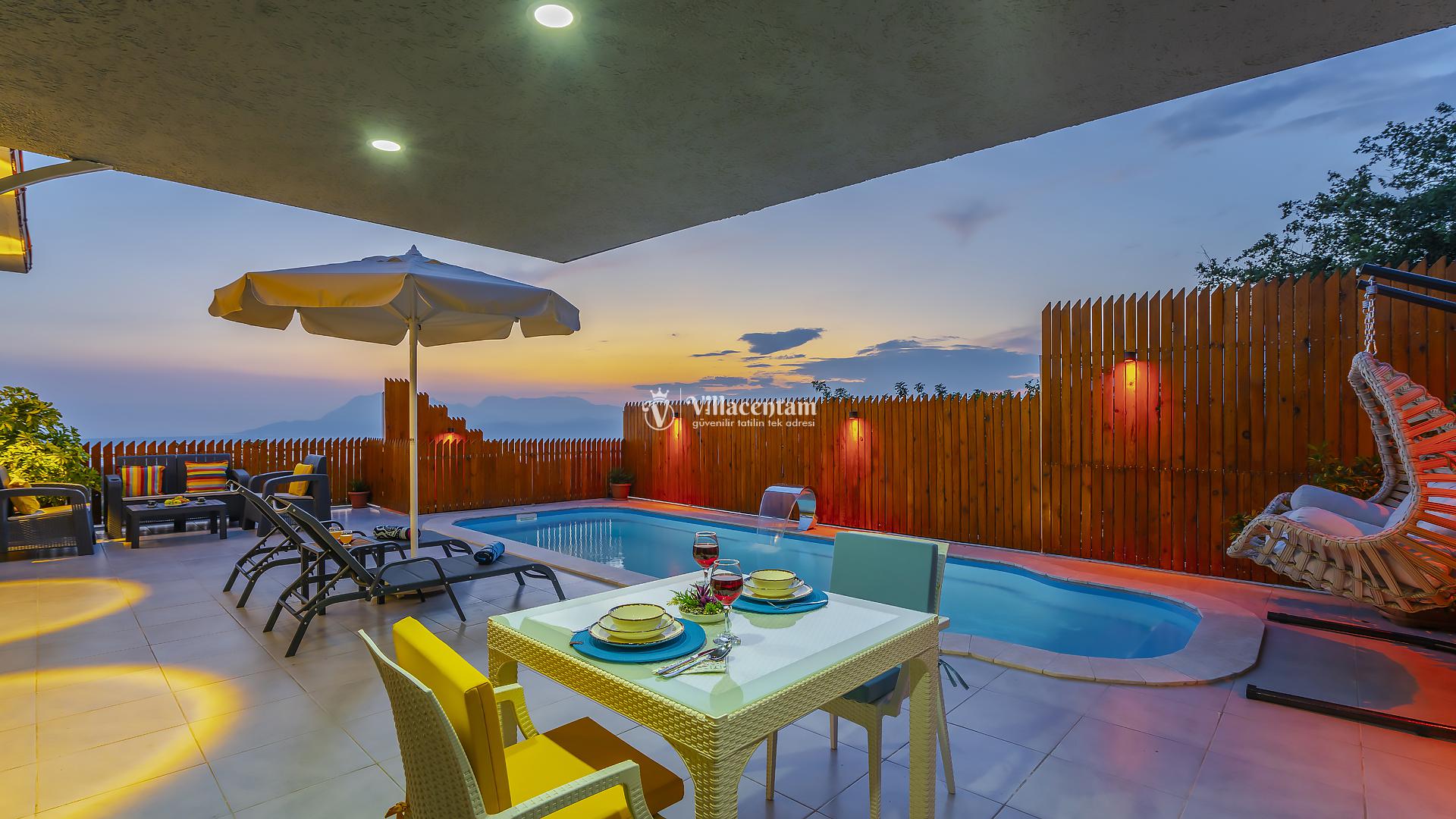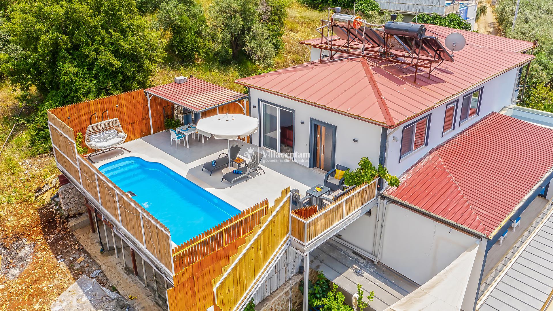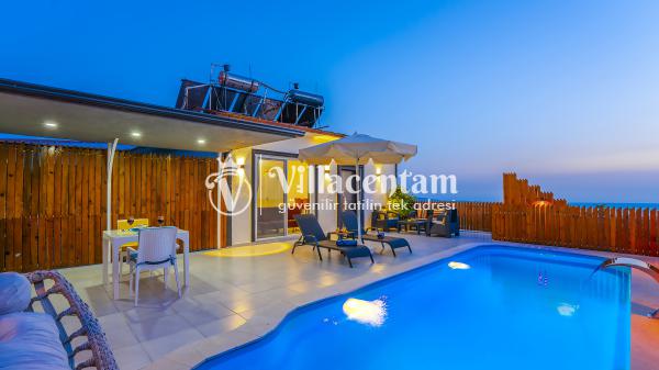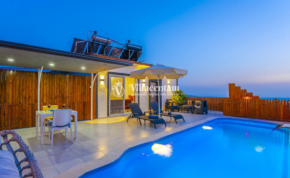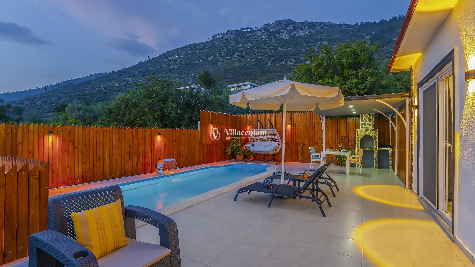 Villa Yiğit Üzümlü, Antalya’nın eşsiz tatil beldesi Kalkan’ın doğal güzellikleriyle öne çıkan Üzümlü mevkiinde konumlanan, özel havuzlu ve romantik tatil imkânı sunan zarif bir villadır. Sadece 1 yatak odası ve 2 kişilik konaklama kapasitesi ile özellikle balayı çiftleri ve huzurlu, mahremiyete önem veren tatil arayanlar için tasarlanmıştır. Villanın iç mekânı şık ve modern detaylarla döşenmiş olup, rahat salonu ve tam donanımlı mutfak bölümü günlük konforunuzu karşılar. Yatak odasında bulunan jakuzi ve sauna ile tatilinize ekstra keyif katarken, dış mekânda yer alan korunaklı özel yüzme havuzu çevresinde şezlonglar, barbekü alanı ve oturma grupları ile dinlenme ve eğlence alanı sunar. Üzümlü’nün yüksek konumu sayesinde doğanın temiz havasını soluyabilir, kuş sesleri ve yeşilin içinde sessiz bir tatilin tadını çıkarabilirsiniz; aynı zamanda denize ve Kalkan merkezine de kolay erişim imkânı bulabilirsiniz. Gözlerden uzak, romantik ve konforlu bir tatil isteyen misafirler için Villa Yiğit Üzümlü, unutulmaz bir villa tatili fırsatı sunar.