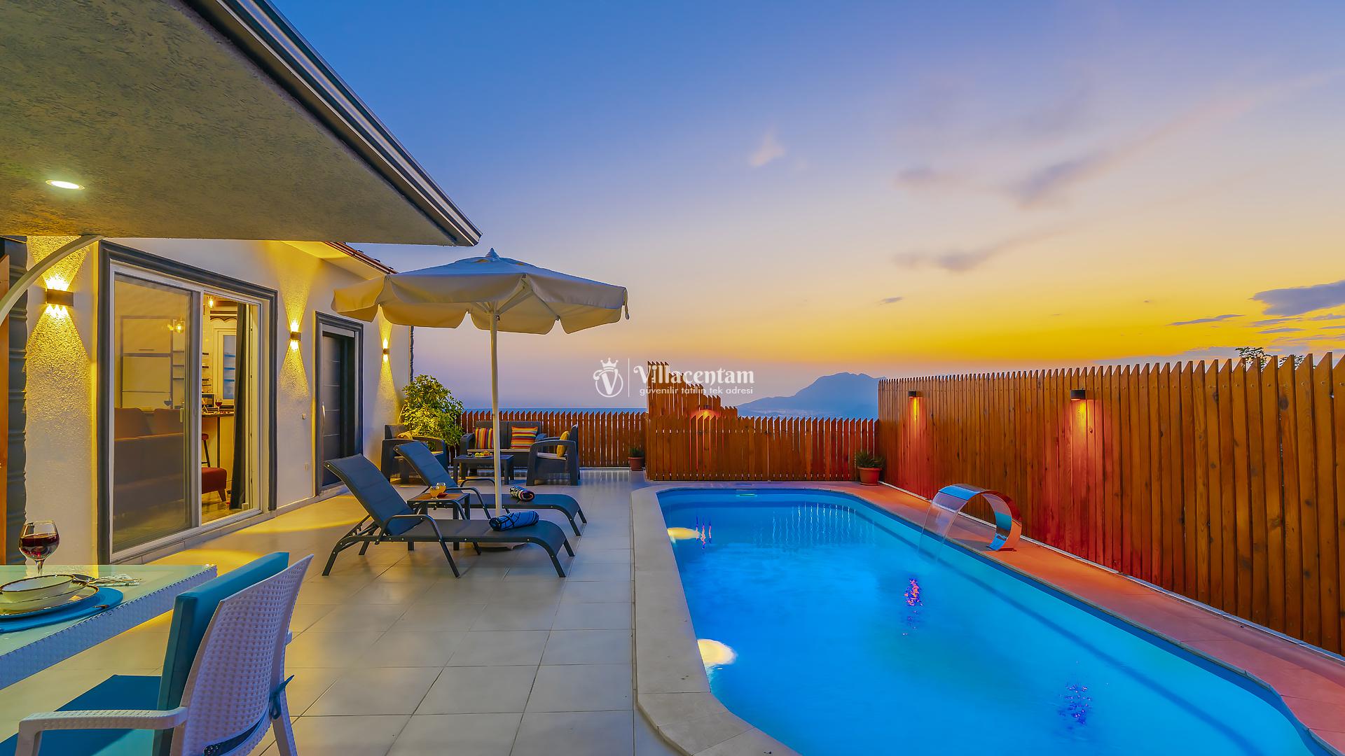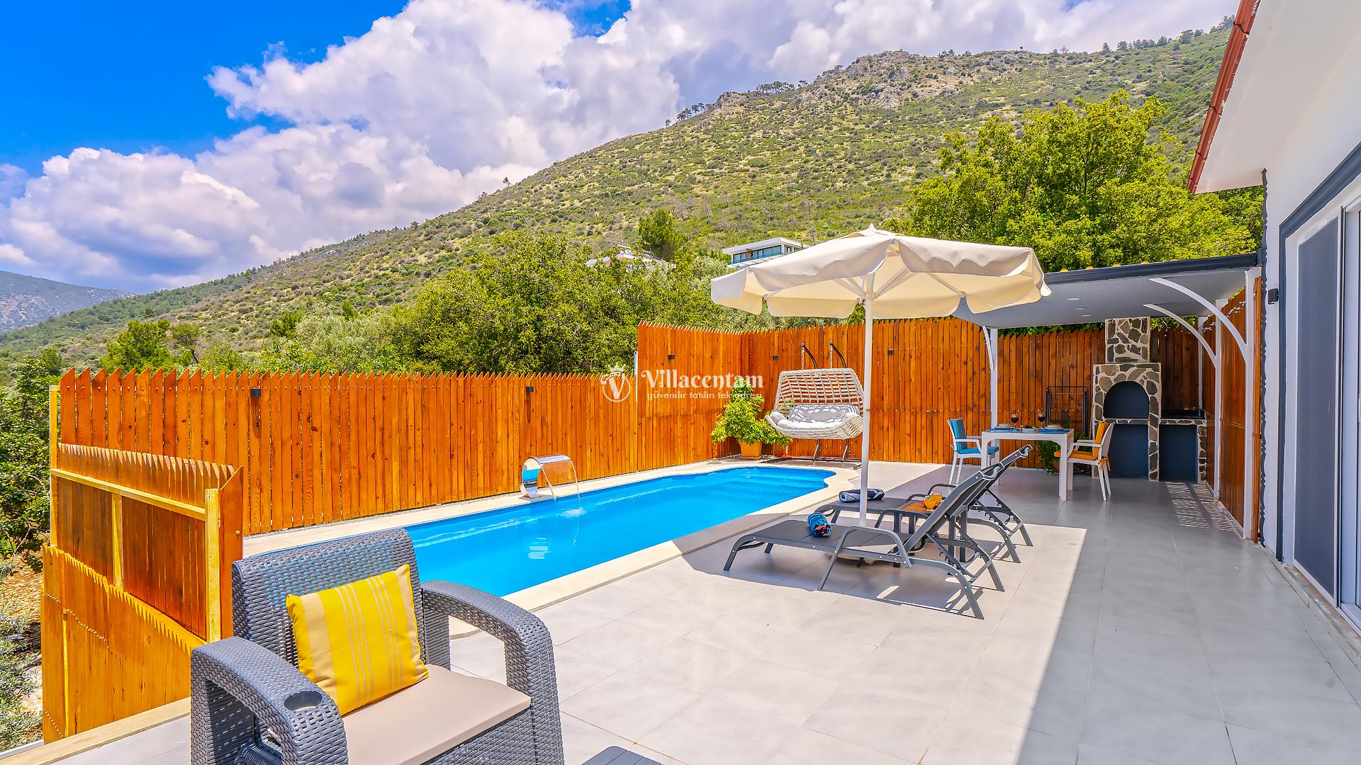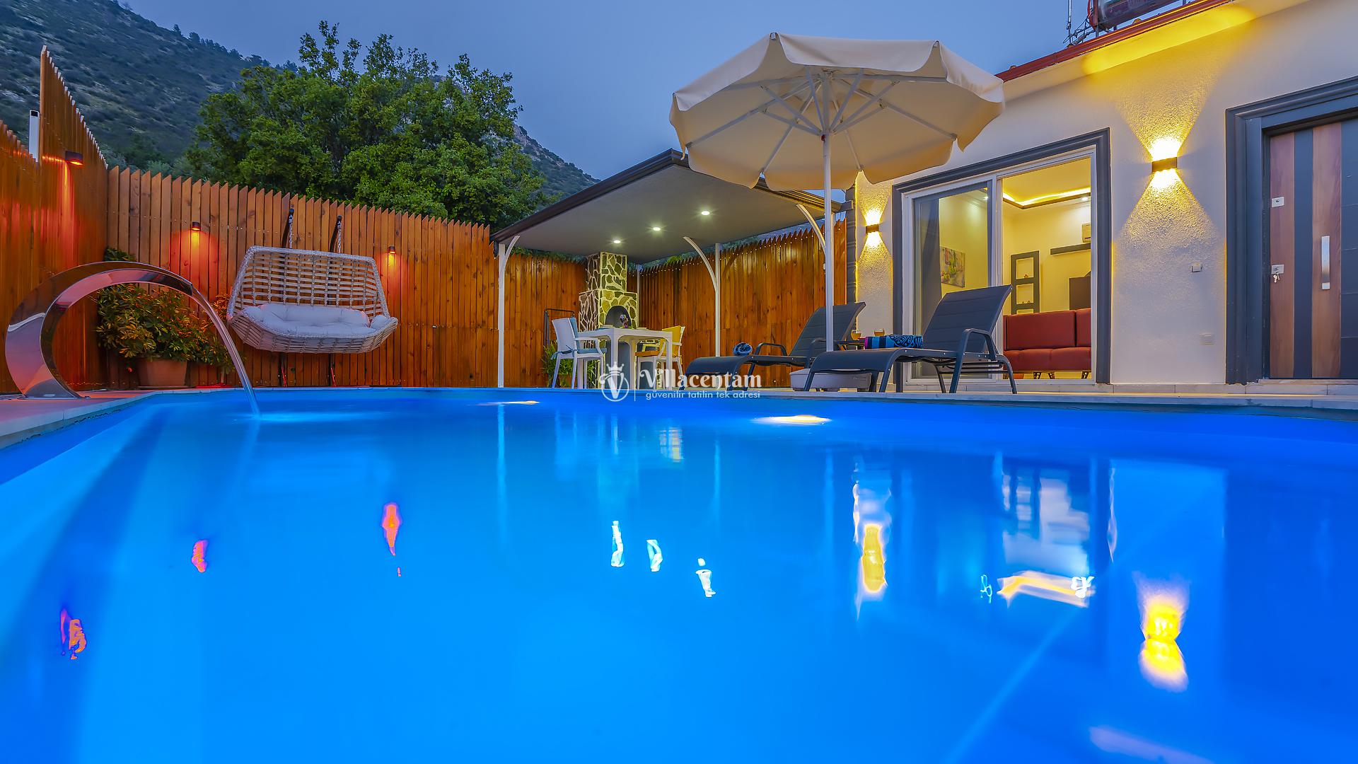 Villa Yiğit Üzümlü, Antalya’nın eşsiz tatil beldesi Kalkan’ın doğal güzellikleriyle öne çıkan Üzümlü mevkiinde konumlanan, özel havuzlu ve romantik tatil imkânı sunan zarif bir villadır. Sadece 1 yatak odası ve 2 kişilik konaklama kapasitesi ile özellikle balayı çiftleri ve huzurlu, mahremiyete önem veren tatil arayanlar için tasarlanmıştır. Villanın iç mekânı şık ve modern detaylarla döşenmiş olup, rahat salonu ve tam donanımlı mutfak bölümü günlük konforunuzu karşılar. Yatak odasında bulunan jakuzi ve sauna ile tatilinize ekstra keyif katarken, dış mekânda yer alan korunaklı özel yüzme havuzu çevresinde şezlonglar, barbekü alanı ve oturma grupları ile dinlenme ve eğlence alanı sunar. Üzümlü’nün yüksek konumu sayesinde doğanın temiz havasını soluyabilir, kuş sesleri ve yeşilin içinde sessiz bir tatilin tadını çıkarabilirsiniz; aynı zamanda denize ve Kalkan merkezine de kolay erişim imkânı bulabilirsiniz. Gözlerden uzak, romantik ve konforlu bir tatil isteyen misafirler için Villa Yiğit Üzümlü, unutulmaz bir villa tatili fırsatı sunar.