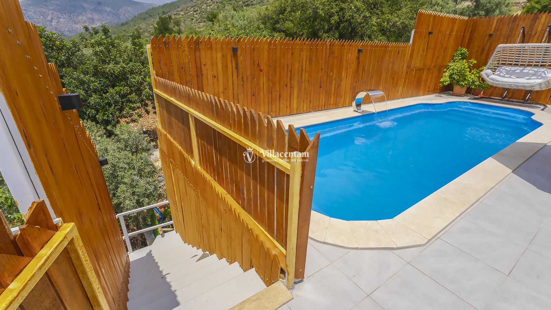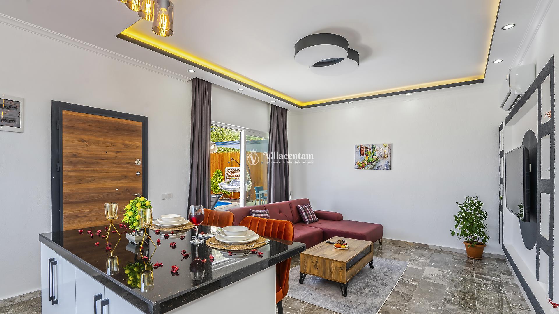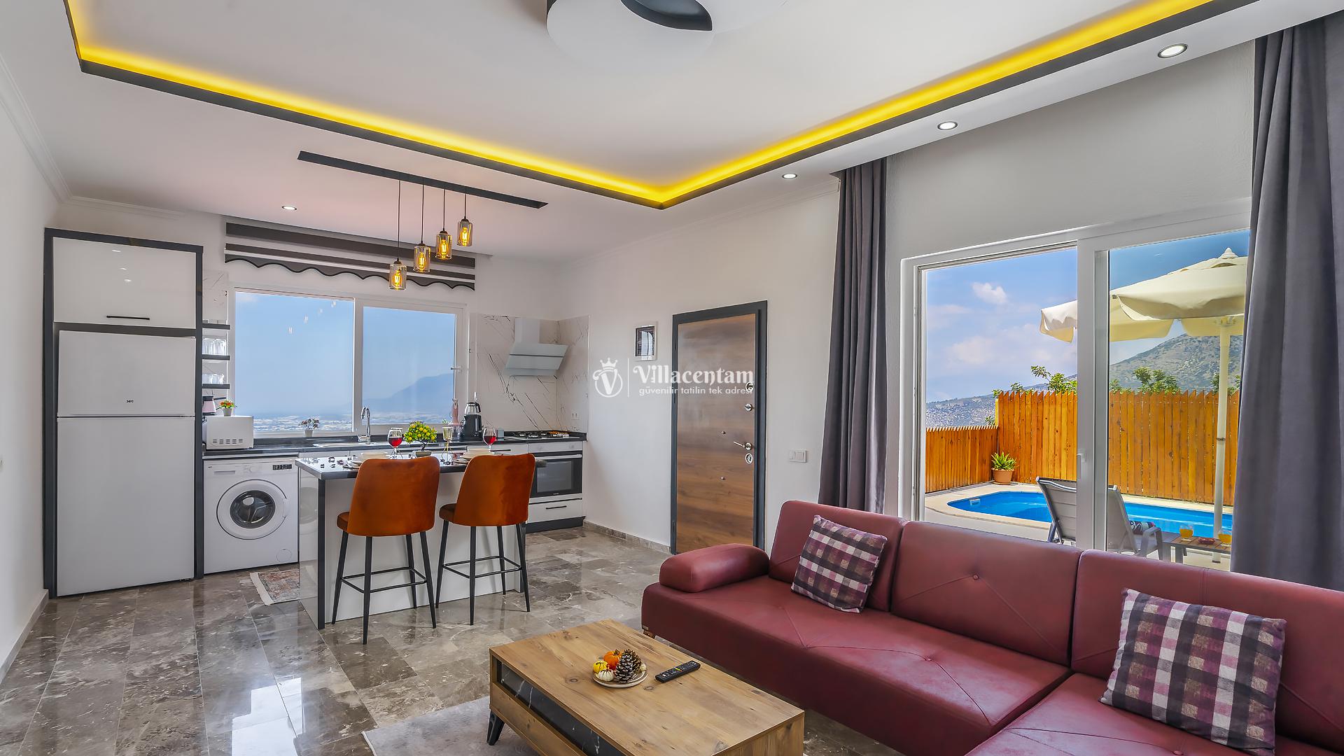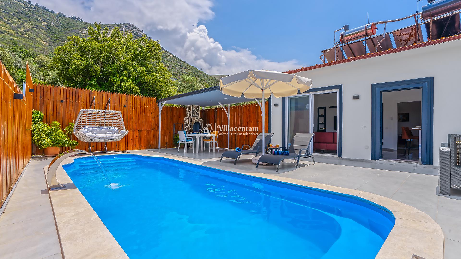 Villa Yiğit Üzümlü, Antalya’nın eşsiz tatil beldesi Kalkan’ın doğal güzellikleriyle öne çıkan Üzümlü mevkiinde konumlanan, özel havuzlu ve romantik tatil imkânı sunan zarif bir villadır. Sadece 1 yatak odası ve 2 kişilik konaklama kapasitesi ile özellikle balayı çiftleri ve huzurlu, mahremiyete önem veren tatil arayanlar için tasarlanmıştır. Villanın iç mekânı şık ve modern detaylarla döşenmiş olup, rahat salonu ve tam donanımlı mutfak bölümü günlük konforunuzu karşılar. Yatak odasında bulunan jakuzi ve sauna ile tatilinize ekstra keyif katarken, dış mekânda yer alan korunaklı özel yüzme havuzu çevresinde şezlonglar, barbekü alanı ve oturma grupları ile dinlenme ve eğlence alanı sunar. Üzümlü’nün yüksek konumu sayesinde doğanın temiz havasını soluyabilir, kuş sesleri ve yeşilin içinde sessiz bir tatilin tadını çıkarabilirsiniz; aynı zamanda denize ve Kalkan merkezine de kolay erişim imkânı bulabilirsiniz. Gözlerden uzak, romantik ve konforlu bir tatil isteyen misafirler için Villa Yiğit Üzümlü, unutulmaz bir villa tatili fırsatı sunar.