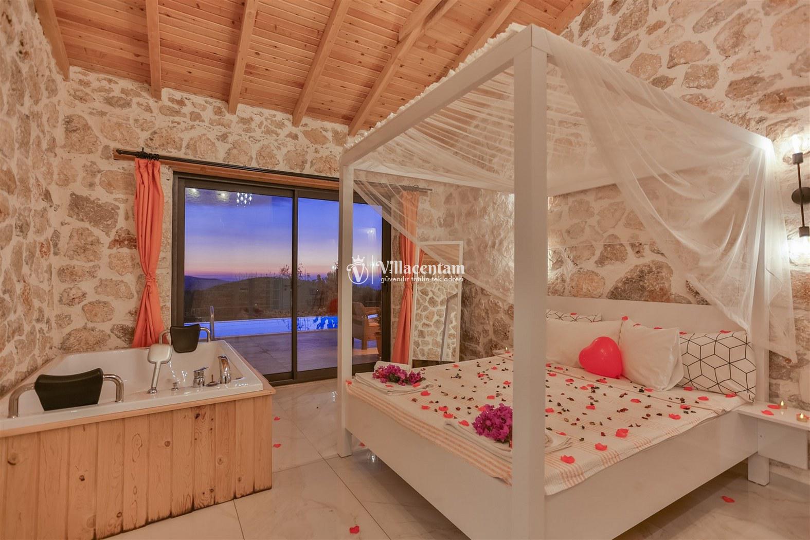 Villa Yaman, Kalkan Üzümlü köyünde konumlanmakta olan, yeşilliklerin arasında doğa manzaralı kiralık bir villadır. Modern ve konforlu bir şekilde dizayn edilen yazlık villamızda 1 adet yatak odası bulunmakta olup, 2 kişiye konaklama imkanı sağlamaktadır. Yatak odasının içerisinde tüm yorgunluğunuzu atabileceğiniz jakuzi yer almaktadır. Özellikle balayı çiftlerimize hitap eden yazlık villamızın havuz ve havuz terası korunaklı hale getirilmiştir. Kiralık villamız dışarıdan gözükmemektedir. Muhafazakar çiftlerimiz de gönül rahatlığı ile tercih edebilirler. Sessizlik ve sakinlik içerisinde huzur dolu bir balayı tatili için Villa Yudum’ u tercih edebilirsiniz.